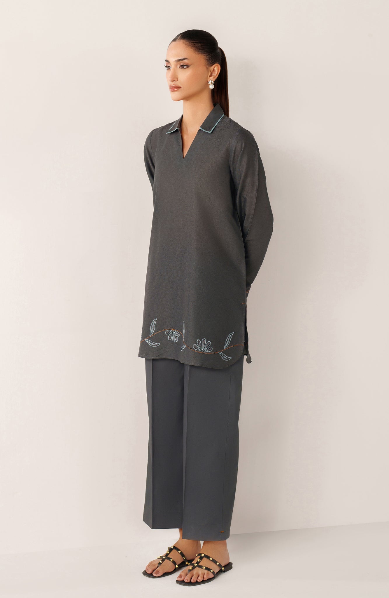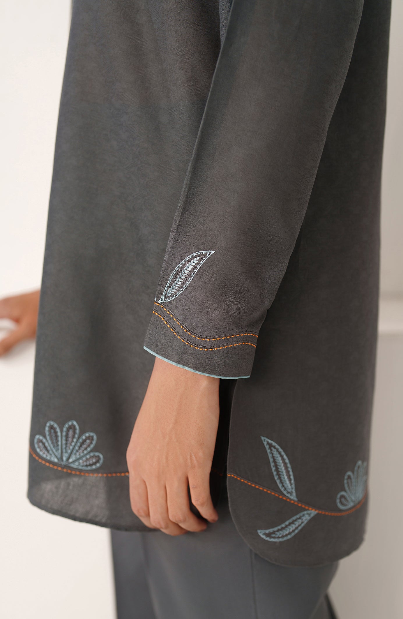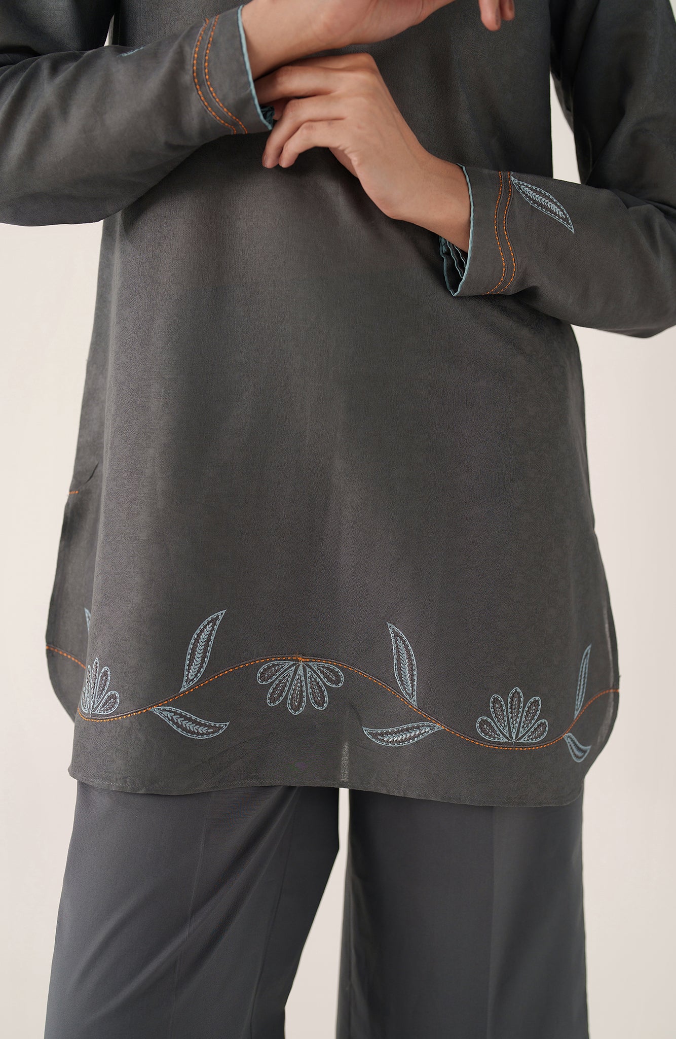 Crafted in breathable cotton jacquard, Zea is designed for effortless summer dressing in a refined slate-grey tone. The shirt features subtle woven texture throughout, elevated with delicate powder-blue embroidery along the hem and sleeves, traced softly with fine rust accents for contrast. A minimal collared neckline with light blue piping adds a contemporary edge. Paired with straight cotton trousers, Zea is made for everyday wear — polished, comfortable, and quietly distinctive.