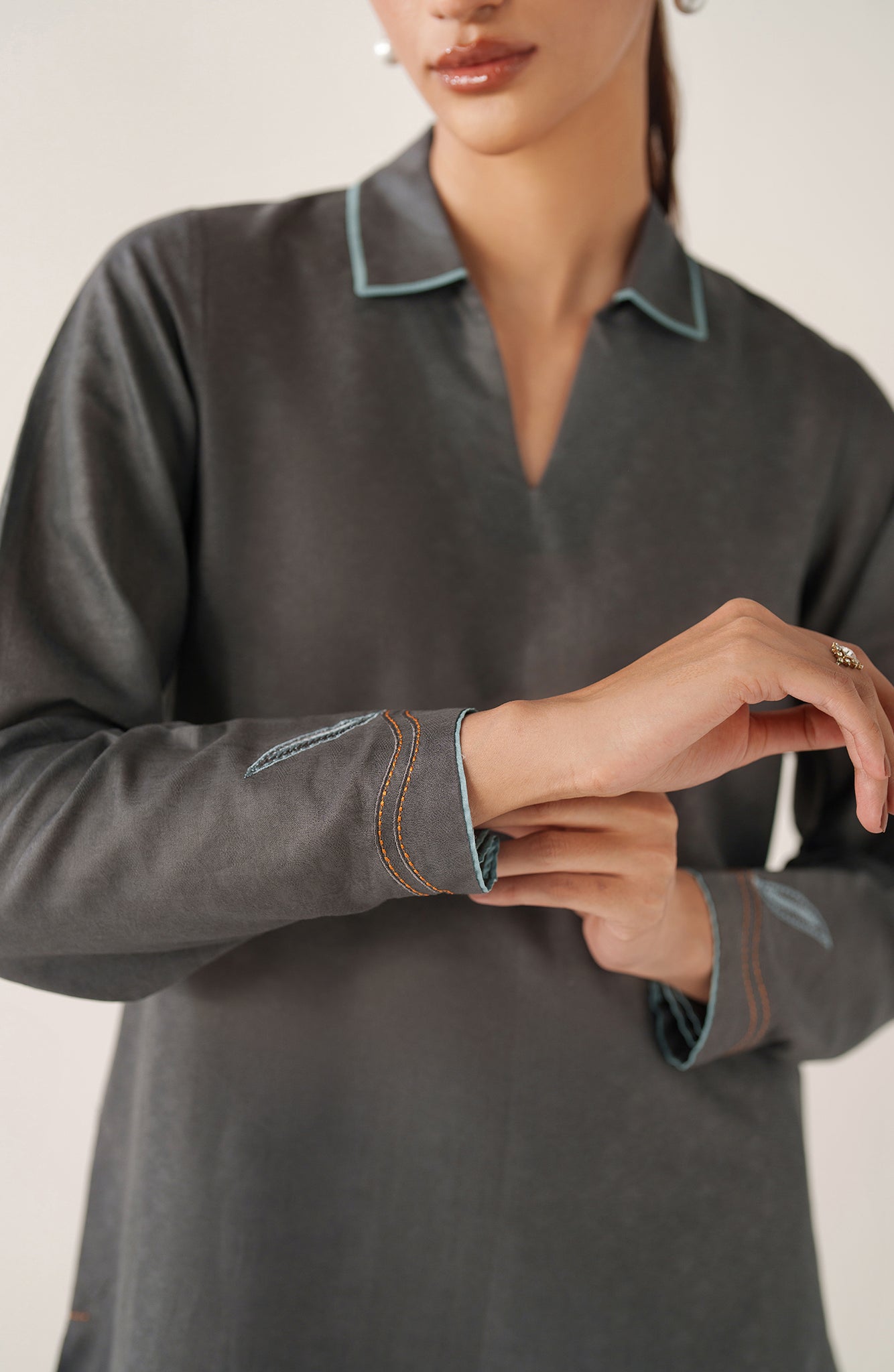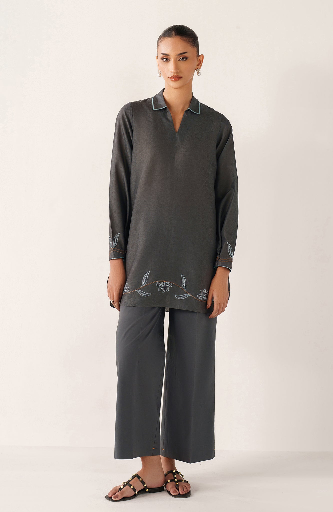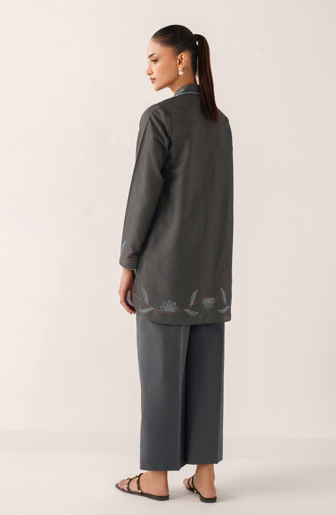 Crafted in breathable cotton jacquard, Zea is designed for effortless summer dressing in a refined slate-grey tone. The shirt features subtle woven texture throughout, elevated with delicate powder-blue embroidery along the hem and sleeves, traced softly with fine rust accents for contrast. A minimal collared neckline with light blue piping adds a contemporary edge. Paired with straight cotton trousers, Zea is made for everyday wear — polished, comfortable, and quietly distinctive.