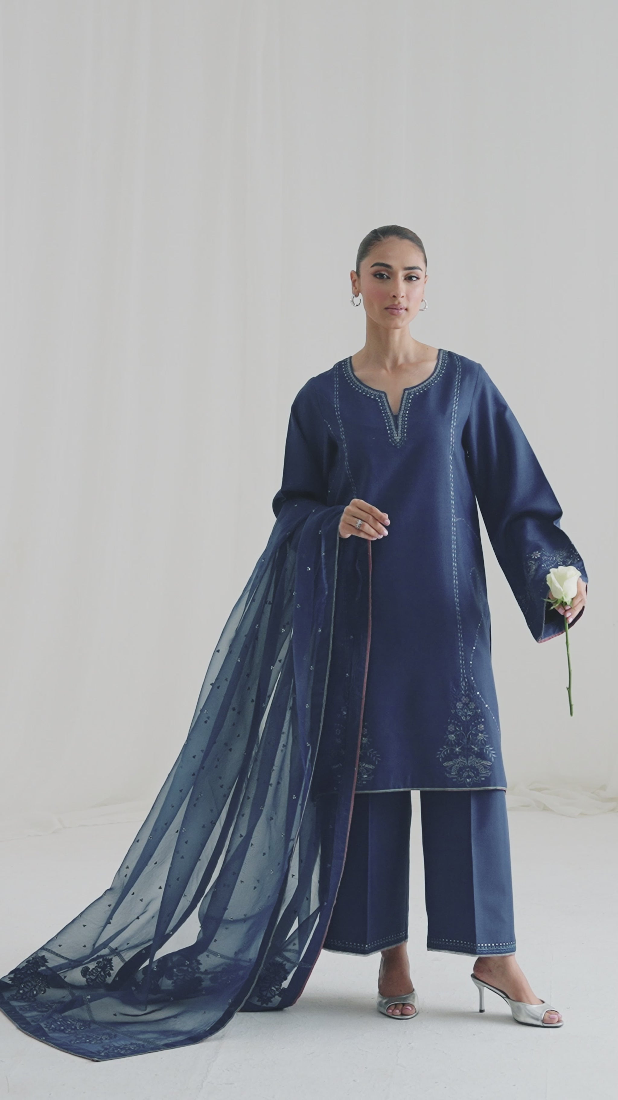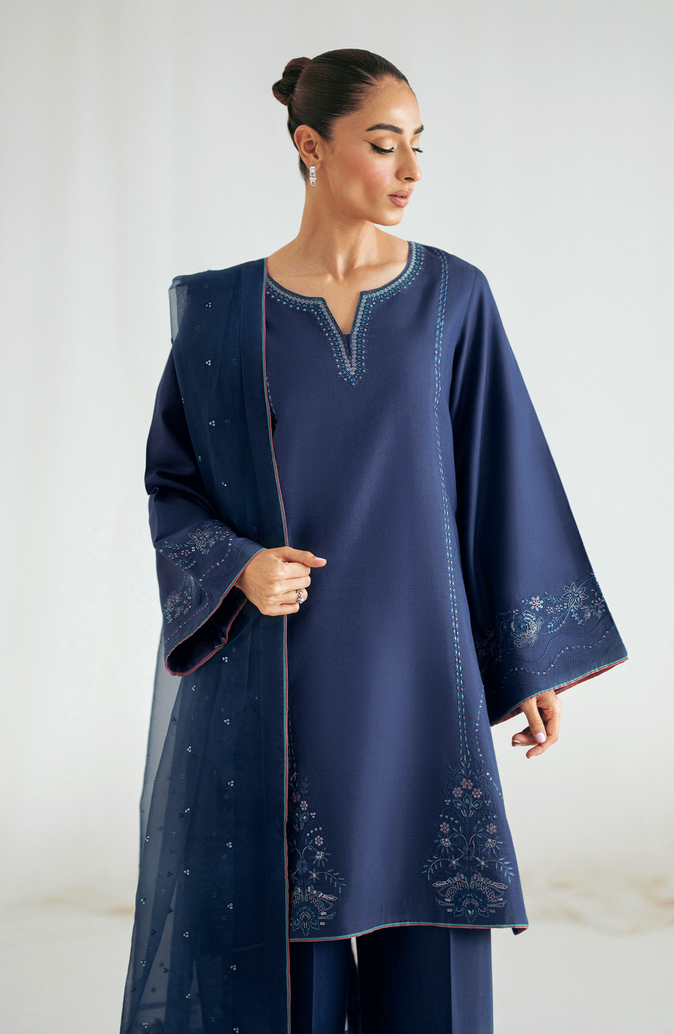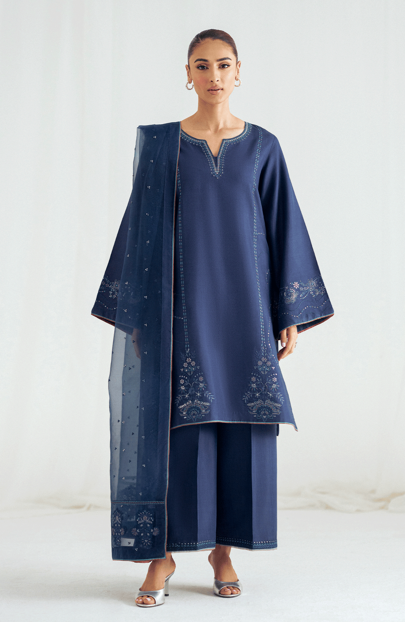 A refined ocean blue straight-cut shirt featuring resham embroidery along the hem and sleeves, accented with mauve-toned floral bunches and delicate neckline detailing. Paired with an embroidered sheer organza dupatta adorned with scattered florals and bordered ends, and wide-leg trousers with clean, tonal detailing. Crafted from soft, breathable fabric, this festive ensemble offers graceful ease from day to evening.