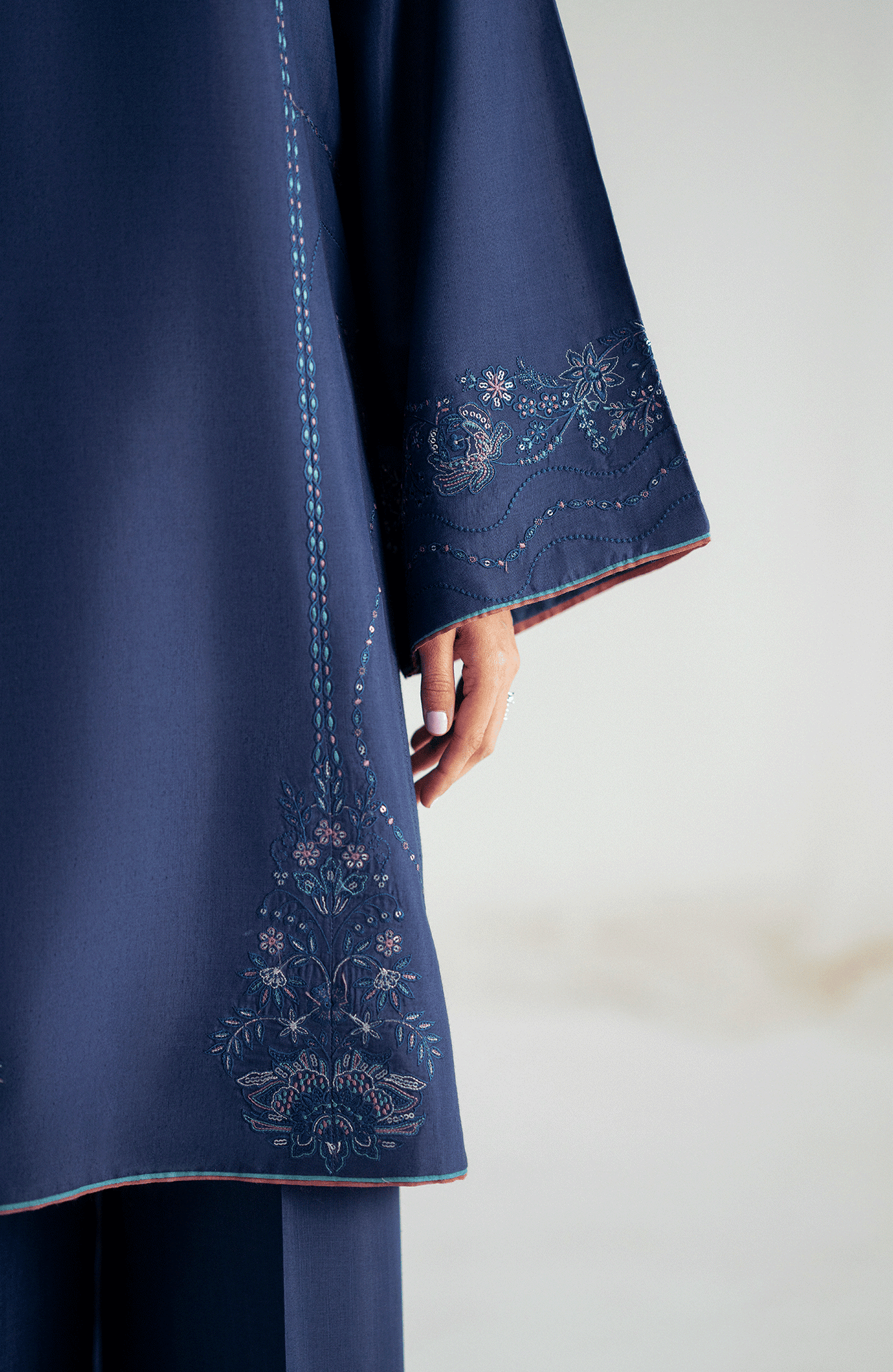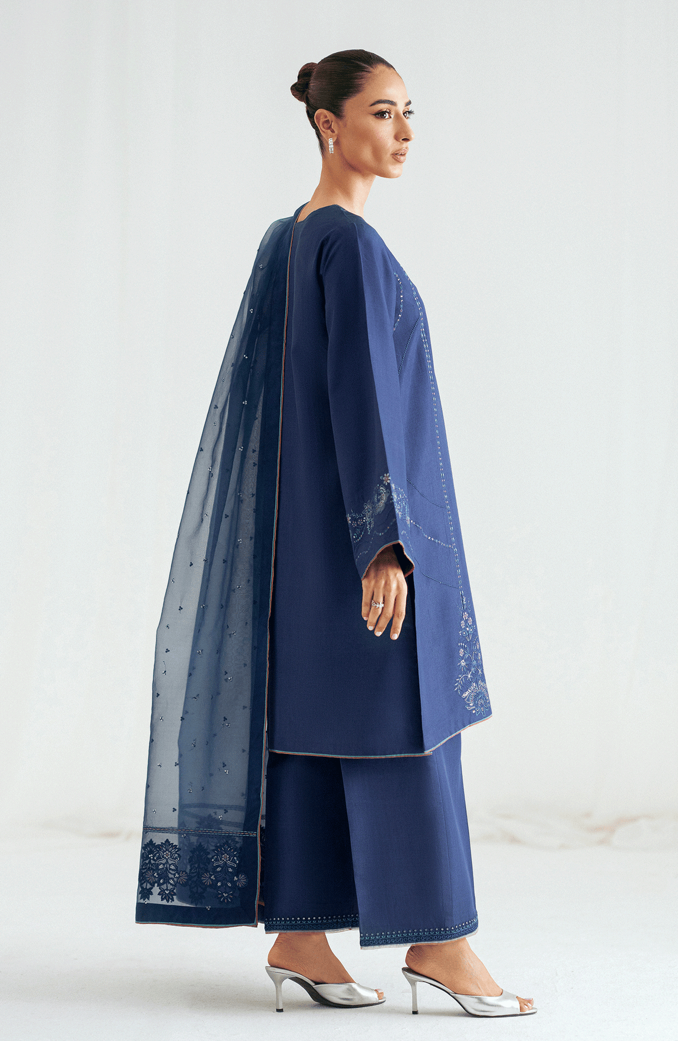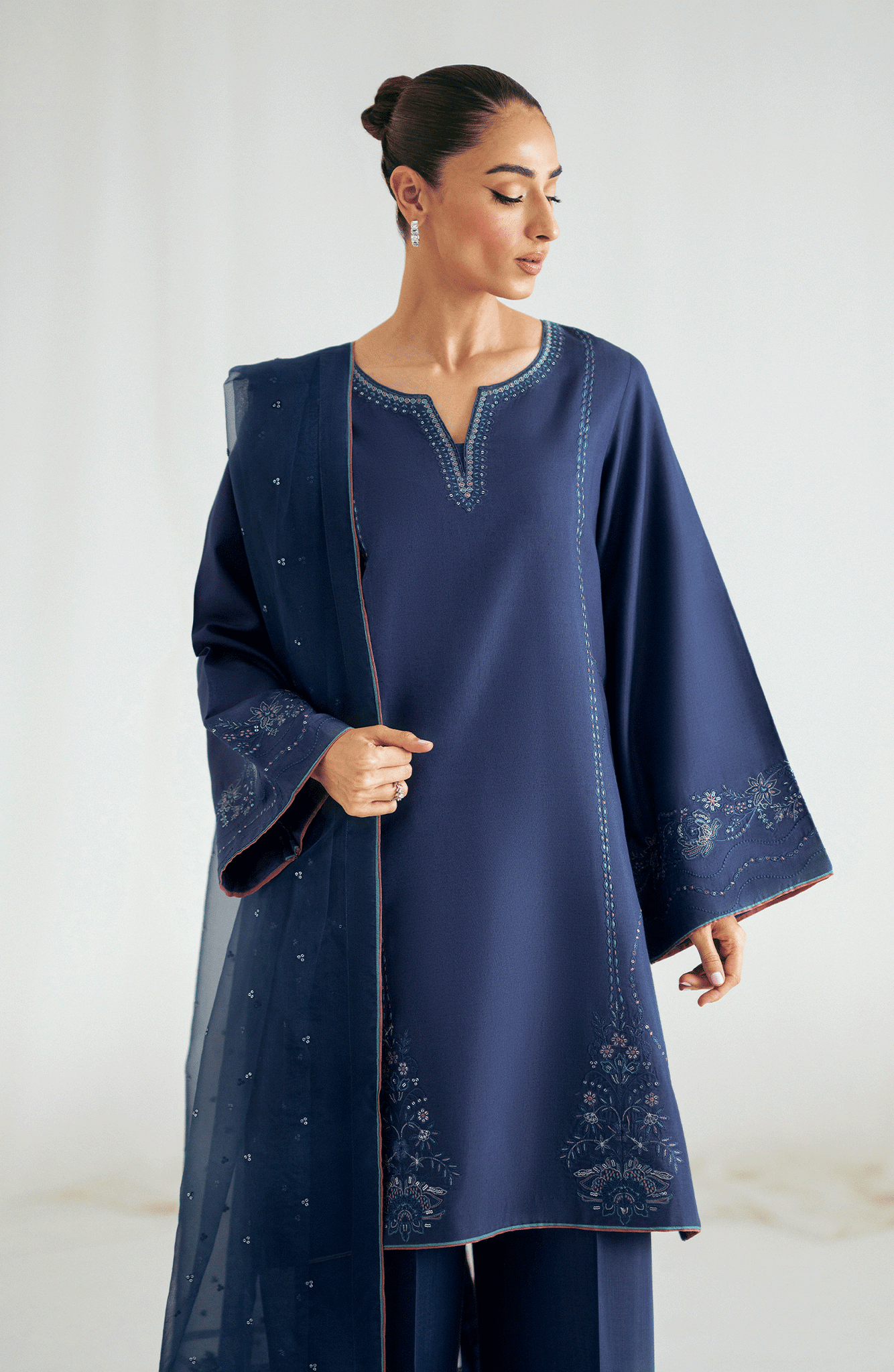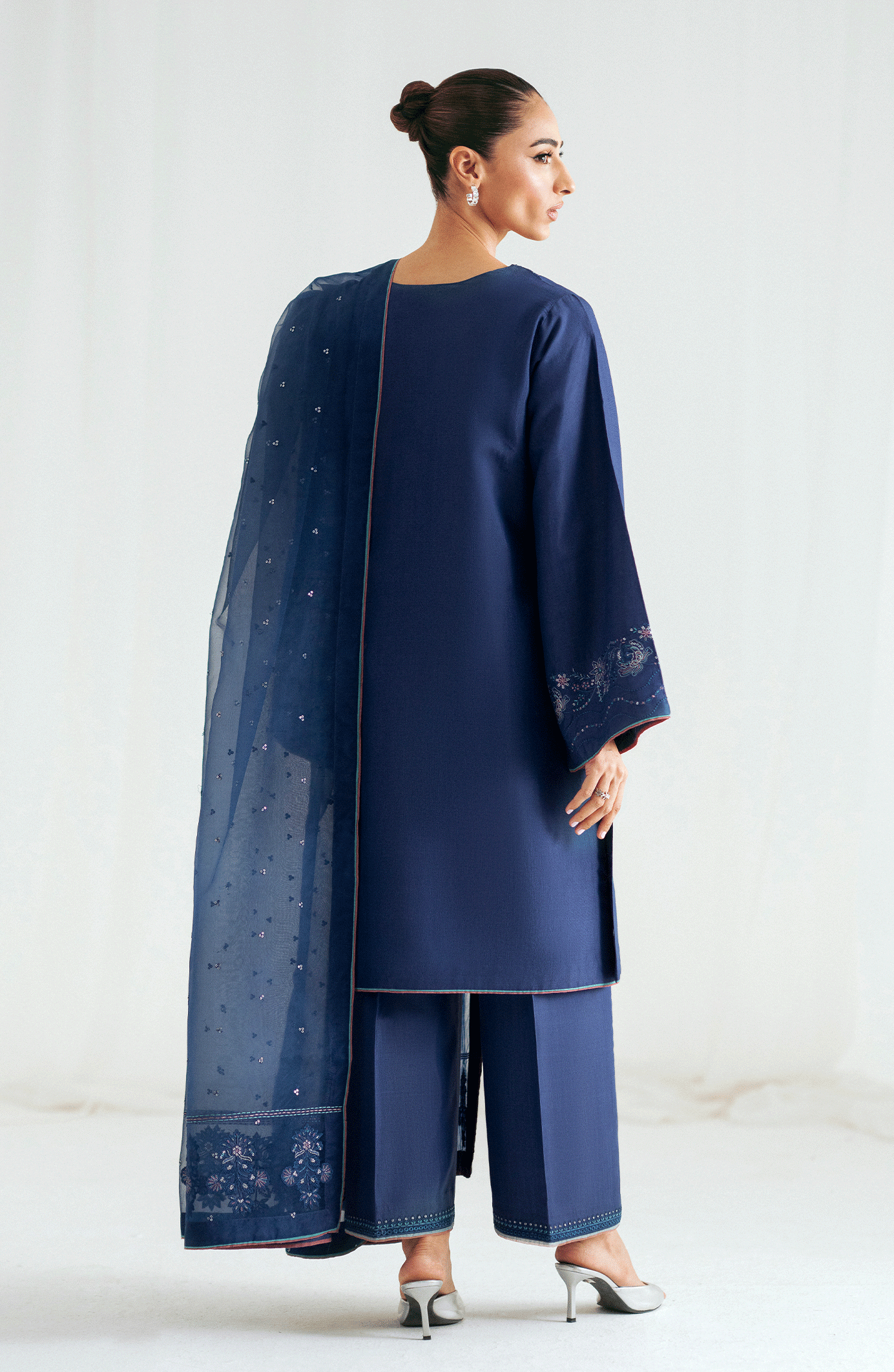A refined ocean blue straight-cut shirt featuring resham embroidery along the hem and sleeves, accented with mauve-toned floral bunches and delicate neckline detailing. Paired with an embroidered sheer organza dupatta adorned with scattered florals and bordered ends, and wide-leg trousers with clean, tonal detailing. Crafted from soft, breathable fabric, this festive ensemble offers graceful ease from day to evening.