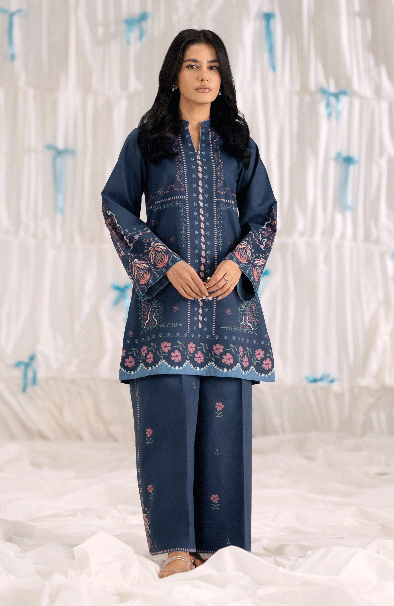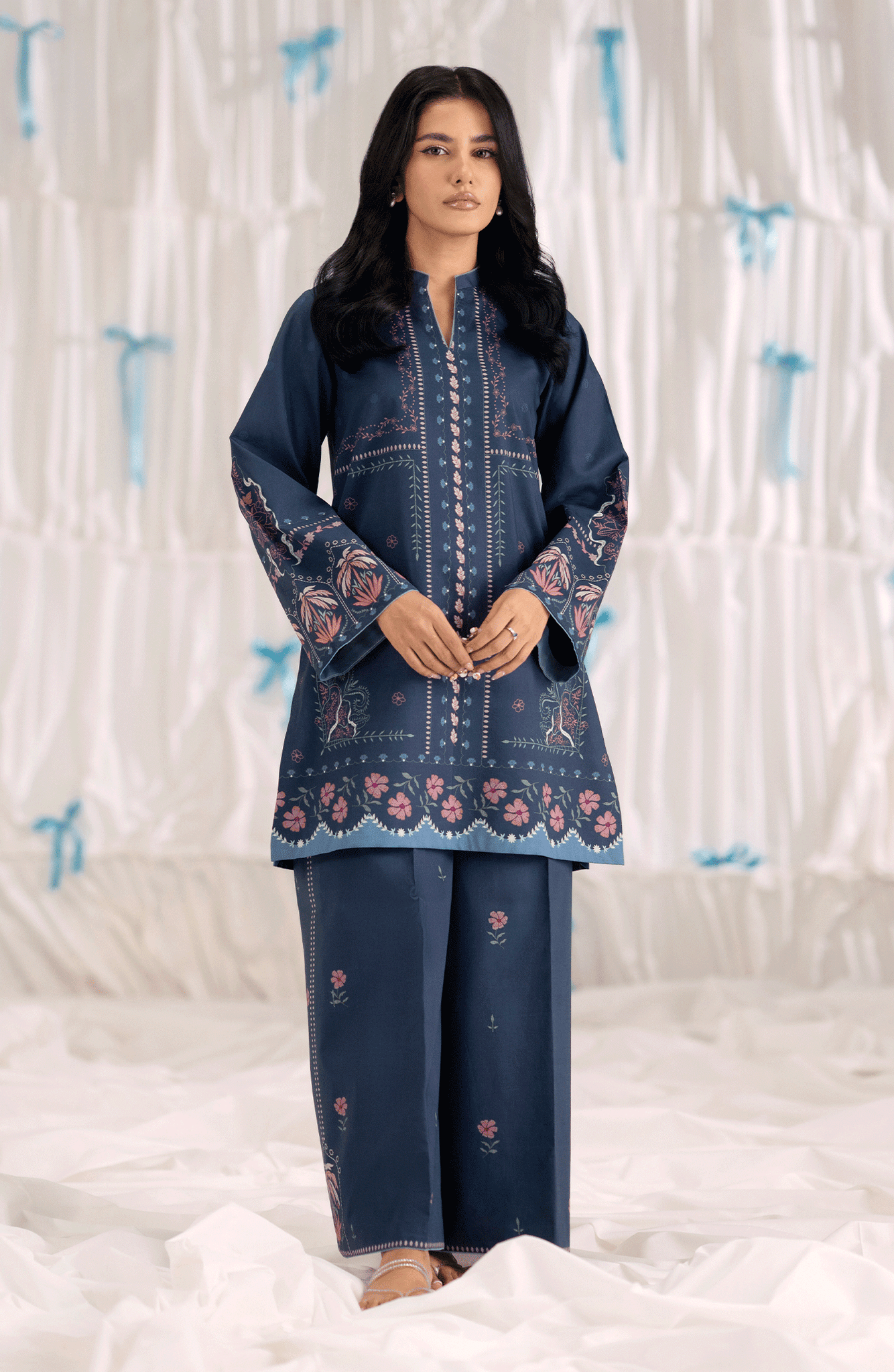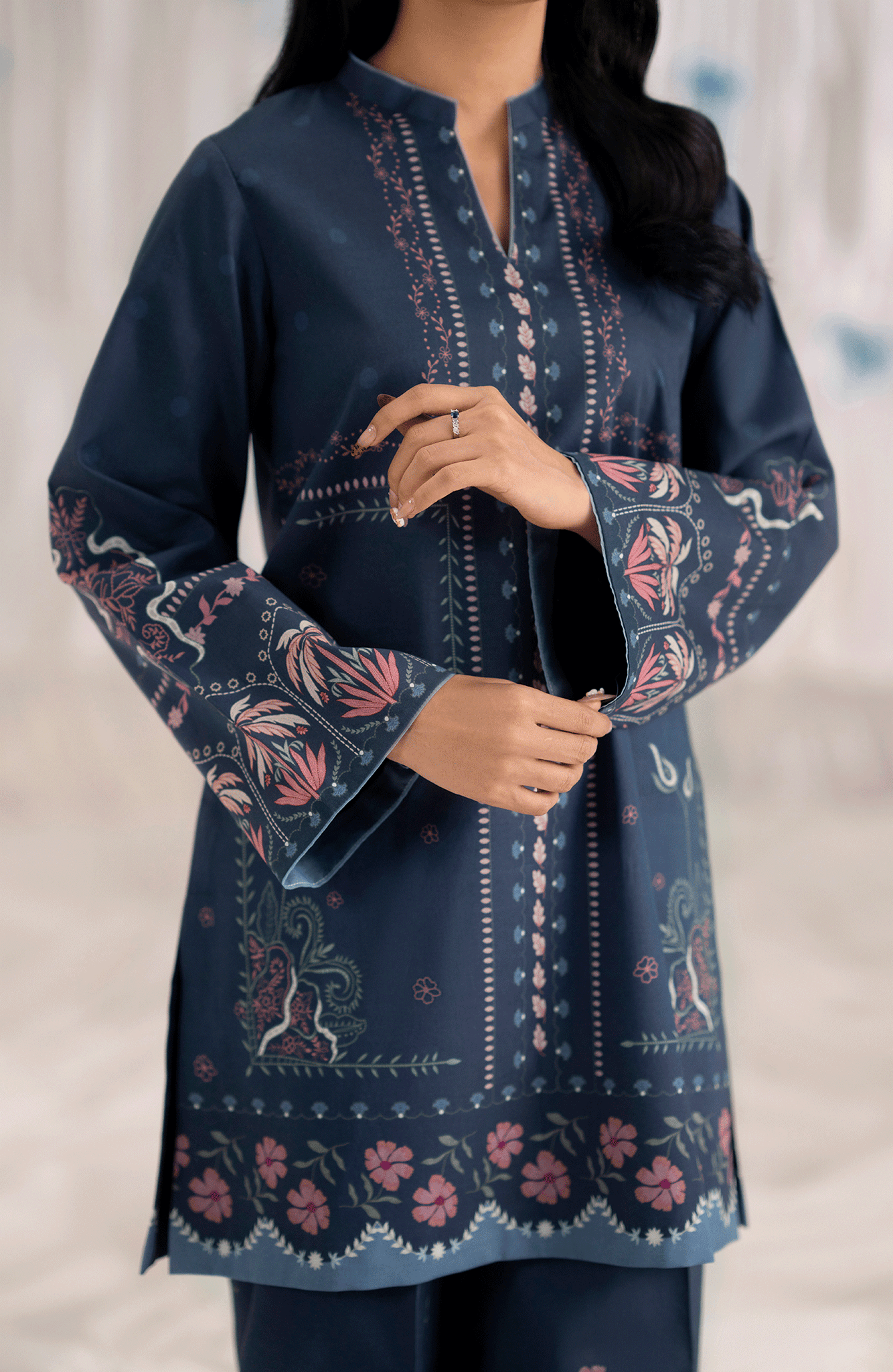 This two-piece set, Mariner, in deep navy blue is tailored from breathable cambric, featuring a straight-cut printed shirt in shades of pink and blue along the neckline, sleeves, and hem. Paired with matching straight wide-leg trousers accented with subtle floral motifs, this outfit offers a perfect balance of comfort and contemporary style— ideal for casual outings or daytime gatherings.