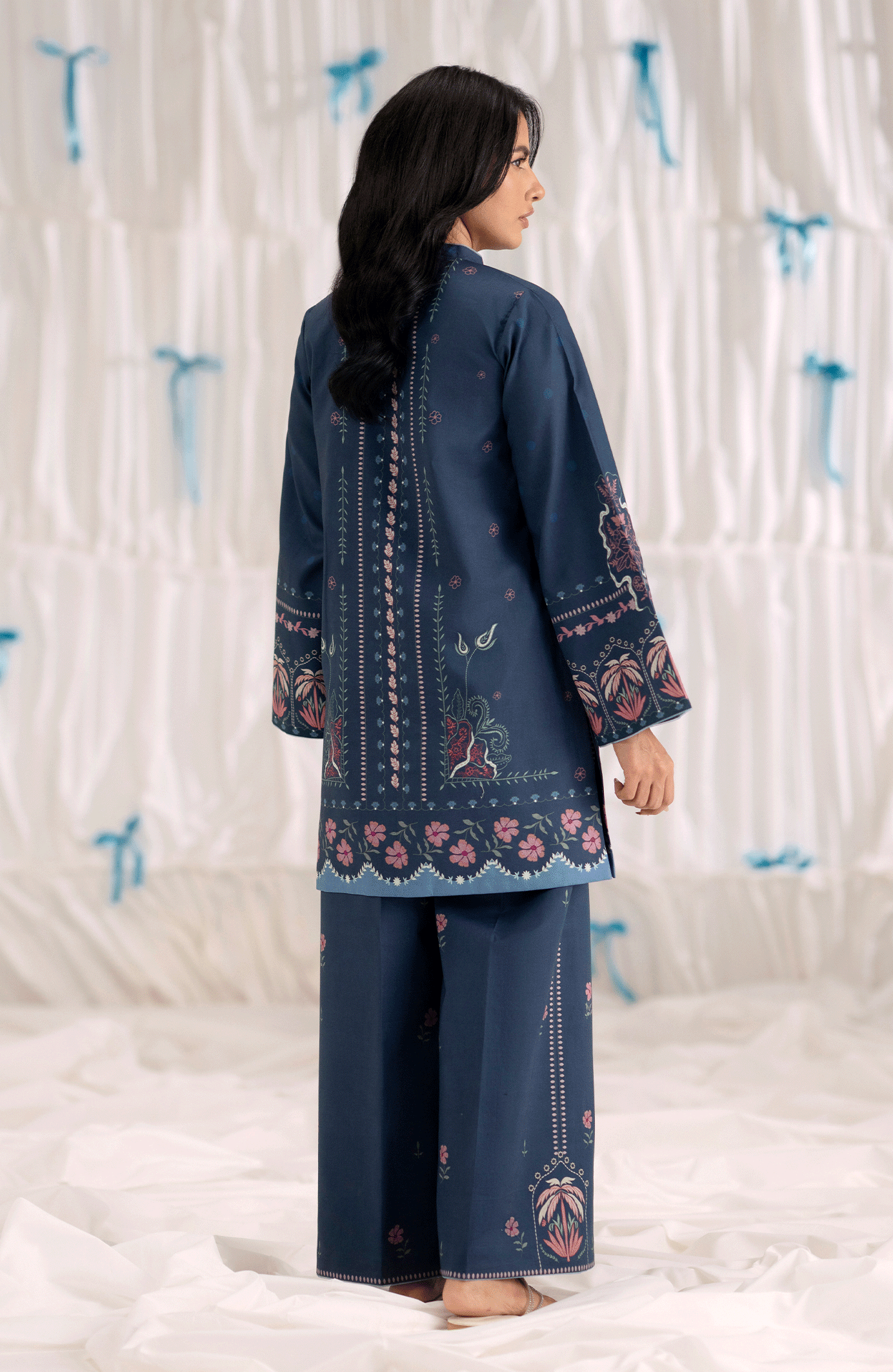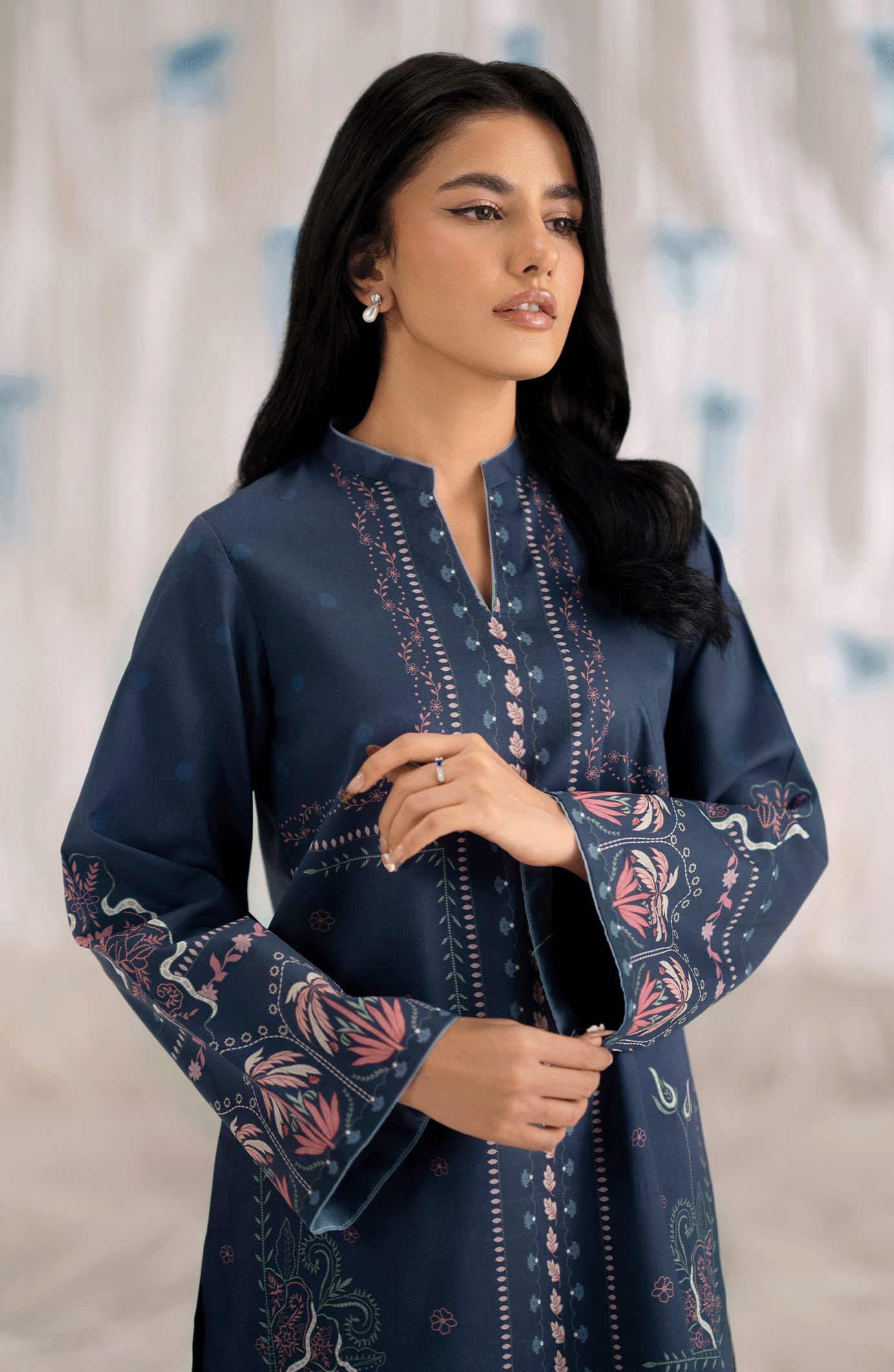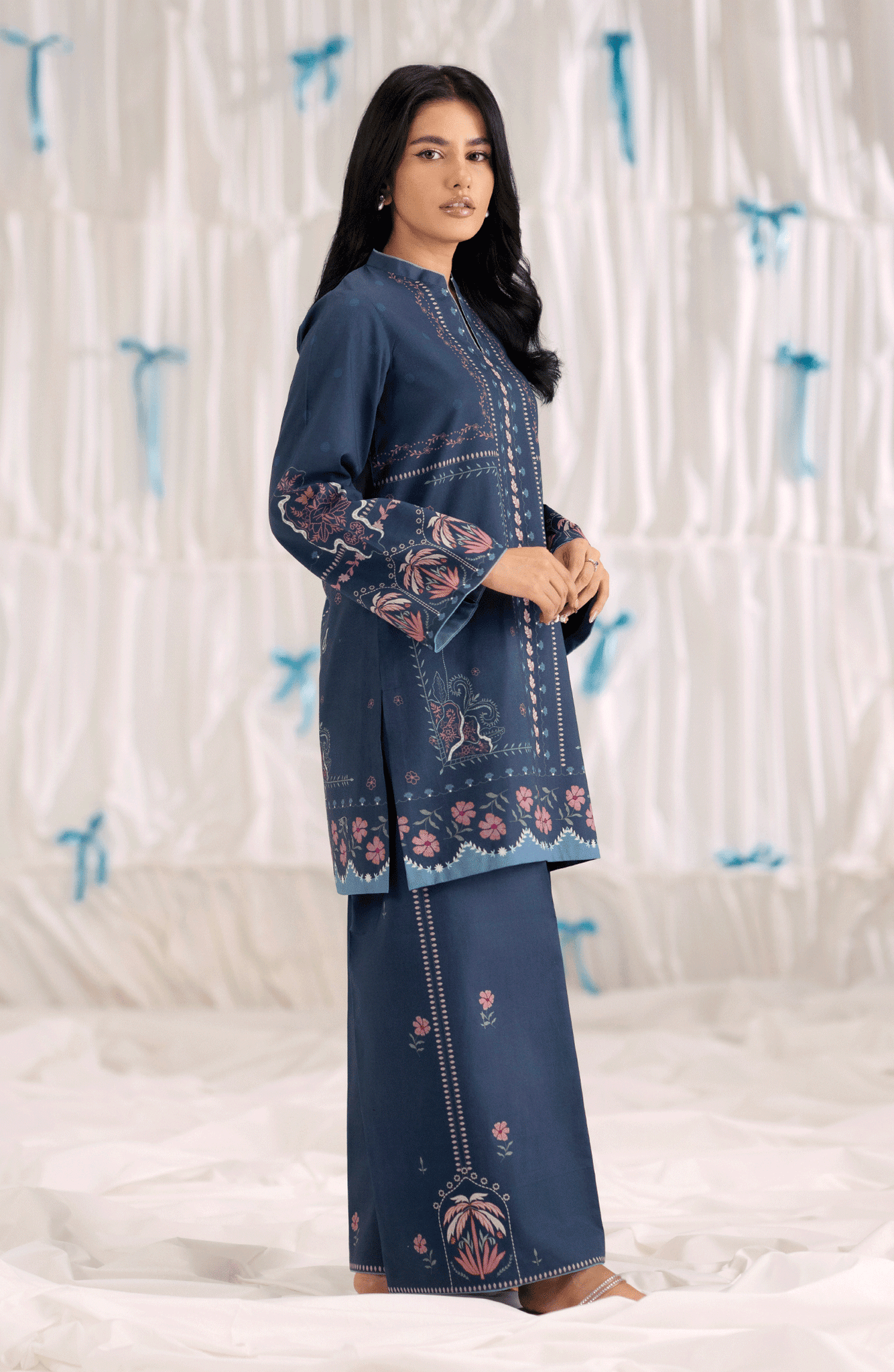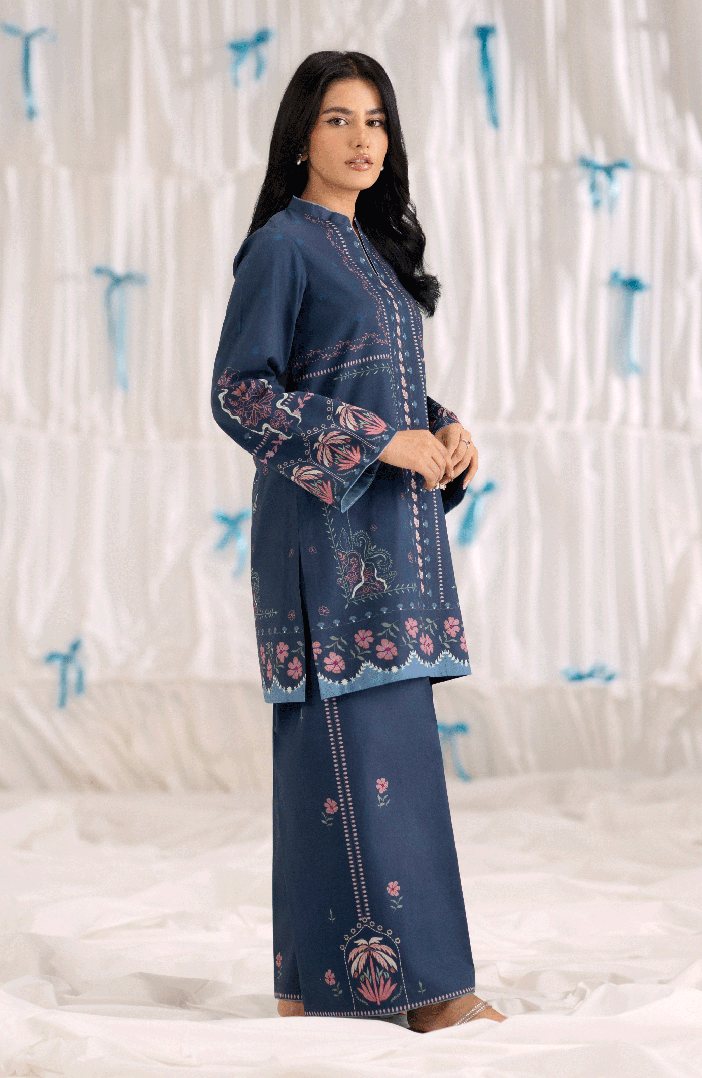 This two-piece set, Mariner, in deep navy blue is tailored from breathable cambric, featuring a straight-cut printed shirt in shades of pink and blue along the neckline, sleeves, and hem. Paired with matching straight wide-leg trousers accented with subtle floral motifs, this outfit offers a perfect balance of comfort and contemporary style— ideal for casual outings or daytime gatherings.