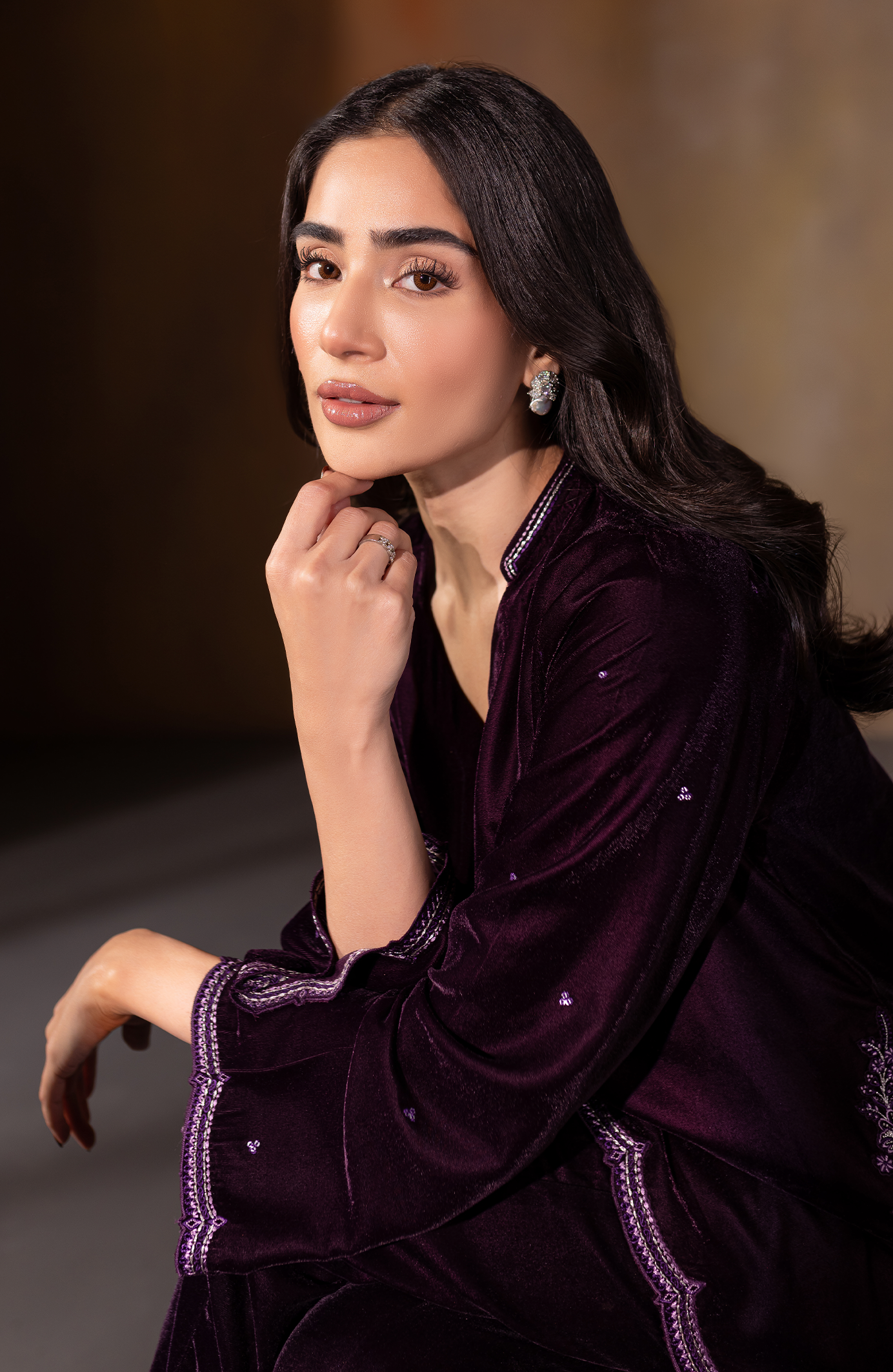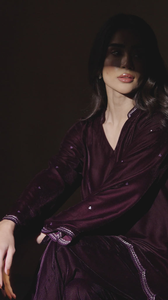 Immerse yourself in the luxurious allure of Purple Haze — a rich purple velvet short shirt with a V-neckline, adorned with delicate scalloped embroidery along the hem and sleeves. The relaxed, flowy cut ensures comfort, while the matching velvet trousers, featuring complementary scalloped detailing at the hem, complete the ensemble with effortless elegance.