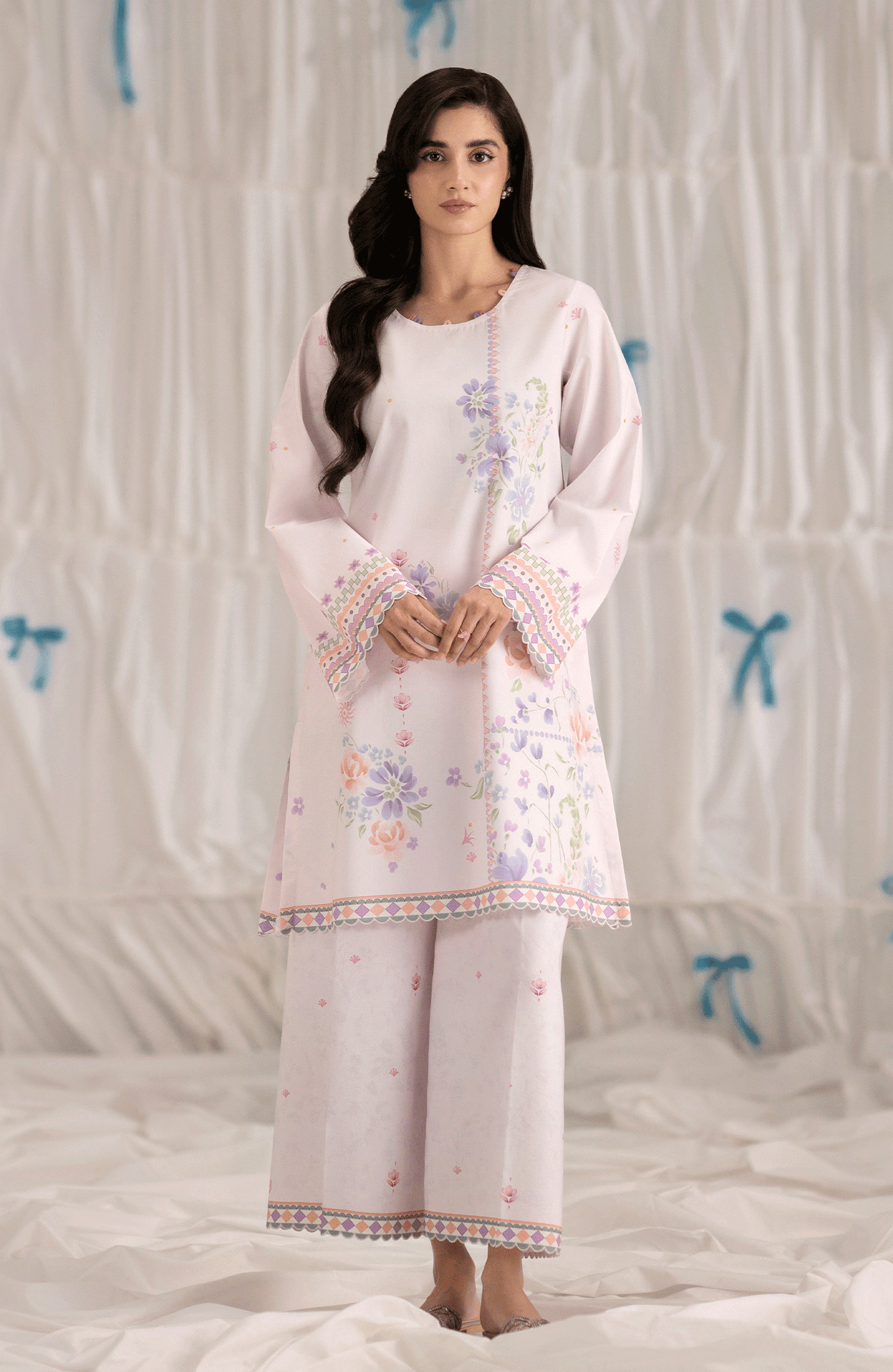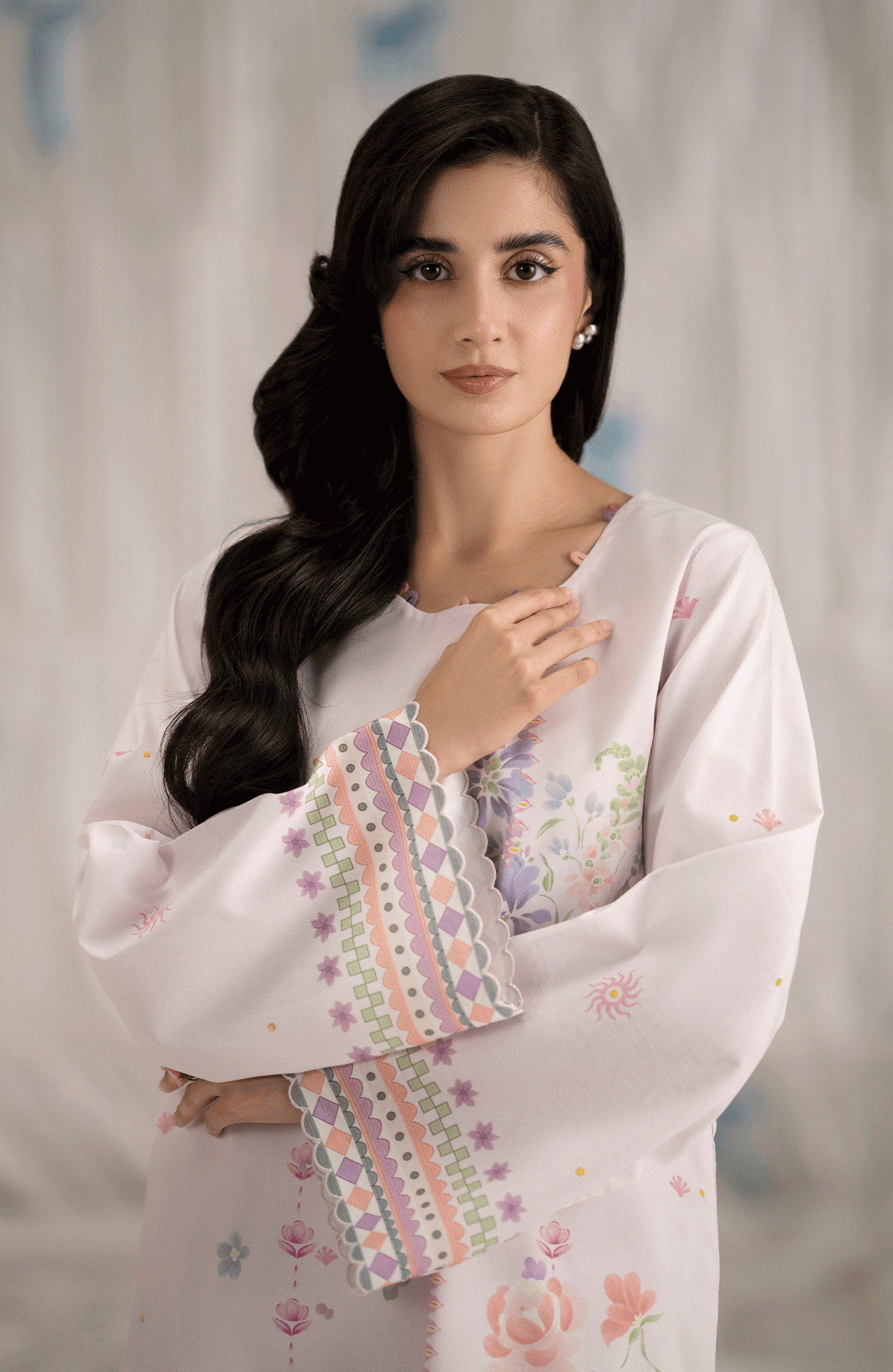 delicate floral prints in purple, blue, and peach. The straight-cut shirt features printed borders on the sleeves and hem and pairs effortlessly with wide-leg trousers, creating a comfortable yet elegant look perfect for everyday wear.