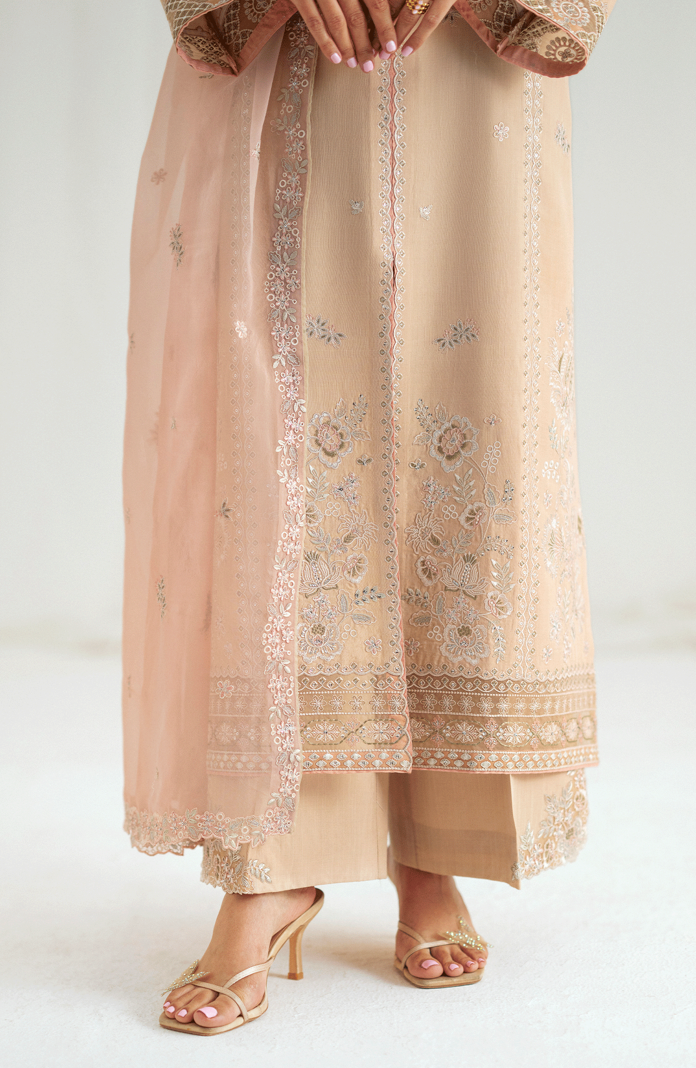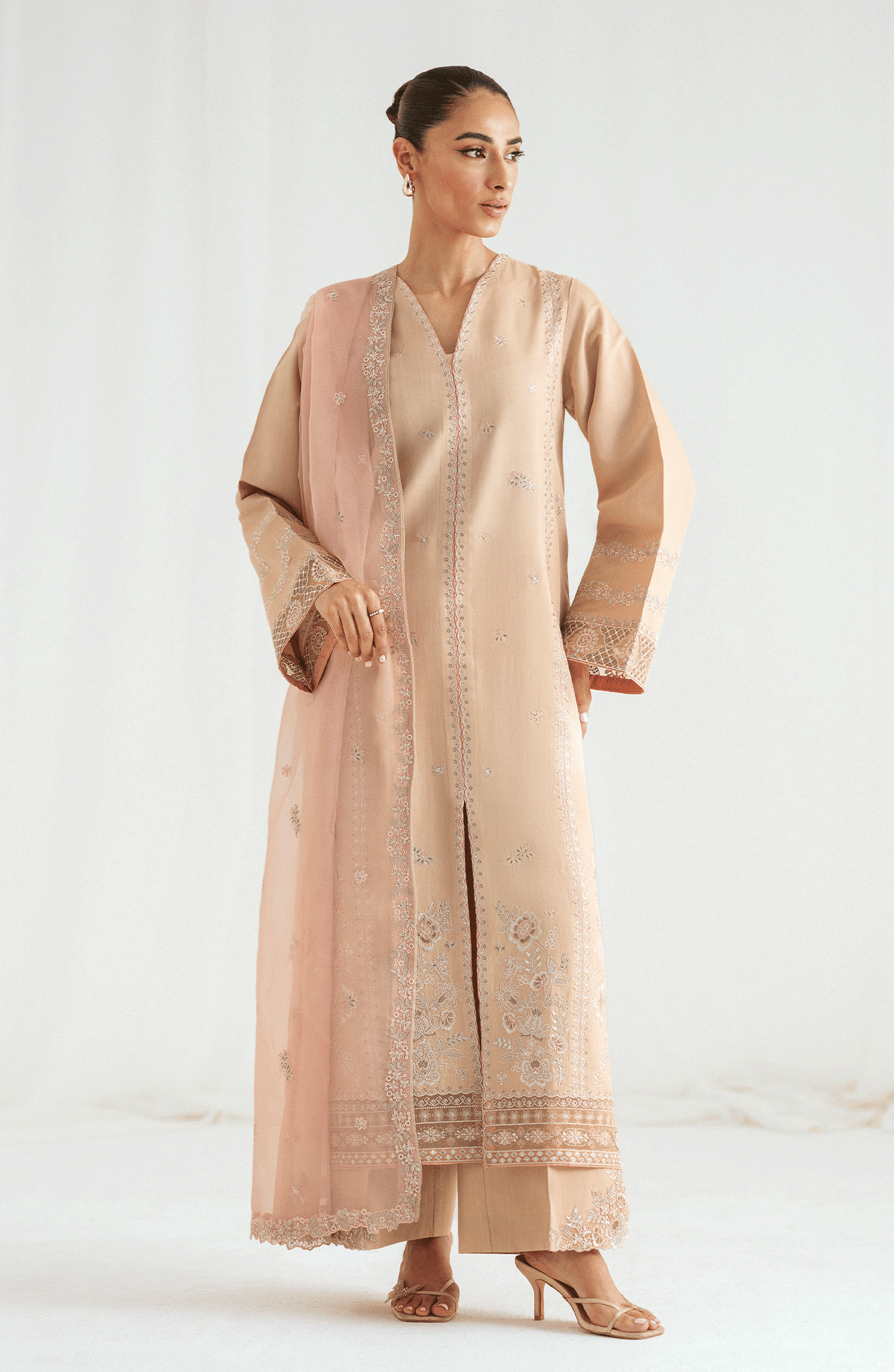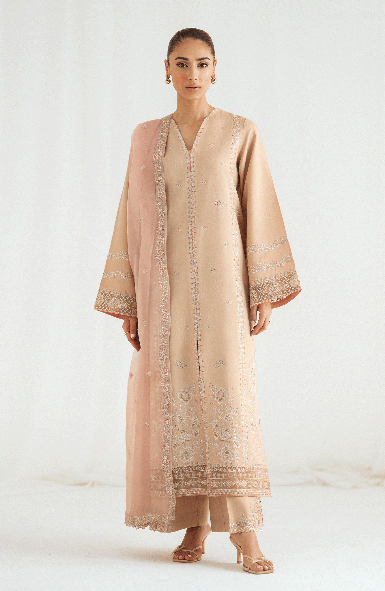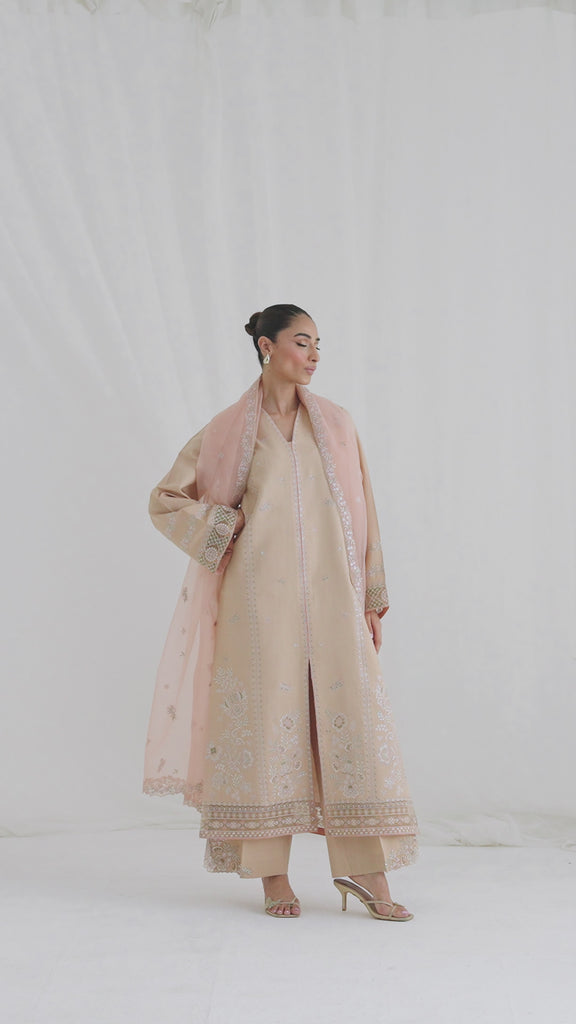 A straight-cut beige shirt adorned with soft pink embroidery on the front, sleeves, and hem, featuring a V-slit neckline for an elongated silhouette. Paired with wide-leg trousers detailed with embroidered borders and a blush pink organza dupatta embellished with floral motifs and lace finishing. This balanced palette is perfect for intimate festivities and day soirées.