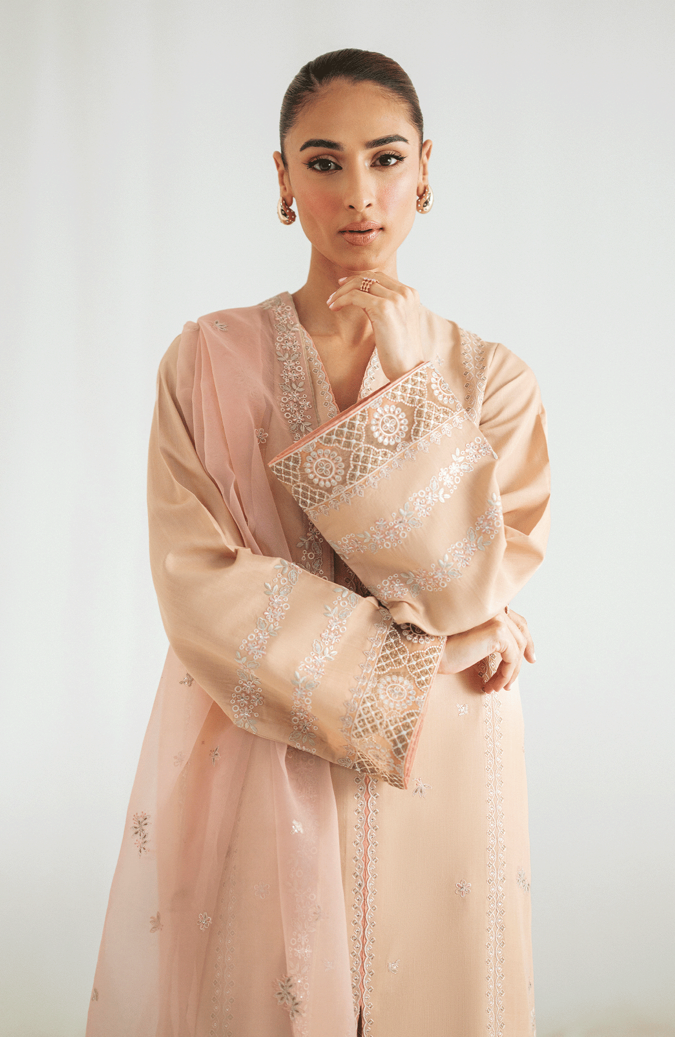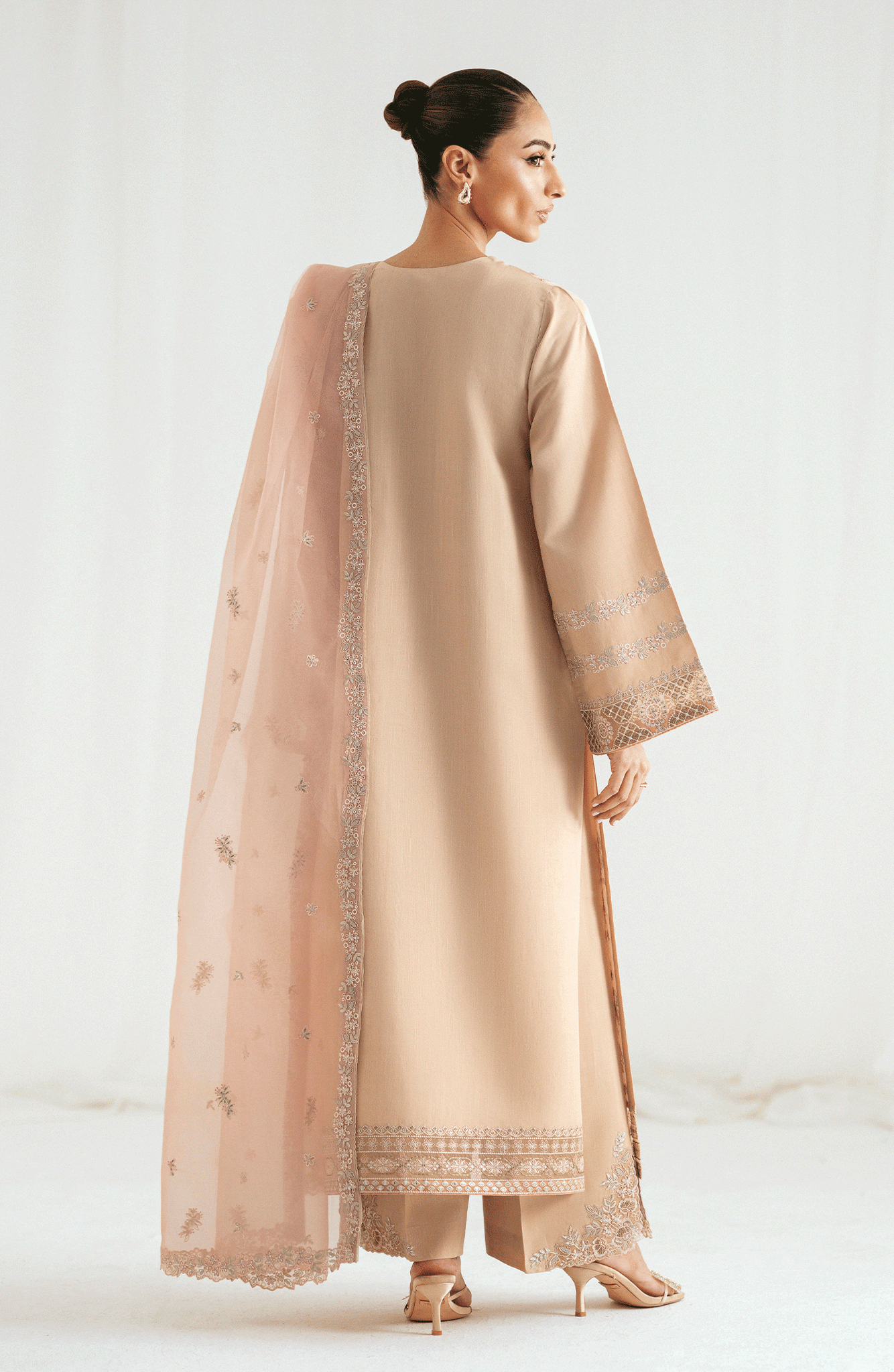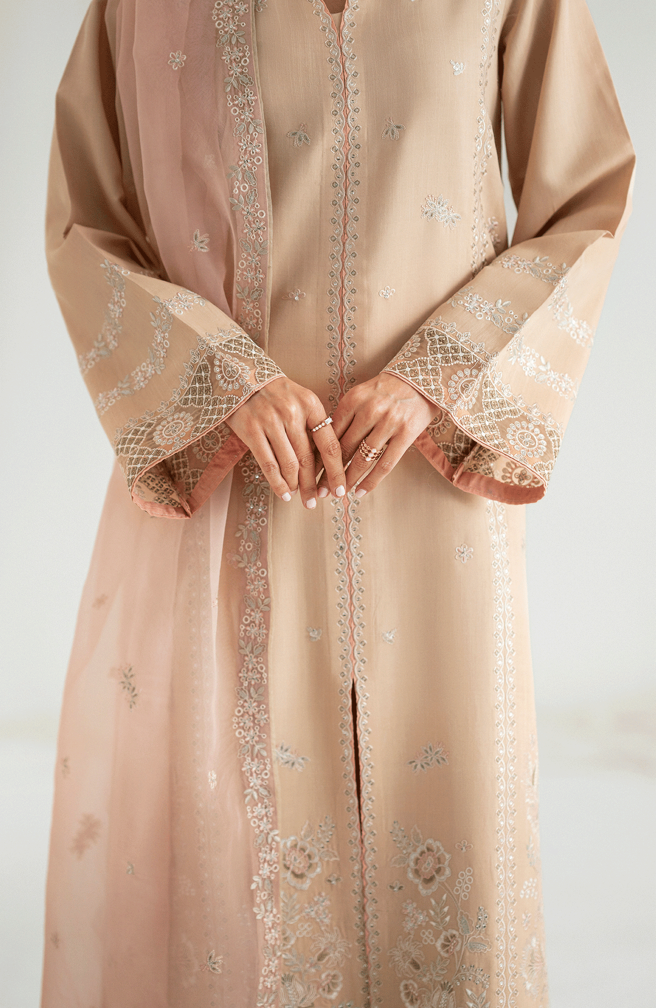 A straight-cut beige shirt adorned with soft pink embroidery on the front, sleeves, and hem, featuring a V-slit neckline for an elongated silhouette. Paired with wide-leg trousers detailed with embroidered borders and a blush pink organza dupatta embellished with floral motifs and lace finishing. This balanced palette is perfect for intimate festivities and day soirées.