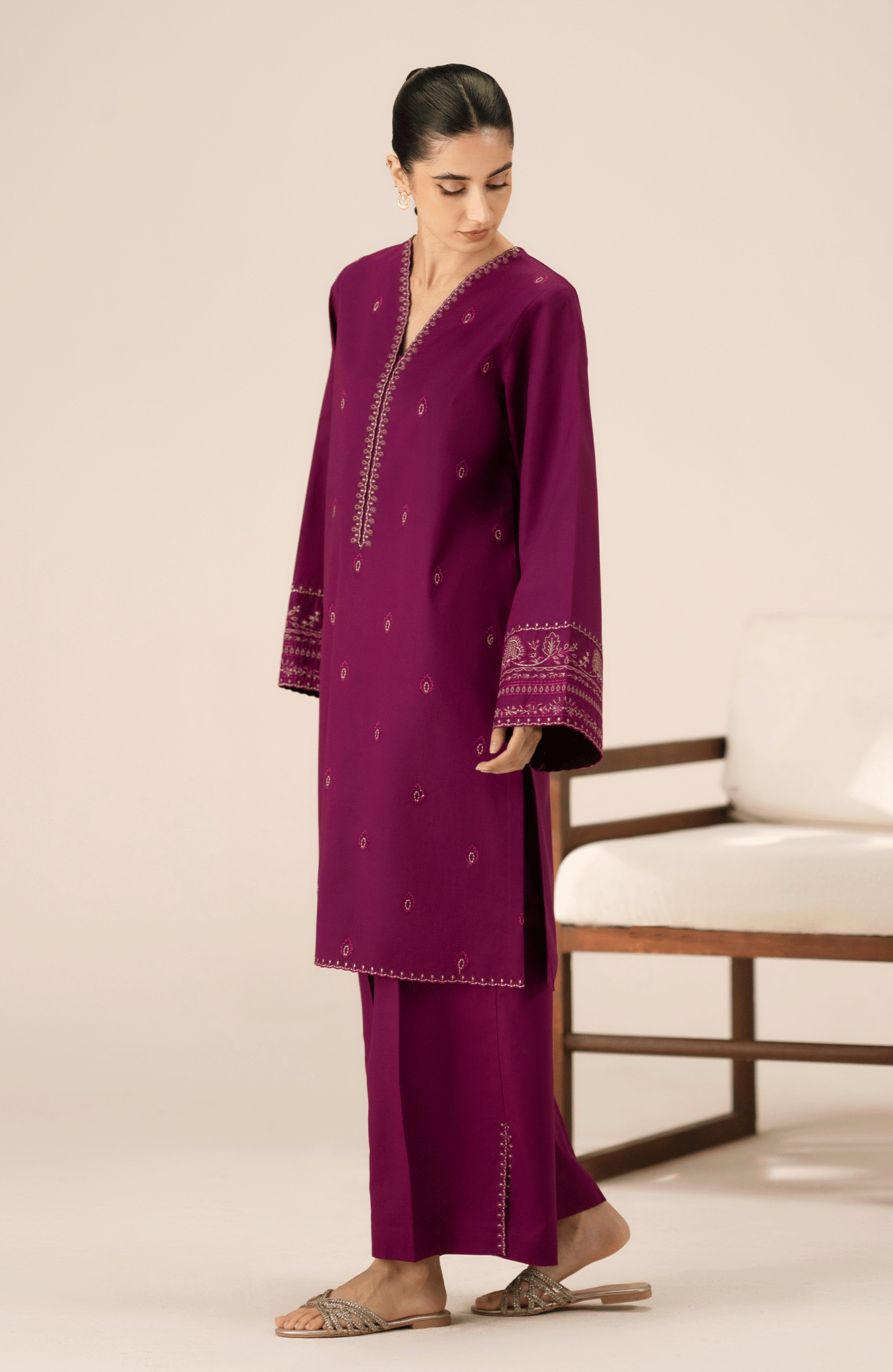 Zenia is a graceful cambric outfit in a rich plum shade, featuring subtle embroidery on the neckline, cuffs, and scattered motifs. Paired with matching straight-cut pants, it combines effortless style and comfort, perfect for everyday wear or casual gatherings.