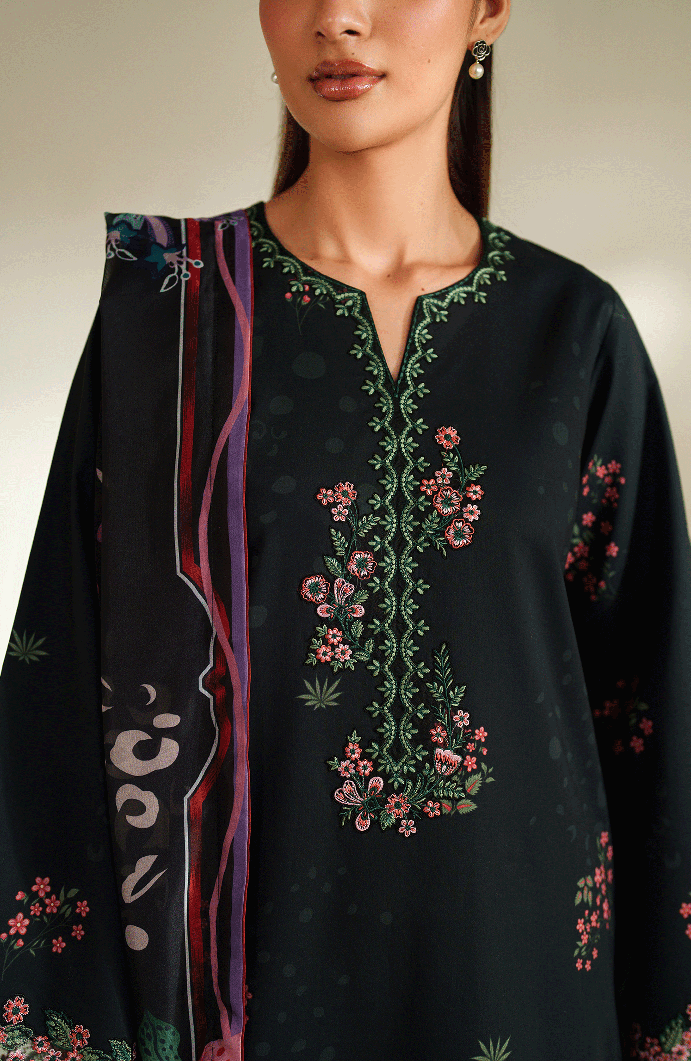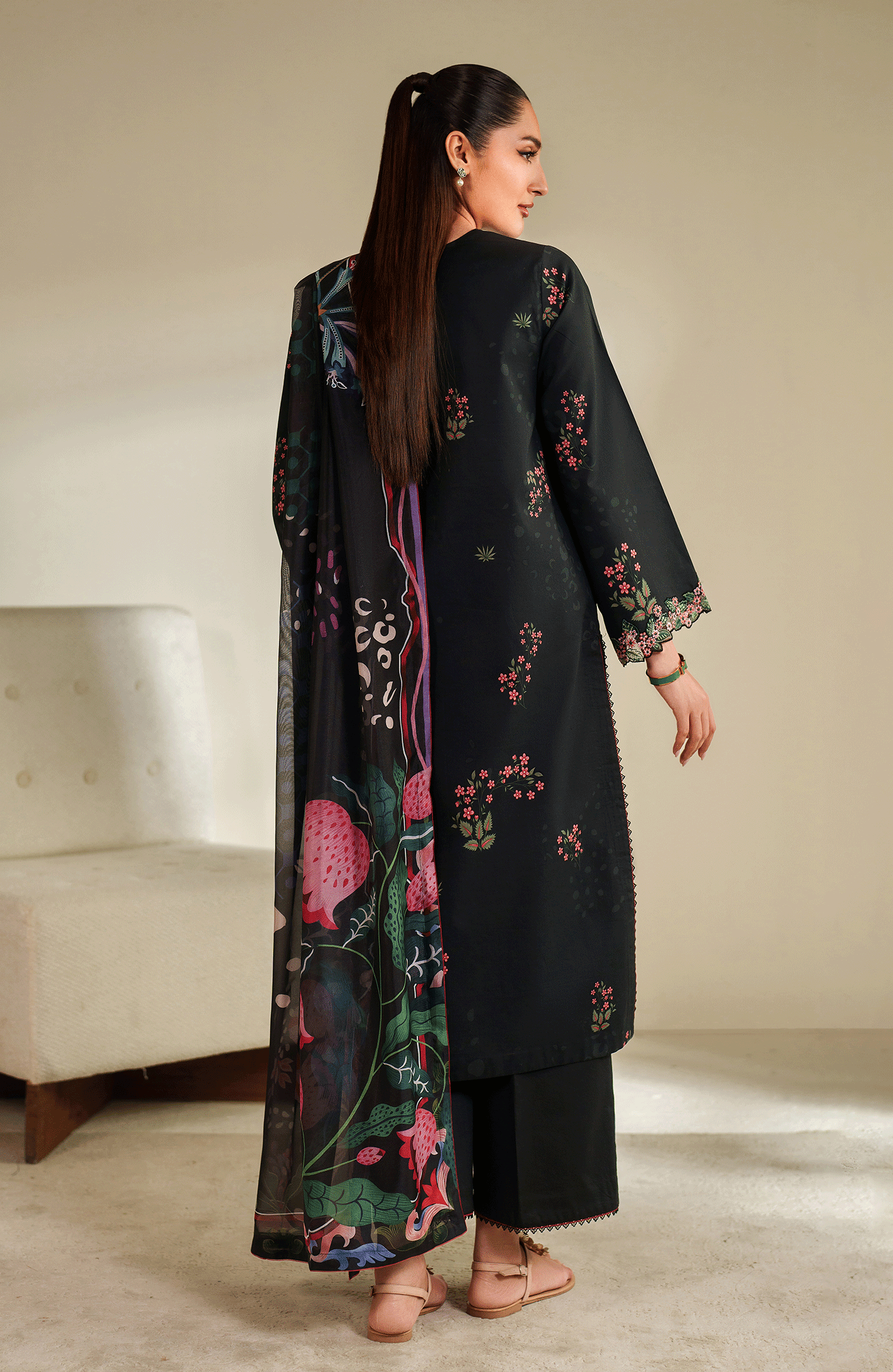 A midnight black three-piece ensemble that blends modern digital print with traditional craftsmanship. The cambric shirt features digital floral prints with a delicately embroidered neckline and sleeves hem. A blended silk dupatta bursts with vibrant botanical art, paired with dyed cotton trousers for a refined finish.