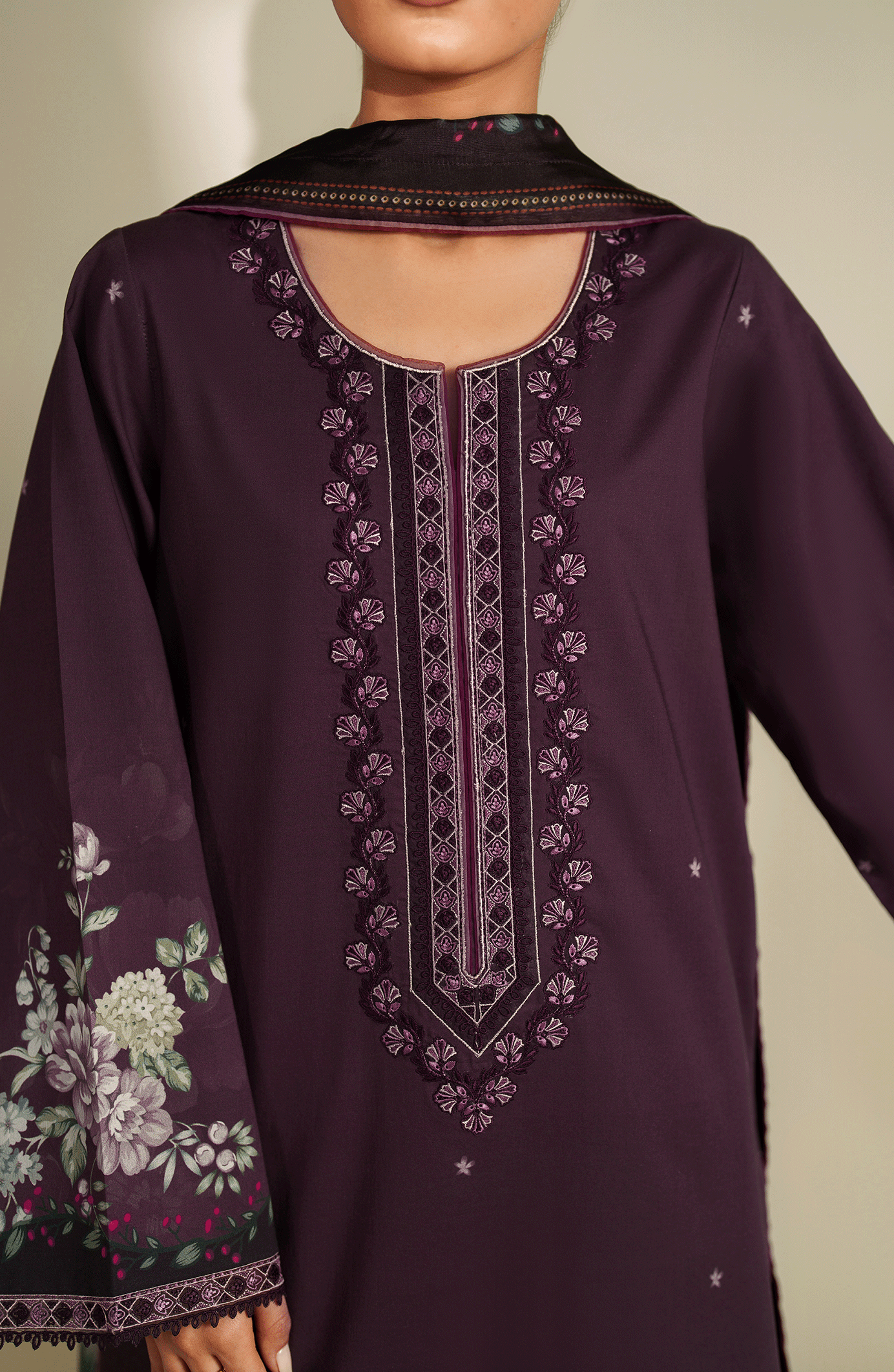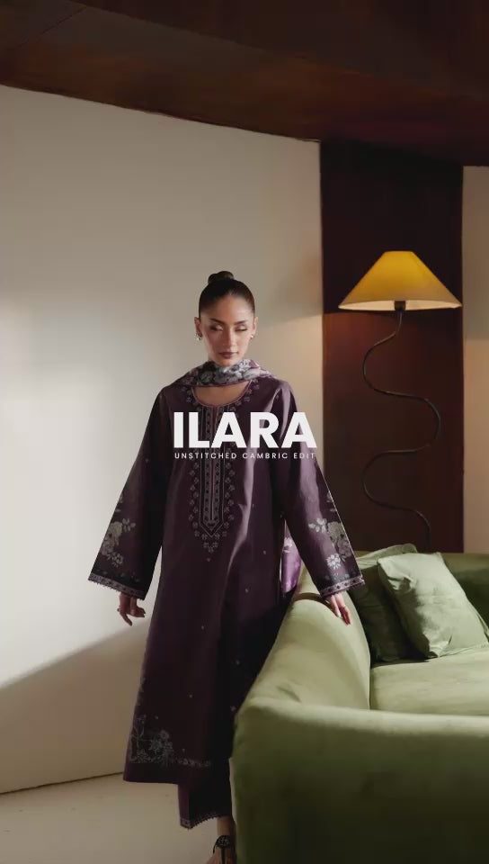 Regal in deep plum, this three-piece cambric set features a floral printed shirt with embroidered neckline and sleeves, matching trousers with embroidered borders, and a silk dupatta adorned with lush violet, lilac, and green botanicals.