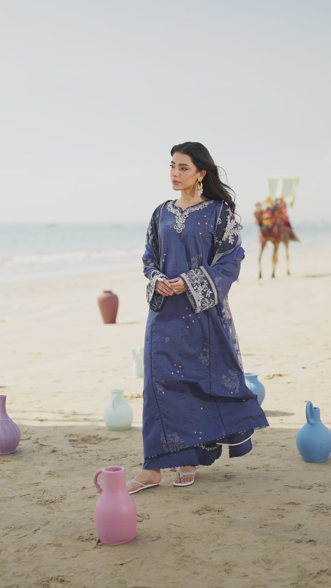 elegance and effortless wear. The lawn shirt features a soft printed texture with tiny scattered motifs across both the front and back, adding subtle depth while keeping the look light and breathable. A delicately embroidered neckline, finished with fine lace detailing, draws gentle focus on the design. The sleeves are completed with embroidered organza borders, lending a refined touch, while the shirt hem remains clean and straight for a polished silhouette. The look is paired with a printed chiffon dupatta, showcasing flowing floral elements that complement the ink blue base beautifully and add movement to the ensemble. Completing the set are cotton trousers, designed for everyday comfort and finished with scalloped hems for a soft, feminine finish. Thoughtfully detailed and easy to wear, Sia is an unstitched summer essential— crafted for comfort, confidence, and timeless appeal.