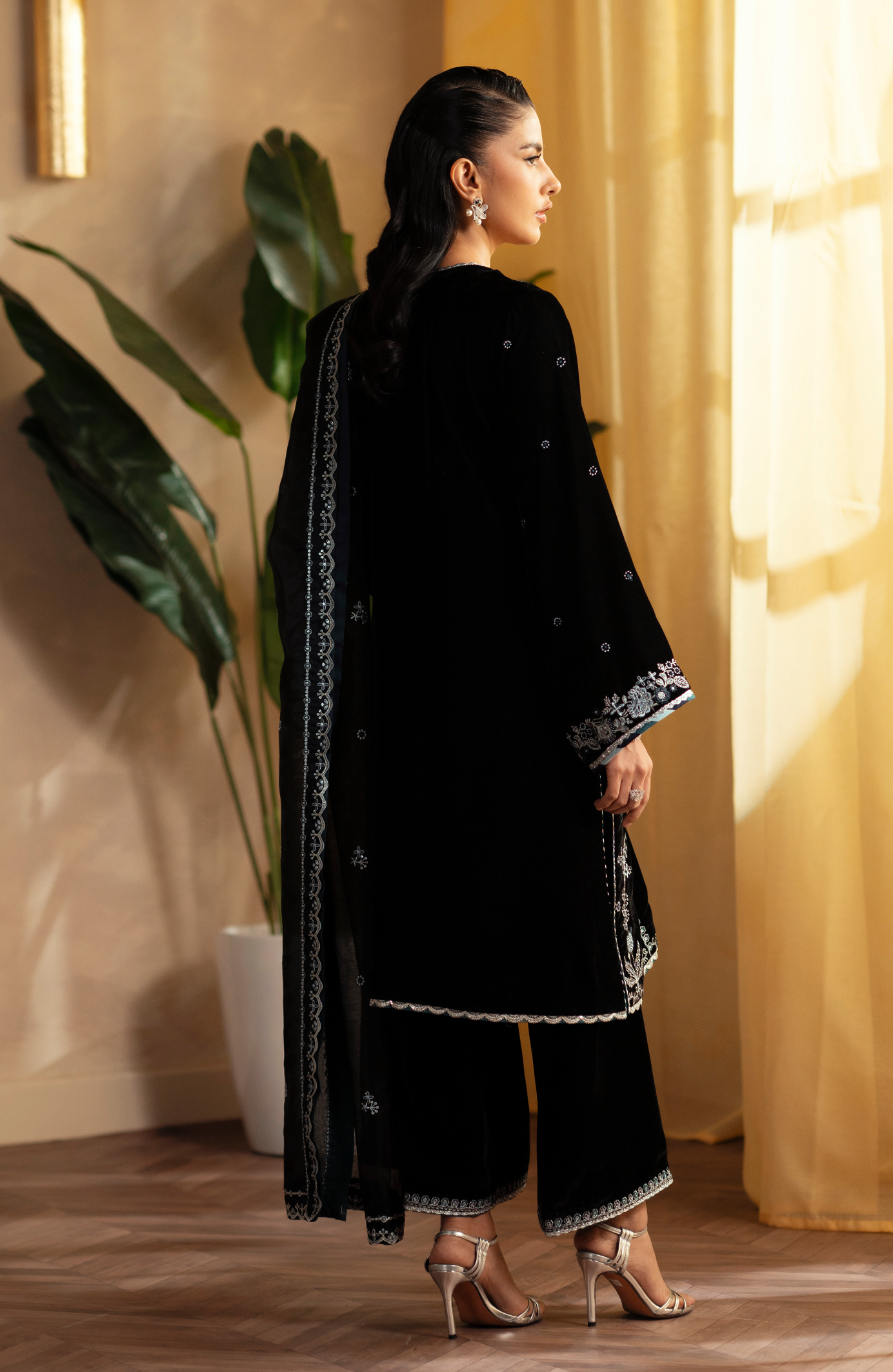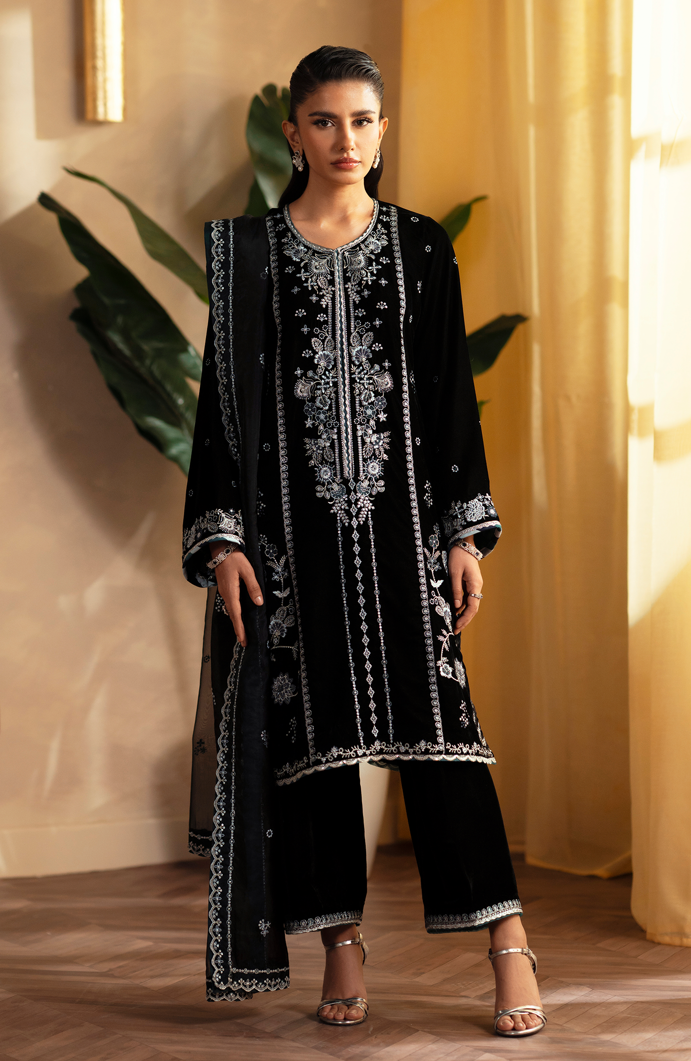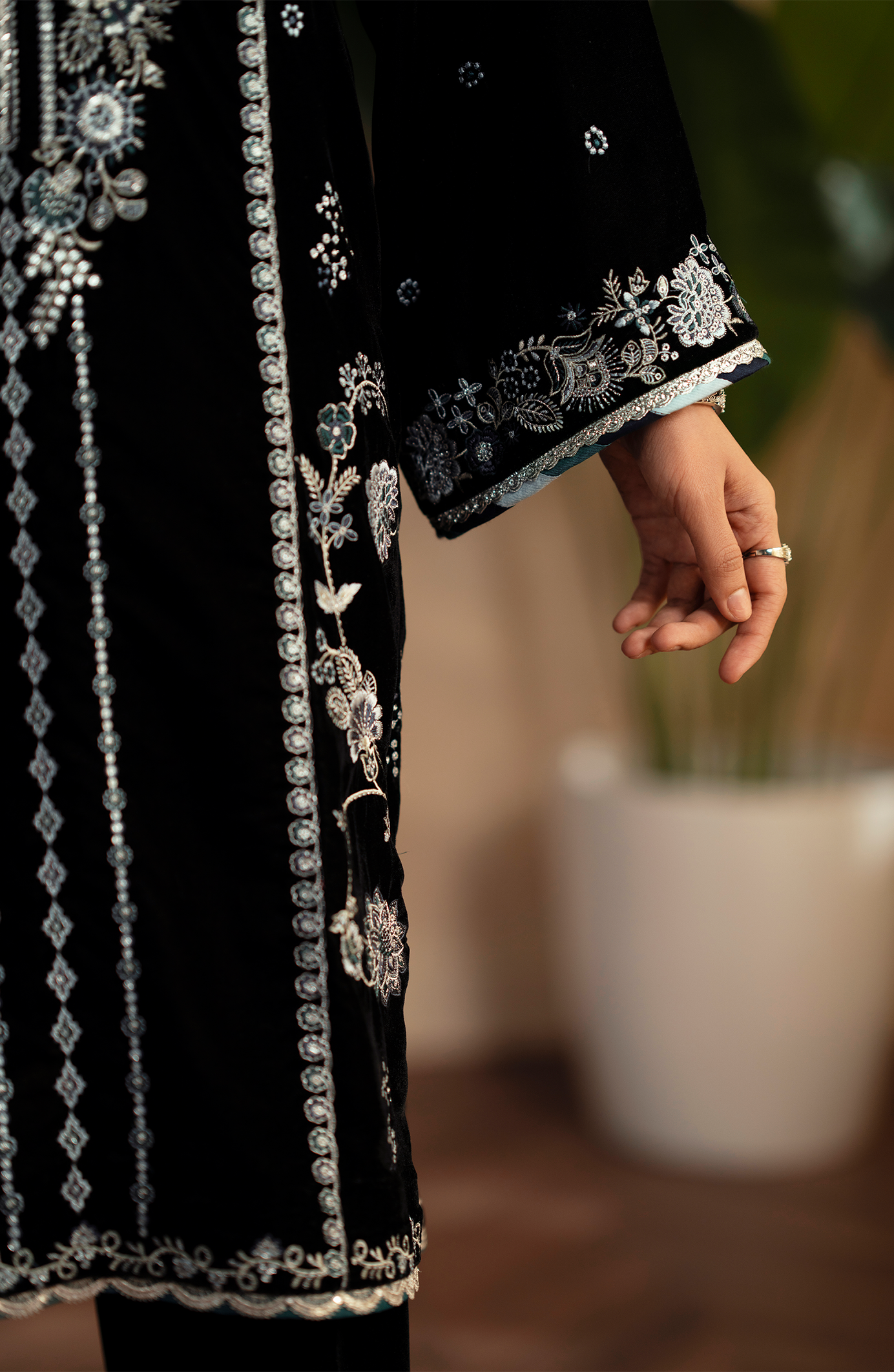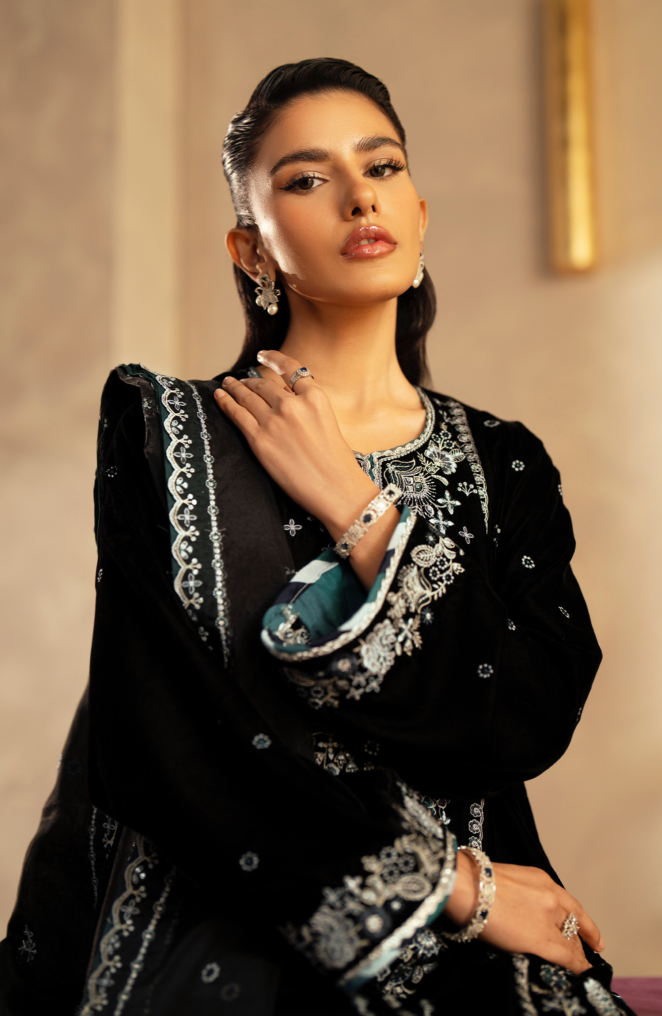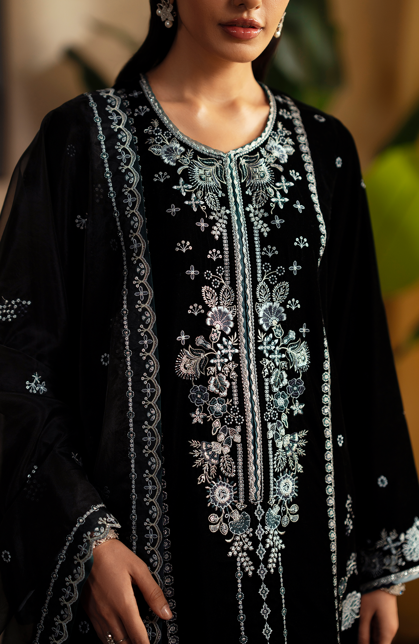 Intricate silver and ice-blue threadwork enhances the depth of black velvet in this unstitched outfit, detailing the neckline, sleeves, hem, and scattered motifs. A sheer organza dupatta with refined embroidered borders softens the richness, paired with velvet trousers finished with embroidery along the hem for a polished, cohesive look. Sylviane offers a composed, elevated take on festive dressing.
