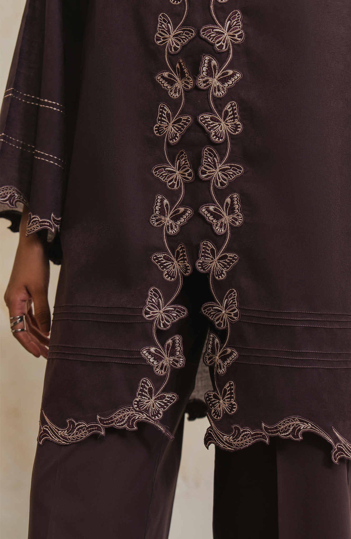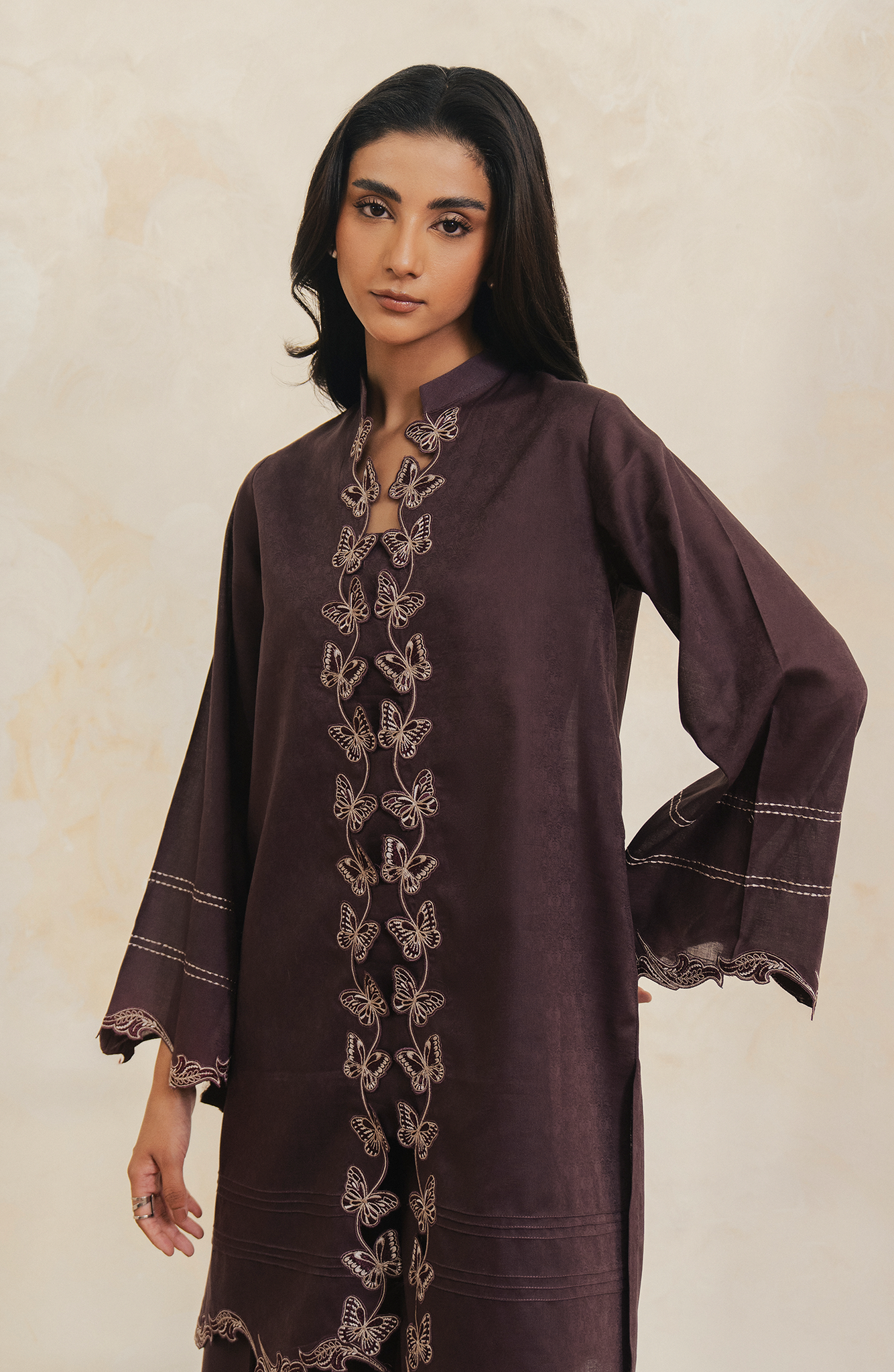 Crafted in lightweight cotton jacquard, Aeris is designed for warm summer days with a refined edge. The rich espresso-brown hue is beautifully contrasted with delicate tonal butterfly embroidery cascading down the front, adding depth and movement. Subtle stitch lines on the sleeves and softly embroidered scalloped hems complete the look. Contemporary, breathable, and effortlessly polished—perfect for elevated
