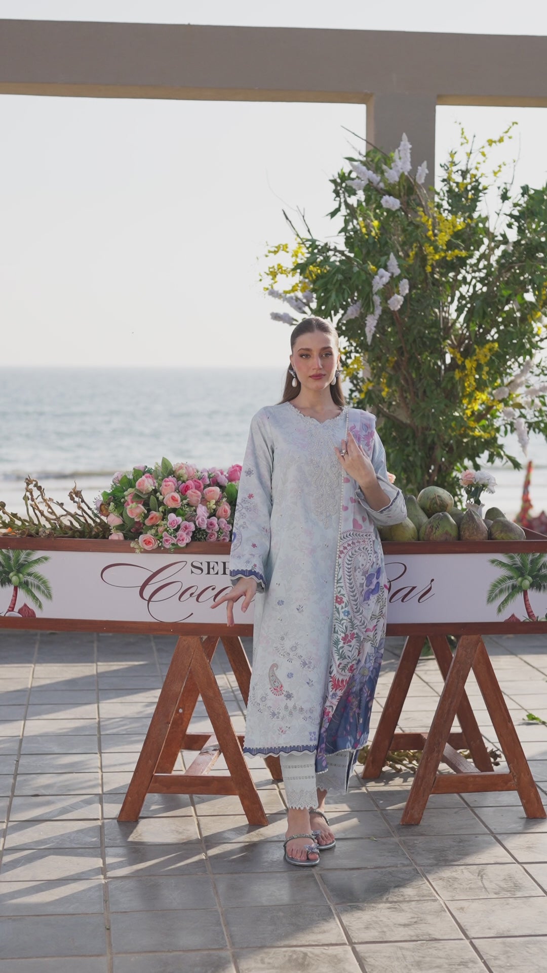 effortless summer dressing. The lawn shirt features a soft, all-over printed base, brought to life with a schiffli embroidered neckline that adds refined detail at the front. Both the shirt hem and sleeves showcase a scalloped printed border, finished with delicate organza scalloped edging, giving the silhouette a light, feminine finish. The back of the shirt remains printed and balanced, allowing the design to flow seamlessly from front to back. Paired with a printed chiffon dupatta, adorned with graceful florals and tonal contrasts, the ensemble feels airy and expressive. The cotton trousers are finished with embroidery at the hem, adding subtle texture and craftsmanship that completes the look with quiet elegance. Designed to be worn your way, Alara blends comfort, softness, and detail—making it ideal for warm days, daytime gatherings, and everyday moments that call for something