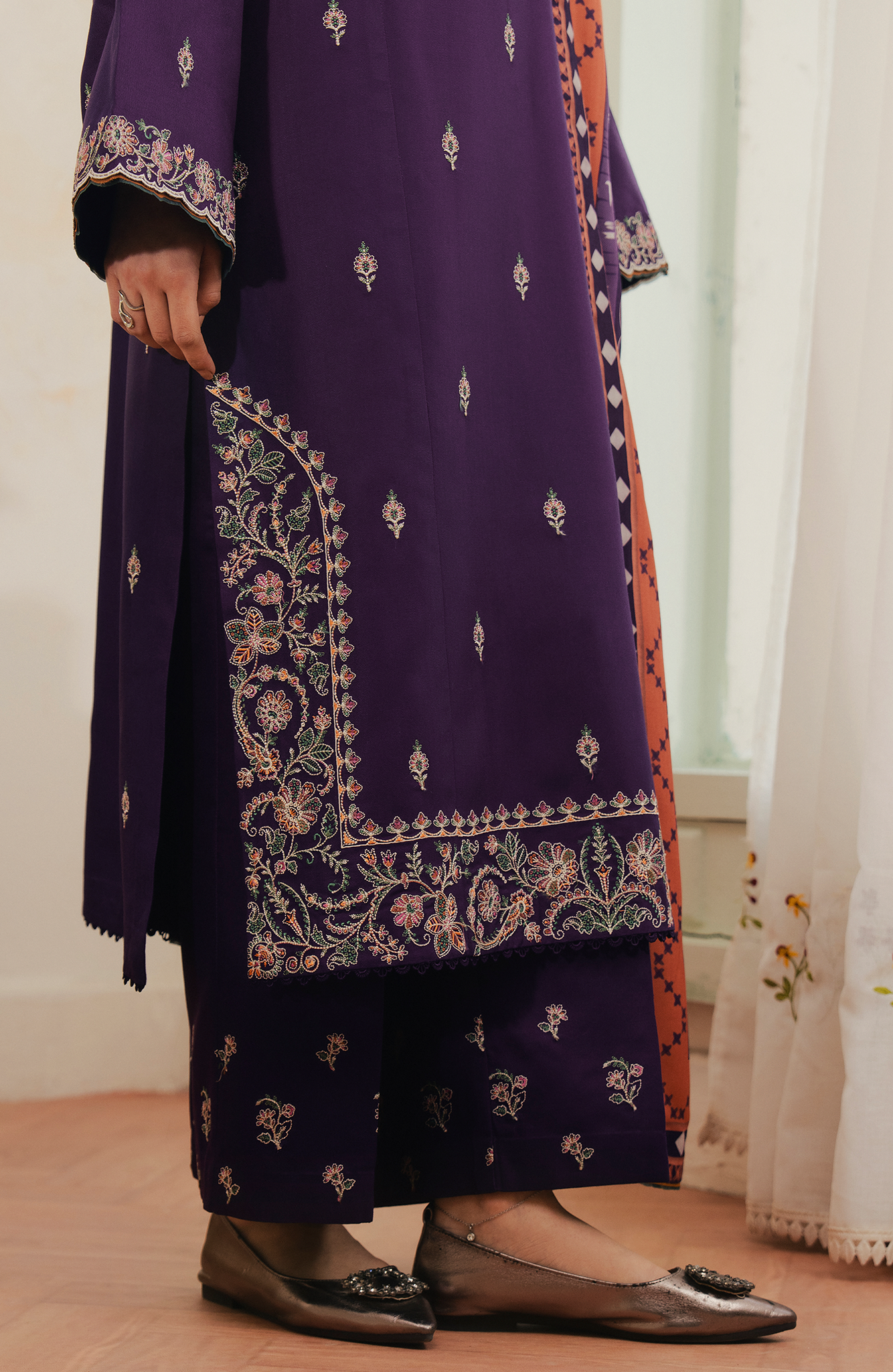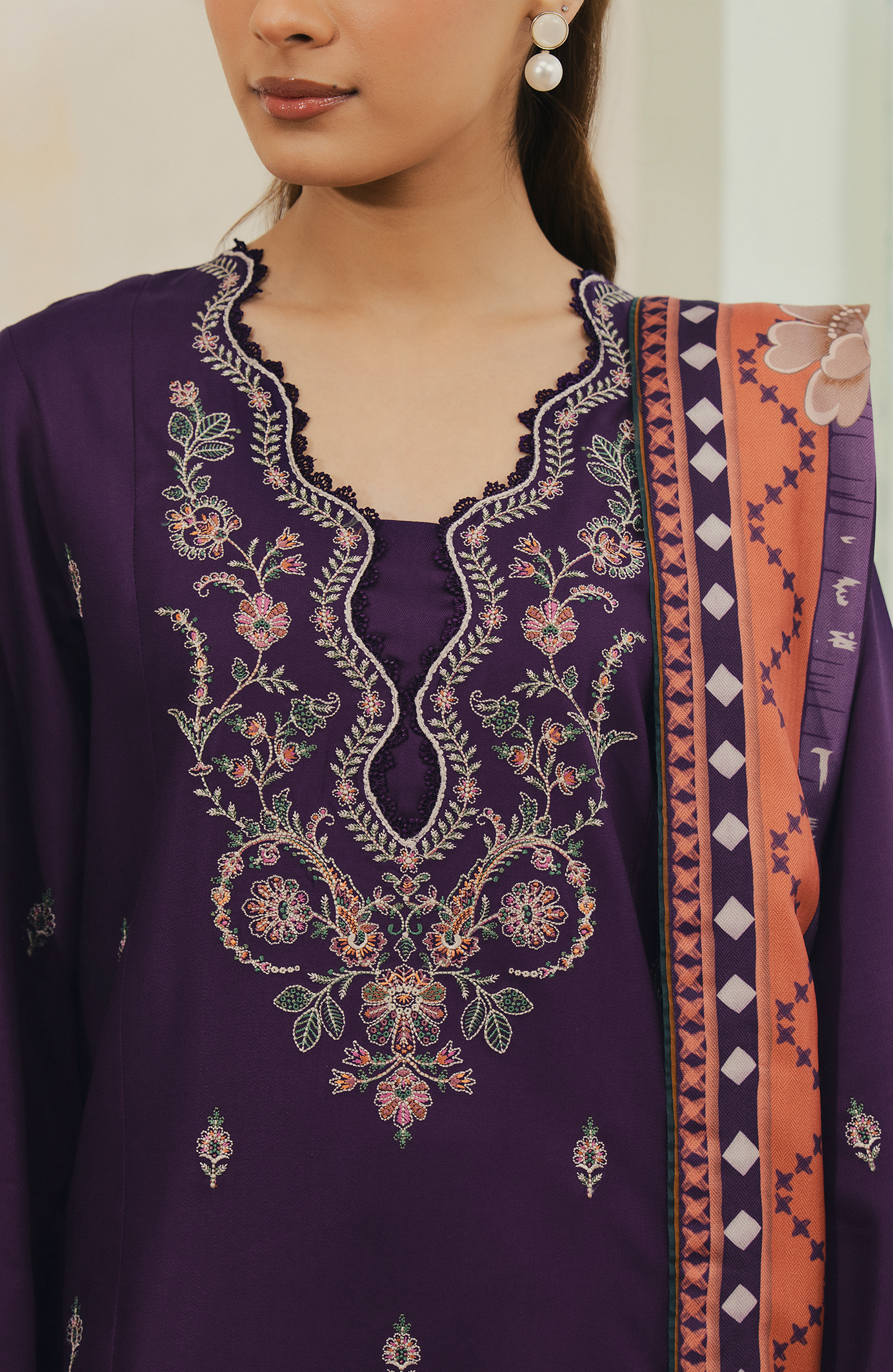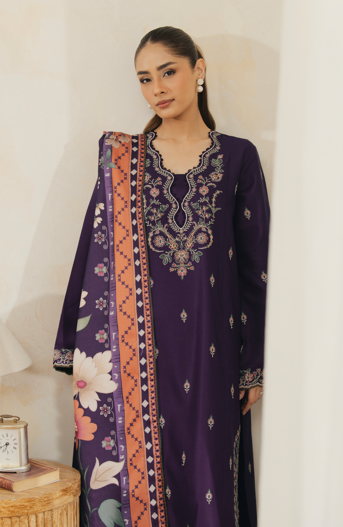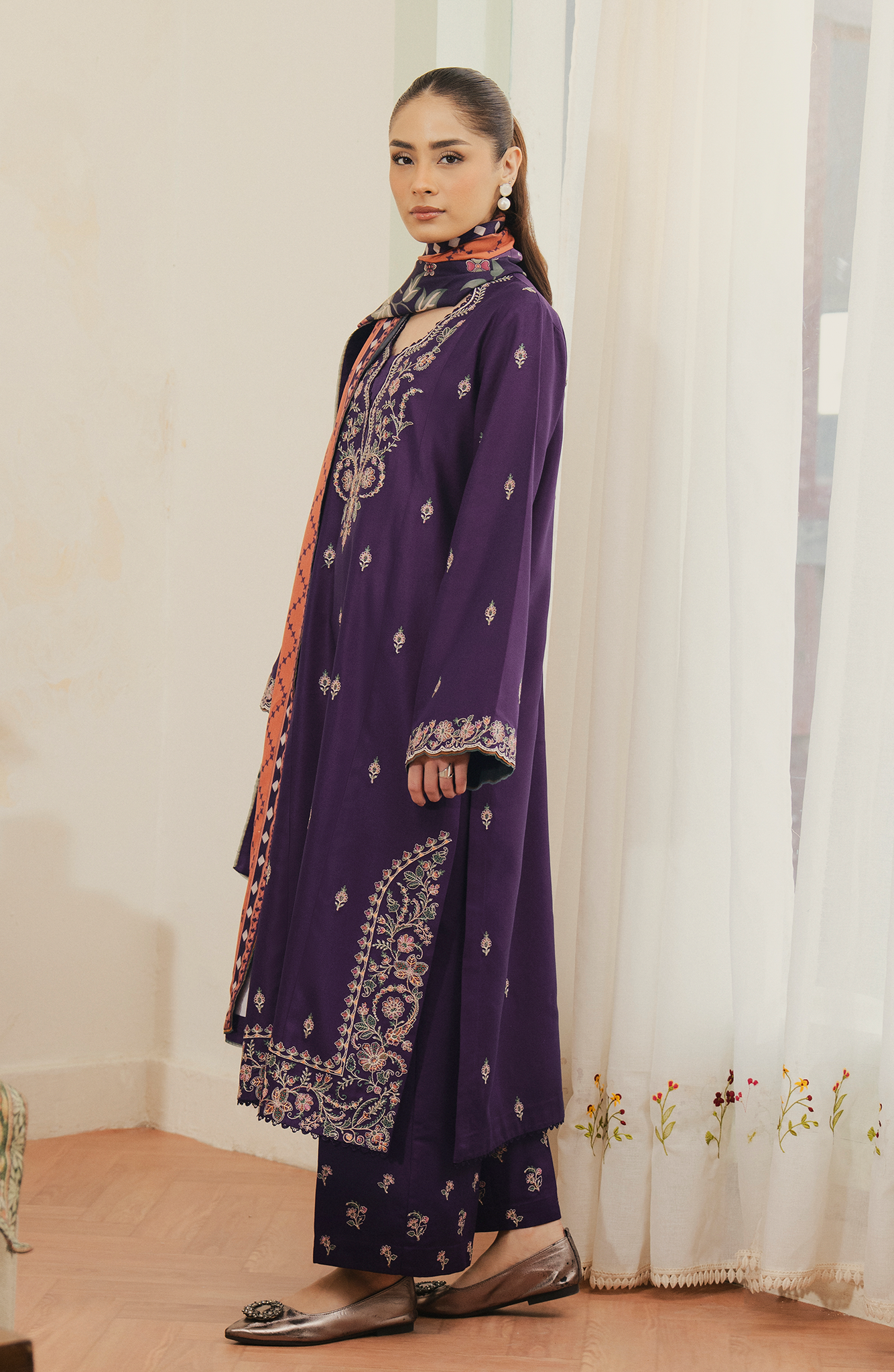 Set in a deep regal purple Aurese is an unstitched viscose ensemble adorned with intricate multicolored embroidery along the neckline, sleeves, borders, and scattered across the shirt for added depth. The matching viscose trouser features minimal detailing that complements the look. Paired with a striking blended printed shawl enriched with coordinated motifs and contrast tones, Alviera blends bold color, detailed craftsmanship, and refined winter sophistication.