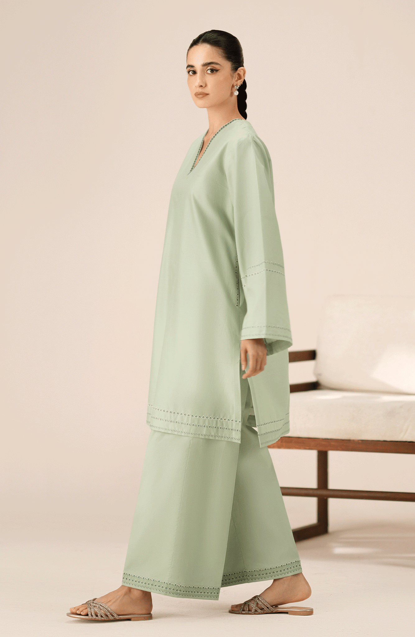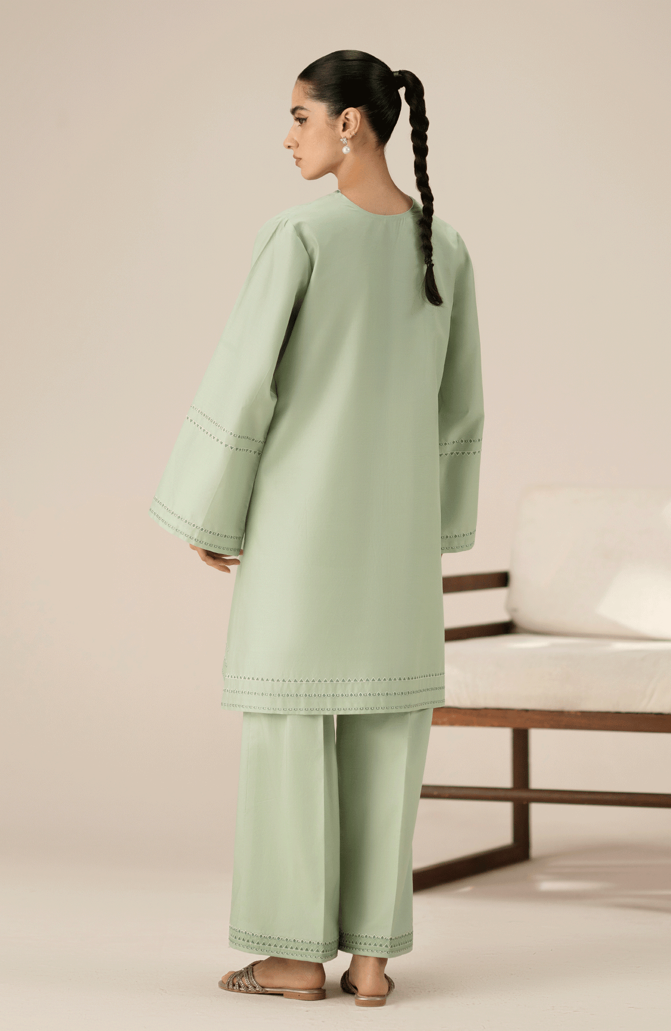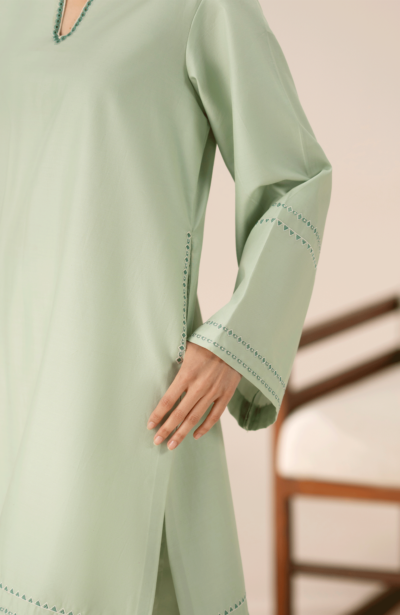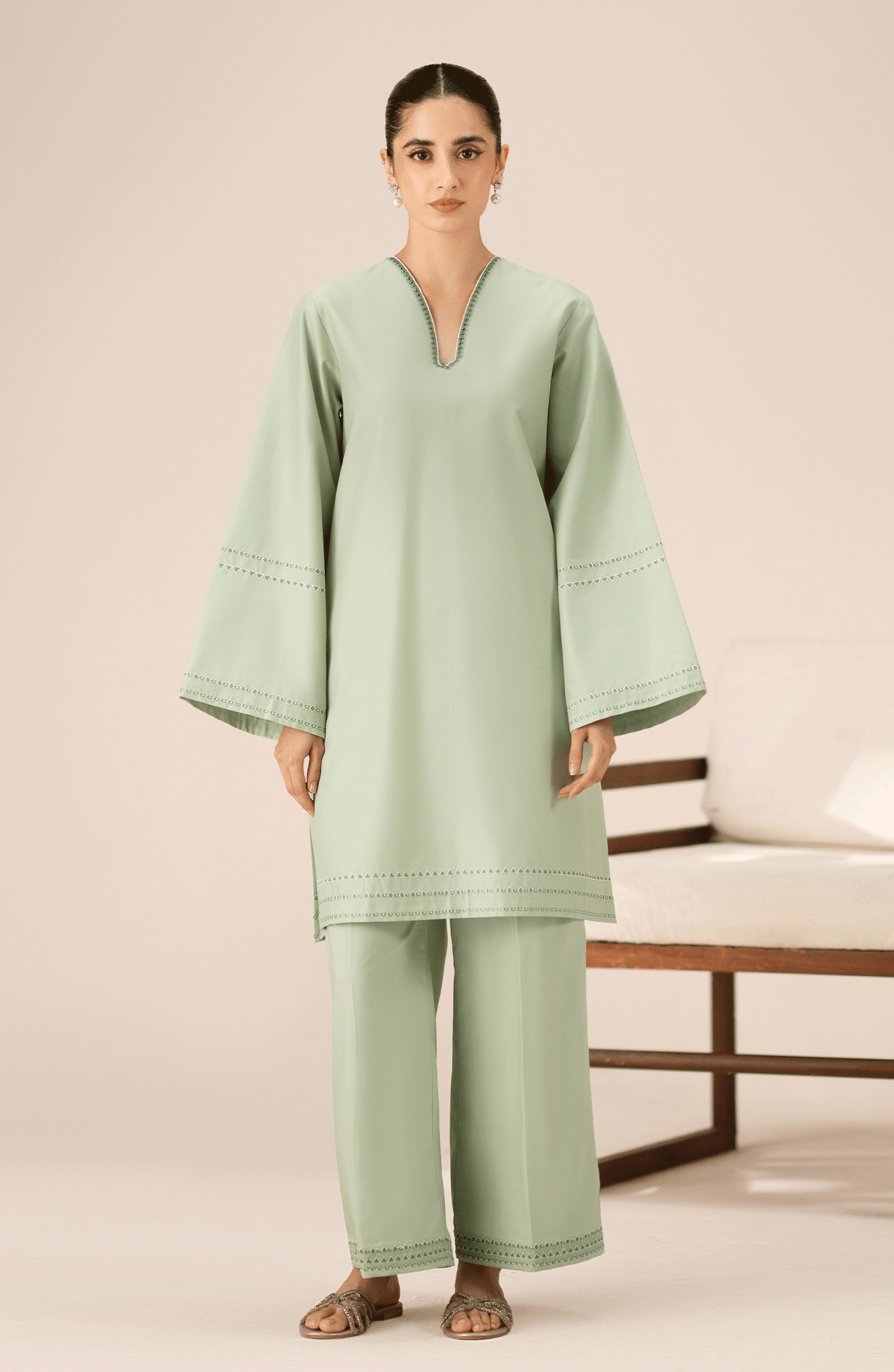 Clean lines, calming tones — Ayla is a soft sage green two-piece cambric set that speaks in quiet elegance. With minimal detailing and wide sleeves, it’s made for days when less feels just right. The plain pants are finished with a subtle running stitch along the border, adding just a hint of detail to the understated look.