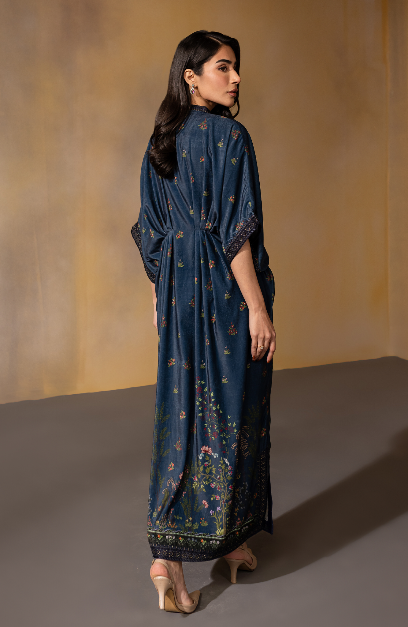 Step into a world of serene beauty with the Blue Meadow printed kaftan. Crafted from rich velvet, this piece brings the essence of a blooming garden to life with its delicate floral embroidery and artistic print. Paired with raw silk trousers, the flowing silhouette and refined details create a perfect fusion of comfort and sophistication.