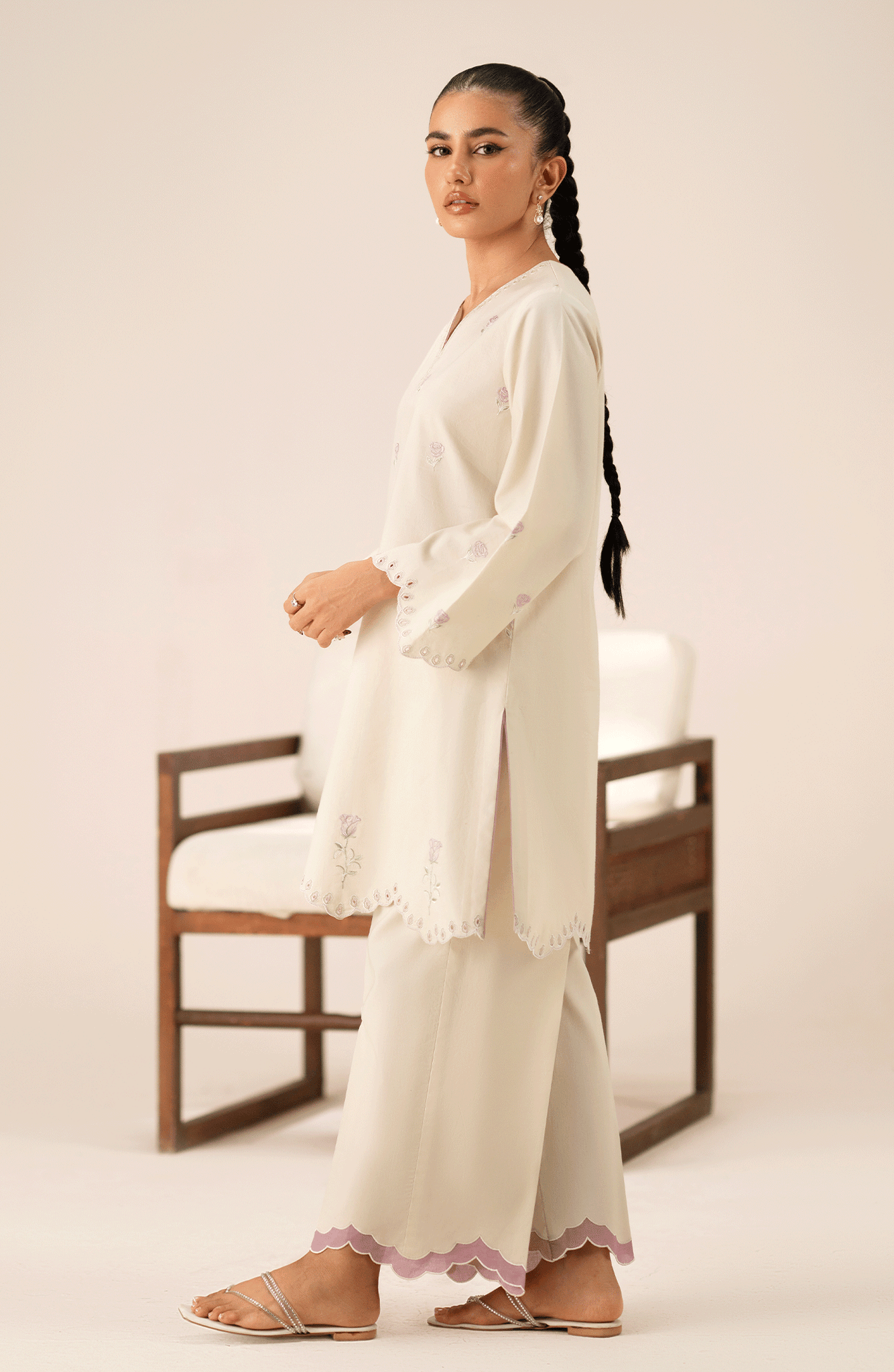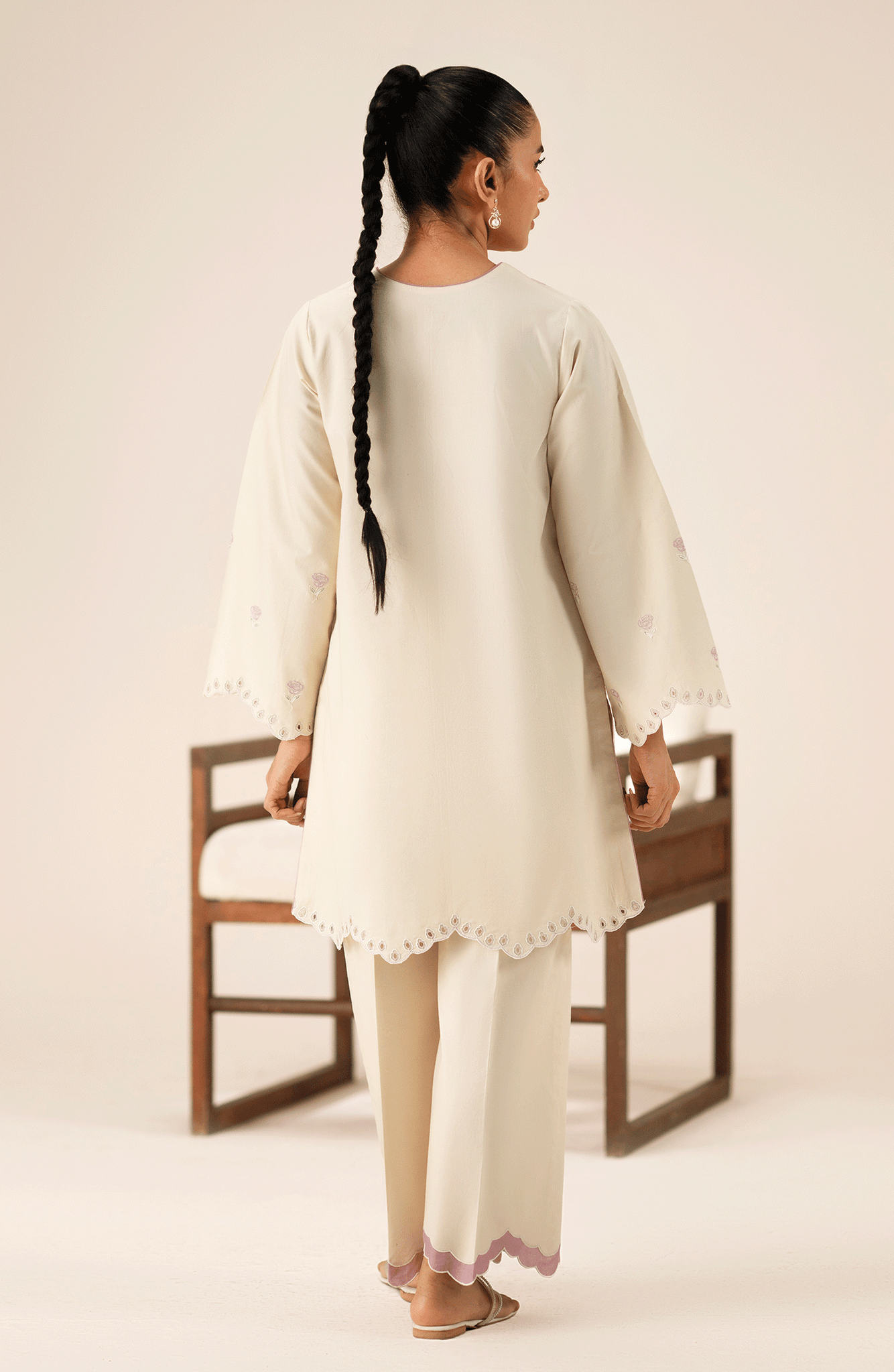 Soft, subtle, and effortlessly graceful — Nura is a two-piece cambric set in a calming cream tone, delicately adorned with lilac embroidery and scalloped edges, paired with lilac laser cut scalloped hem wide-leg trousers. A breezy silhouette that brings quiet charm to your everyday wardrobe.