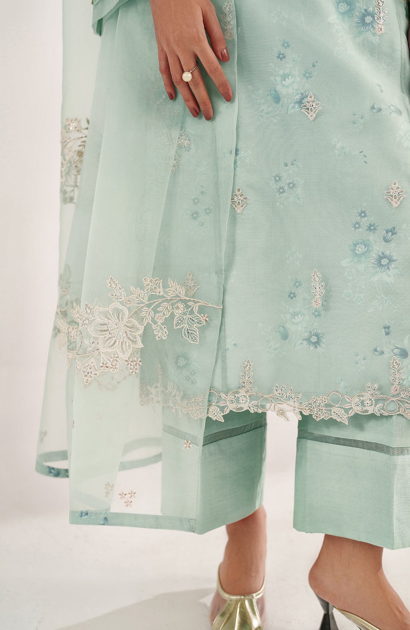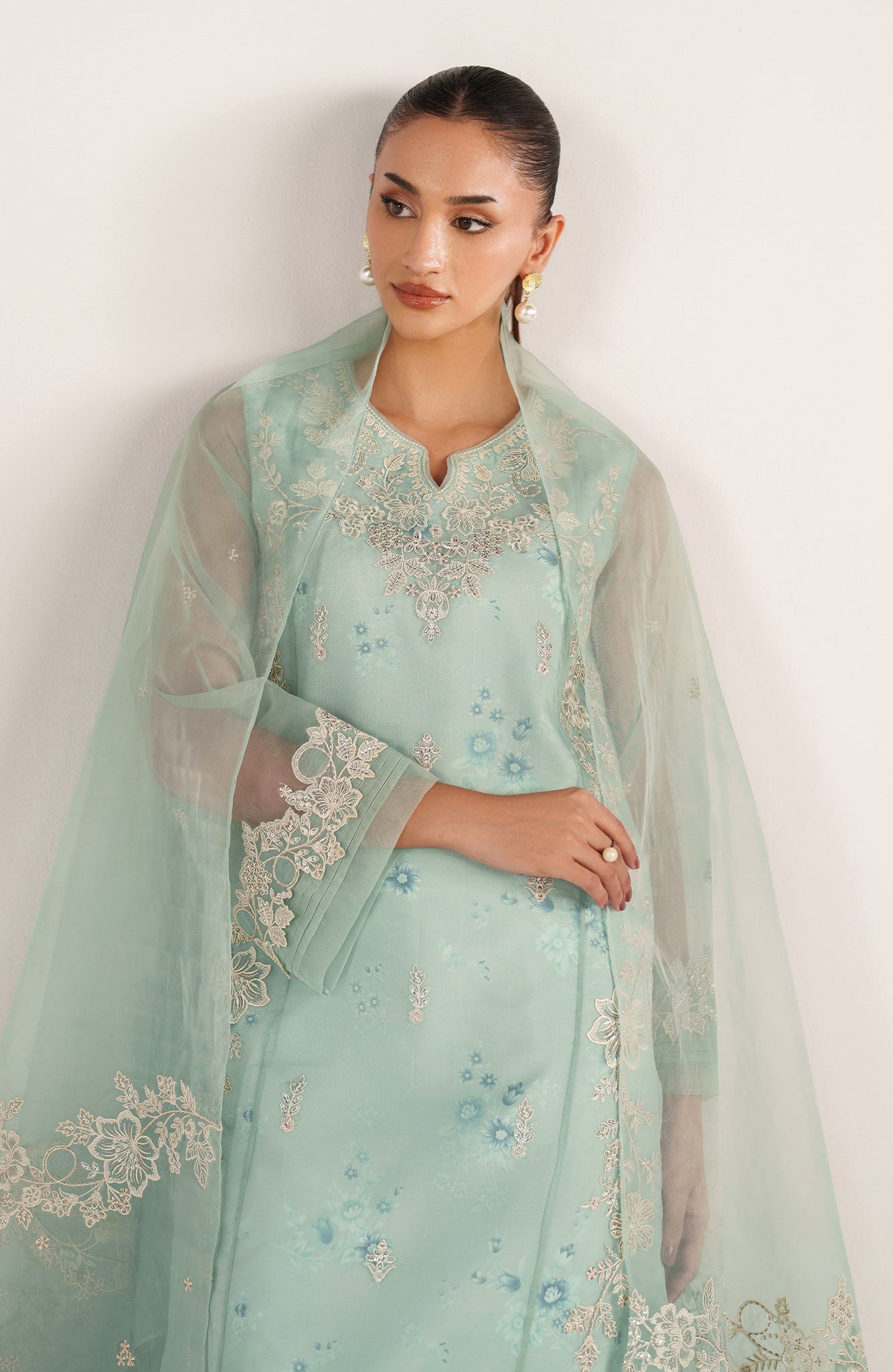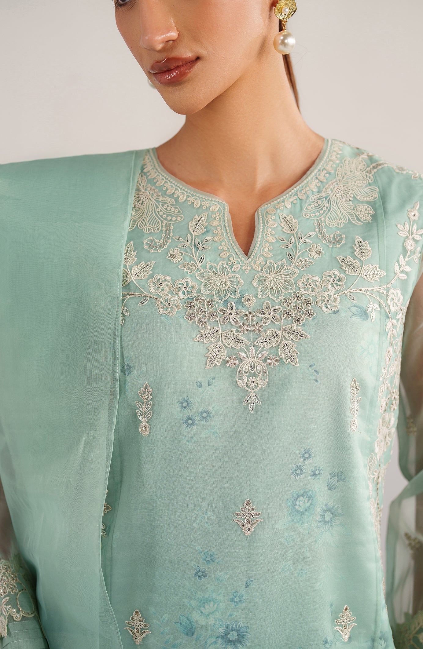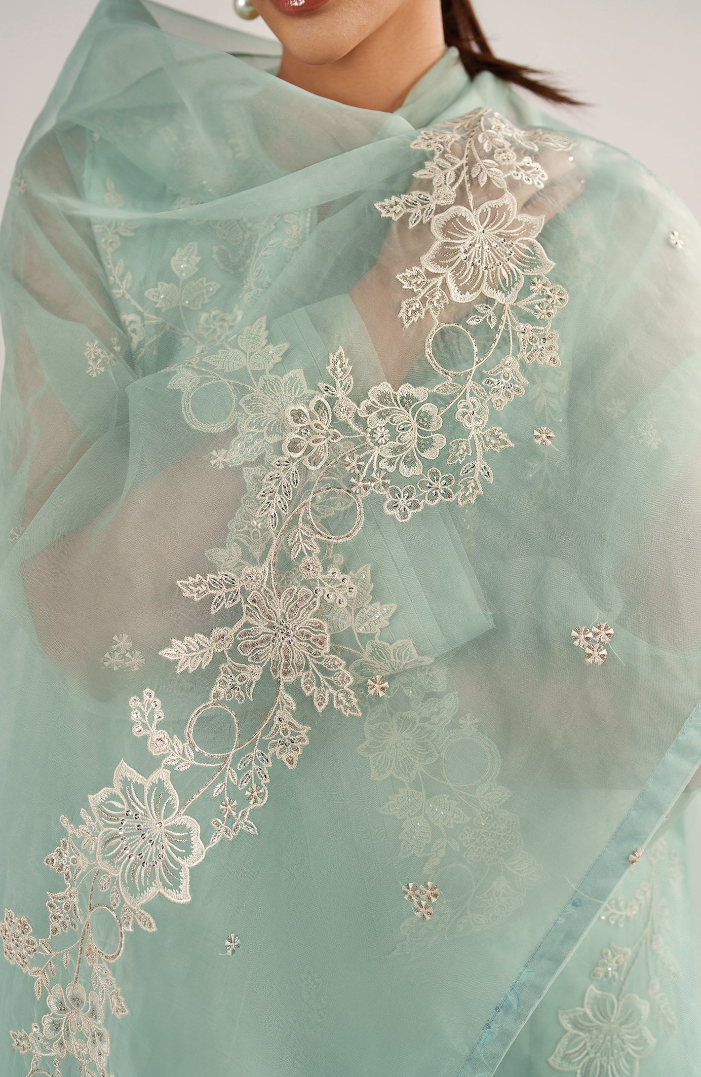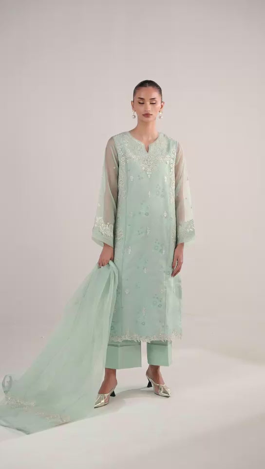 Bathed in a soft mint aqua hue, Celistra embodies delicate sophistication. The organza shirt is adorned with intricate thread and tilla embroidery in tones of ivory, silver, and icy blue — gracing the neckline, sleeves, and hem with elegant precision. The sheer organza dupatta mirrors the same artistry, with beautifully embroidered borders adding a whisper of luxury. Paired with raw silk trousers that feature refined detailing along the hem, this ensemble blends ethereal charm with graceful modernity — a serene statement of festive elegance.