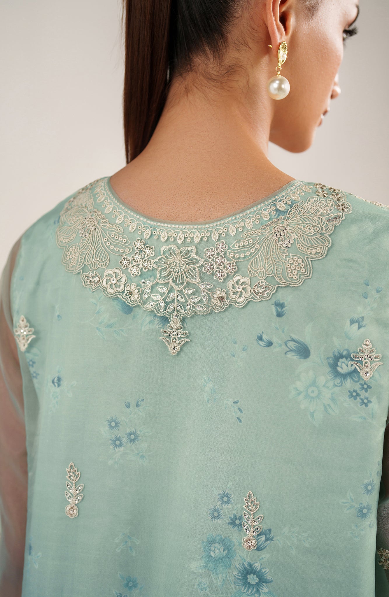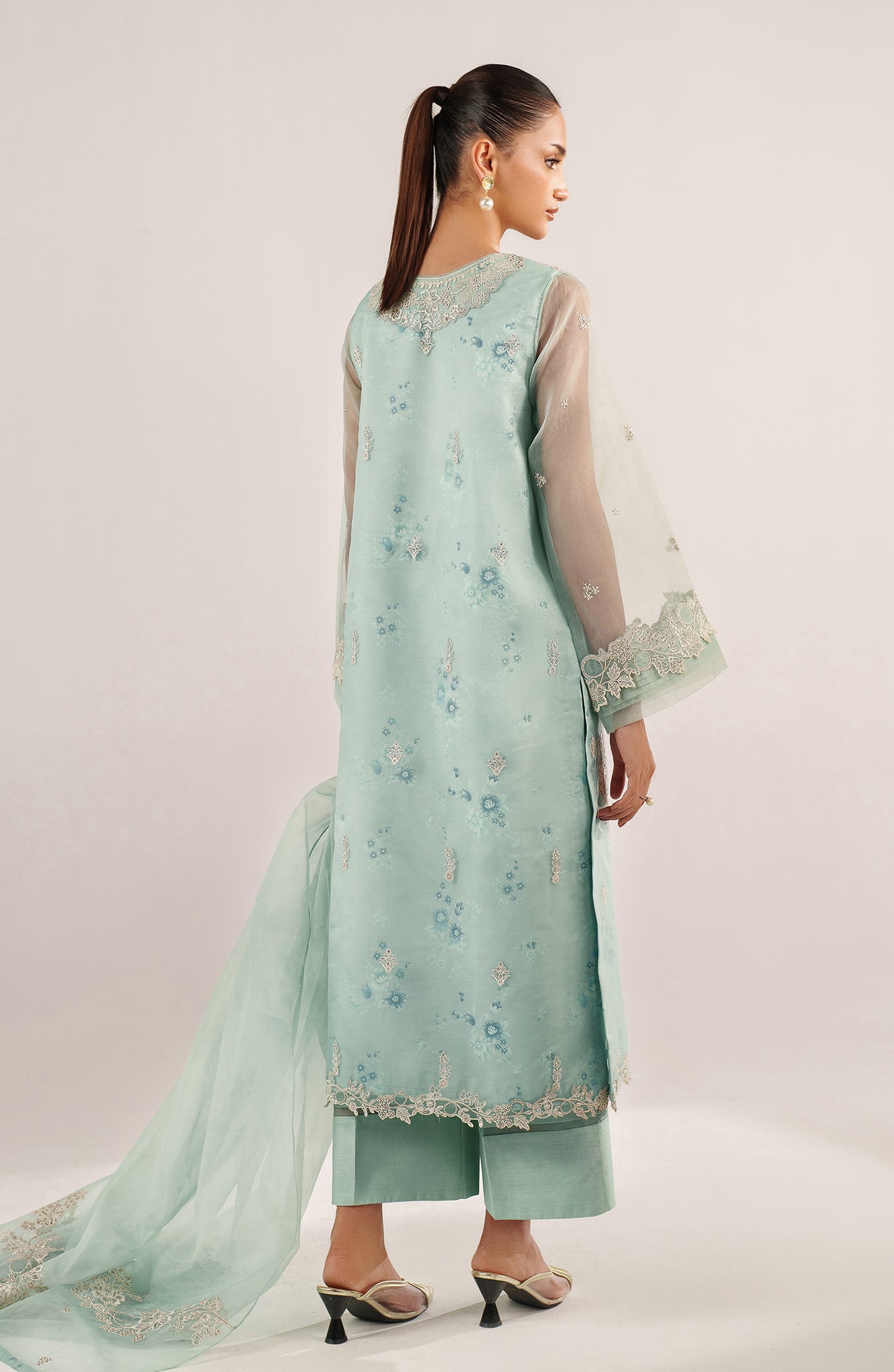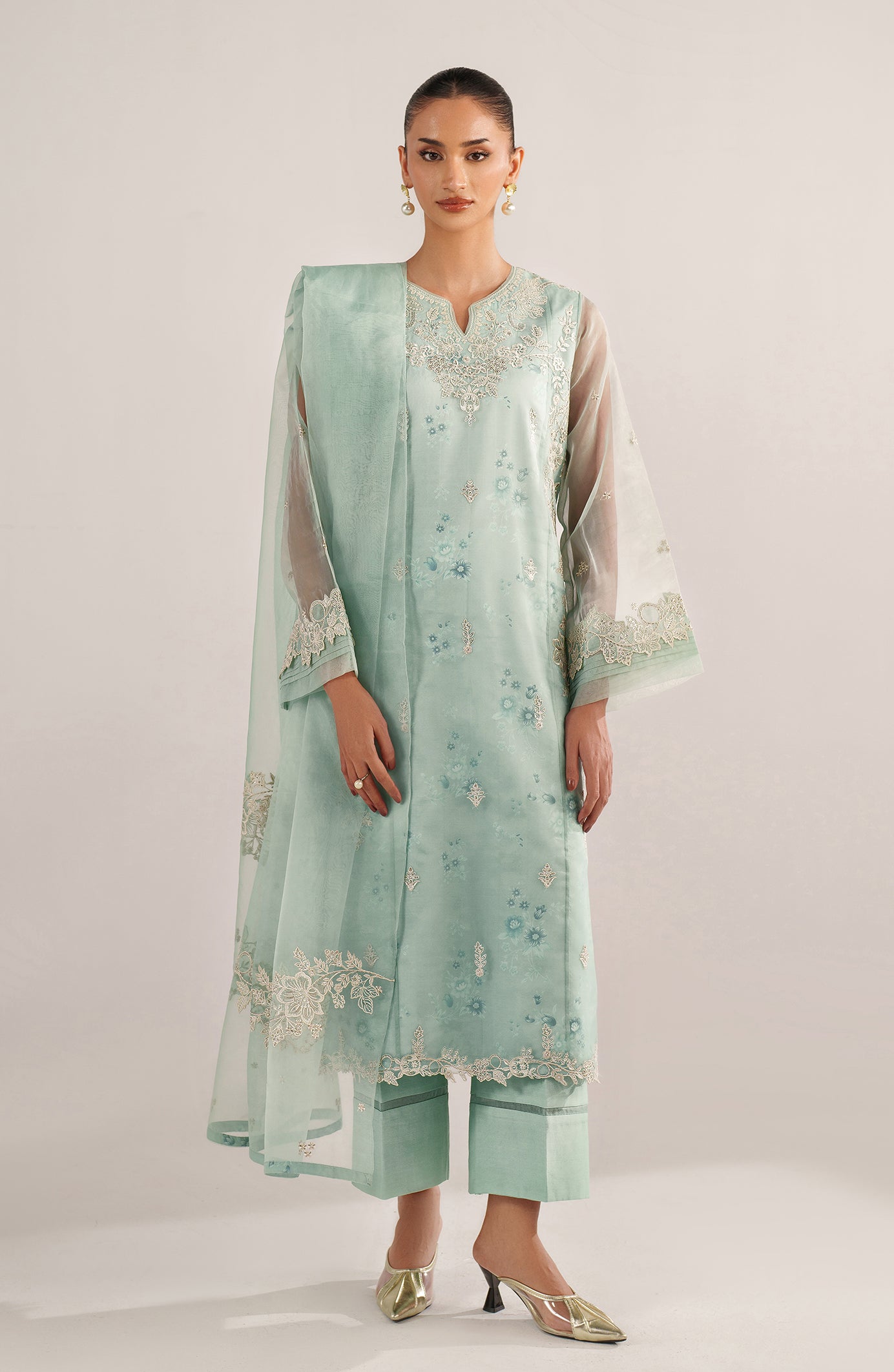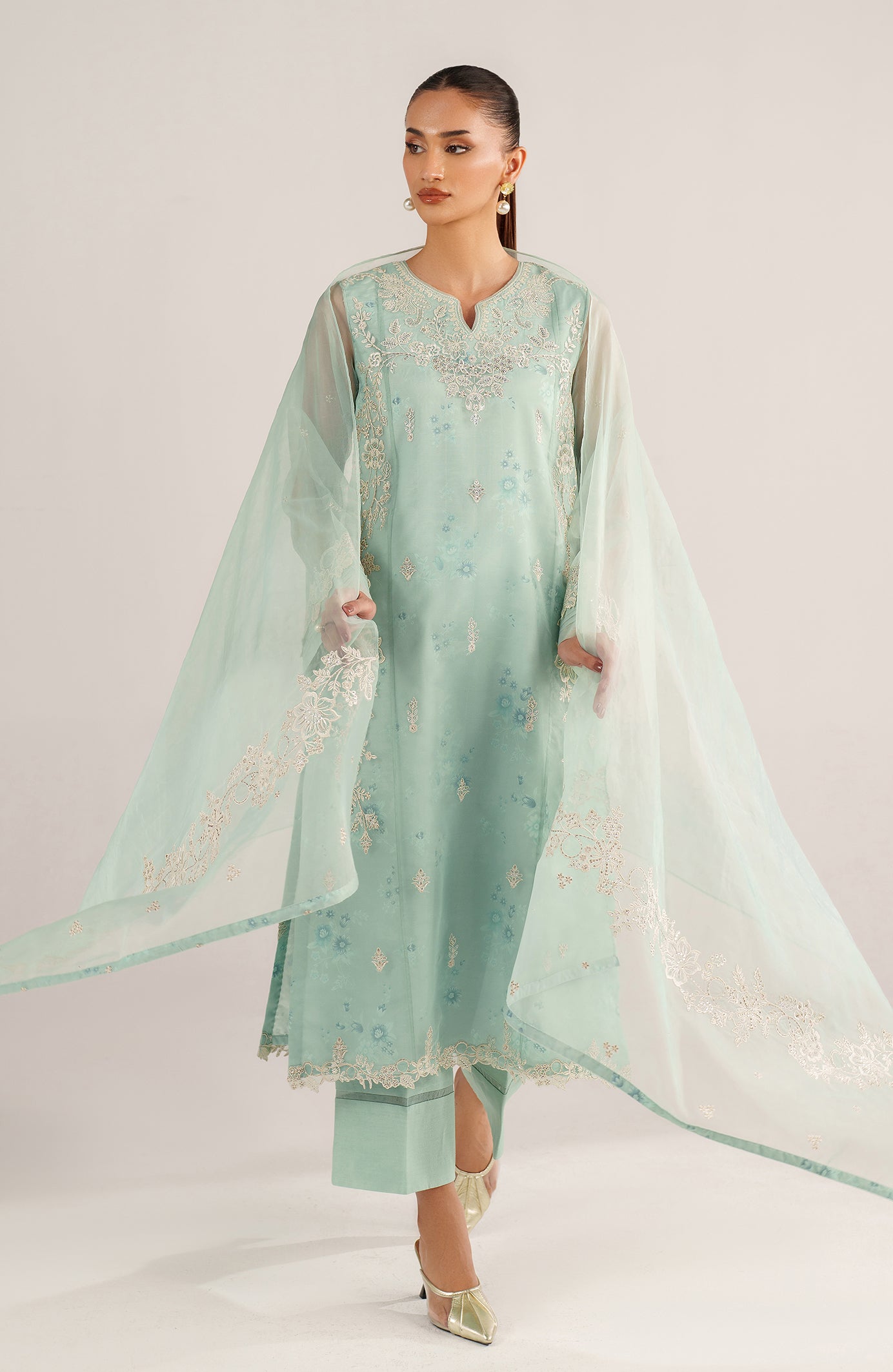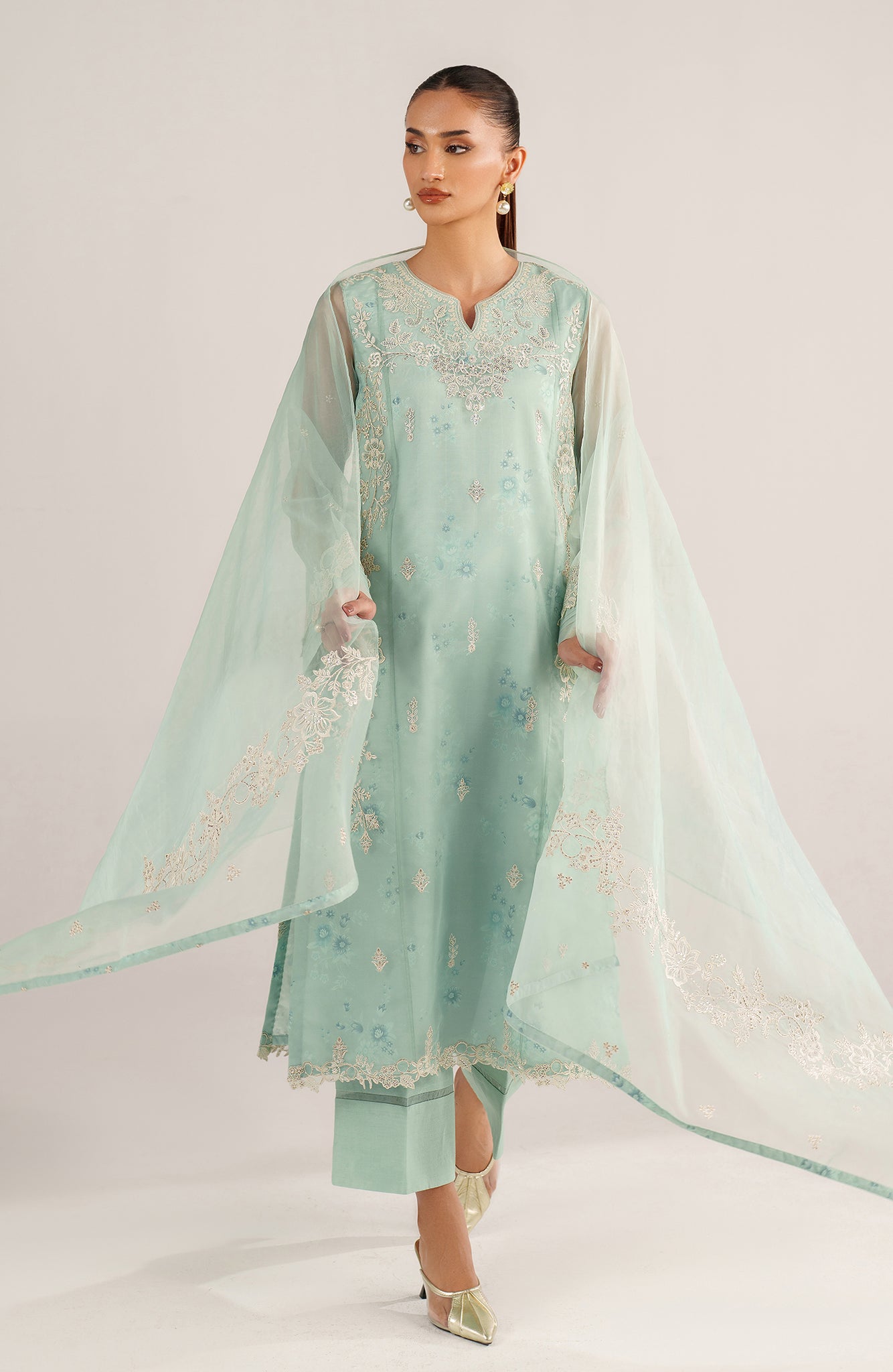 Bathed in a soft mint aqua hue, Celistra embodies delicate sophistication. The organza shirt is adorned with intricate thread and tilla embroidery in tones of ivory, silver, and icy blue — gracing the neckline, sleeves, and hem with elegant precision. The sheer organza dupatta mirrors the same artistry, with beautifully embroidered borders adding a whisper of luxury. Paired with raw silk trousers that feature refined detailing along the hem, this ensemble blends ethereal charm with graceful modernity — a serene statement of festive elegance.