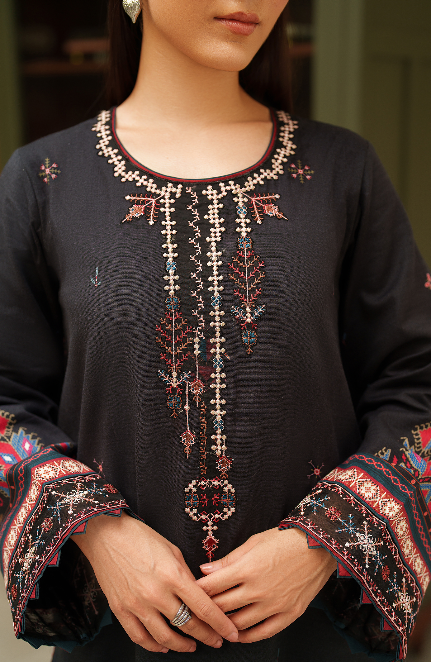 A charcoal black slub khaddar ensemble beautifully embroidered along the neckline and sleeves with fine threadwork in crimson and ivory. The plain trouser provides a refined contrast, while the printed blended shawl dupatta ties the look together with artisanal charm. Perfect for winter days that call for quiet sophistication and timeless grace.