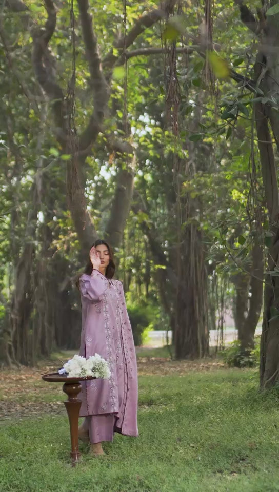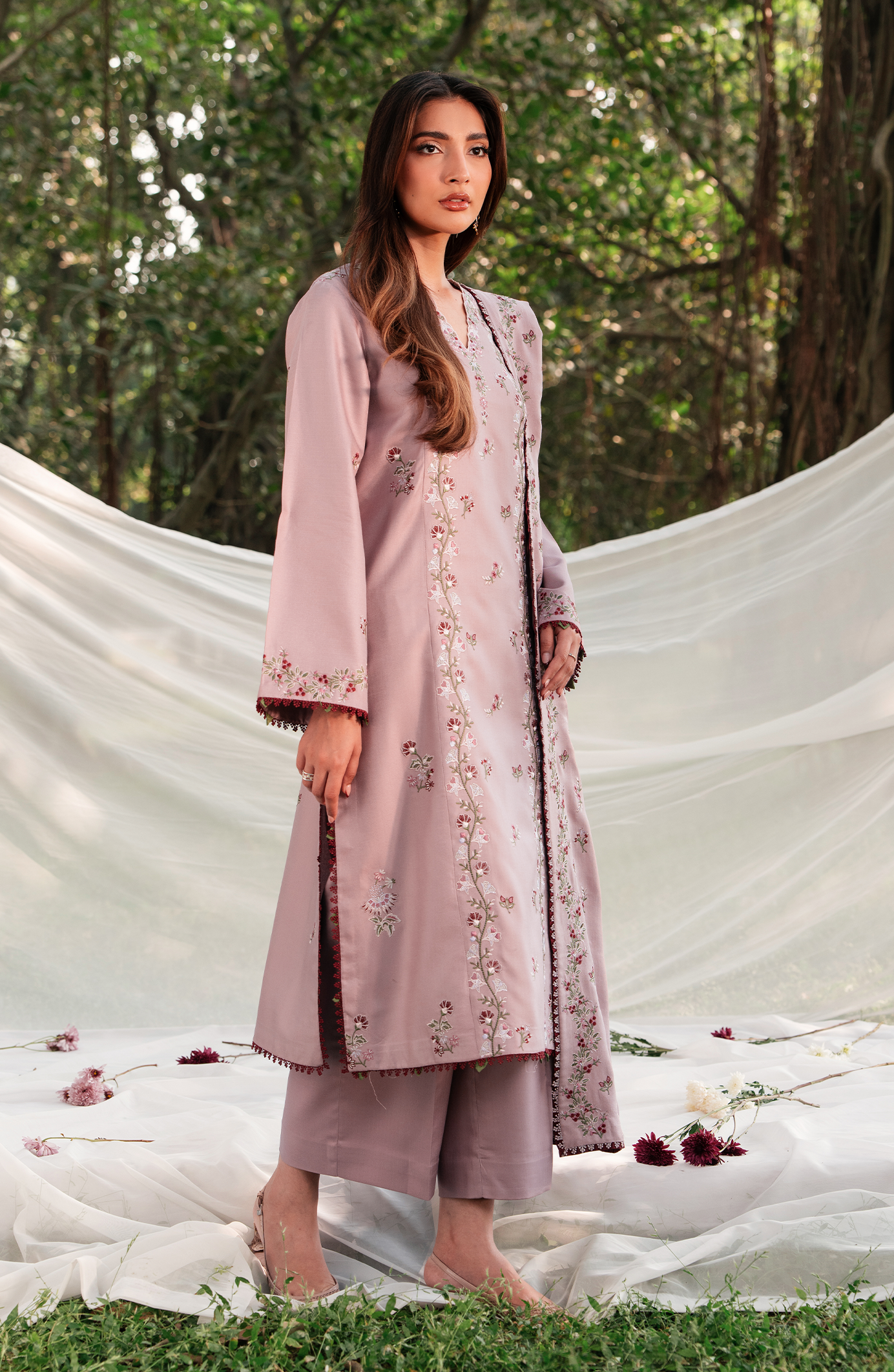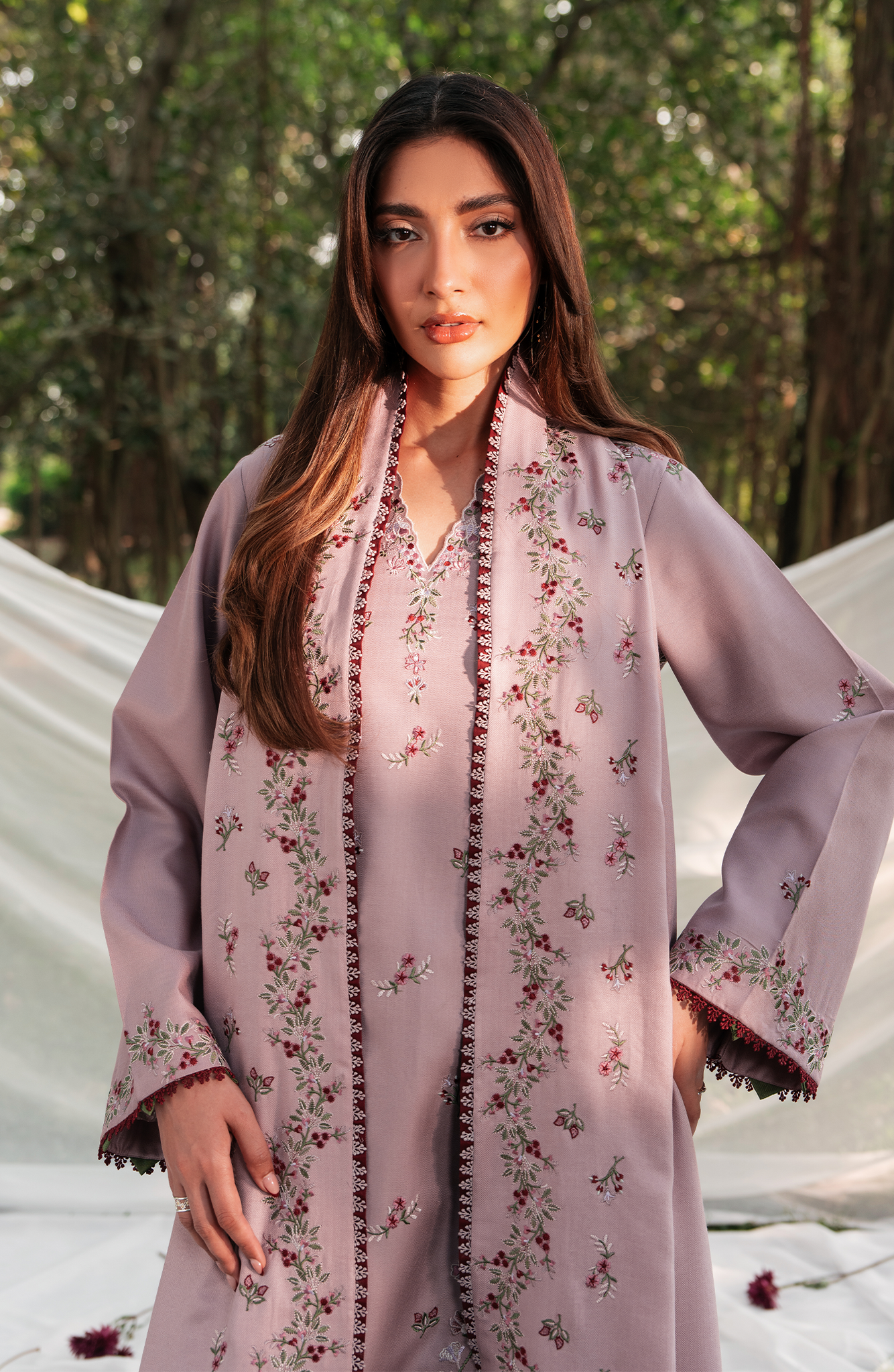 In soft mauve tones, Elaris blooms with intricate resham embroidery in shades of crimson, rose, ivory, and moss green, delicately cascading along the shirt front and sleeves. The floral vines and scalloped detailing add depth and refinement, while the borders are framed with contrast maroon edging for a graceful finish. The shirt and trouser are crafted from viscose, paired with a blended embroidered shawl echoing the same romantic florals — radiating timeless femininity and serene winter charm.