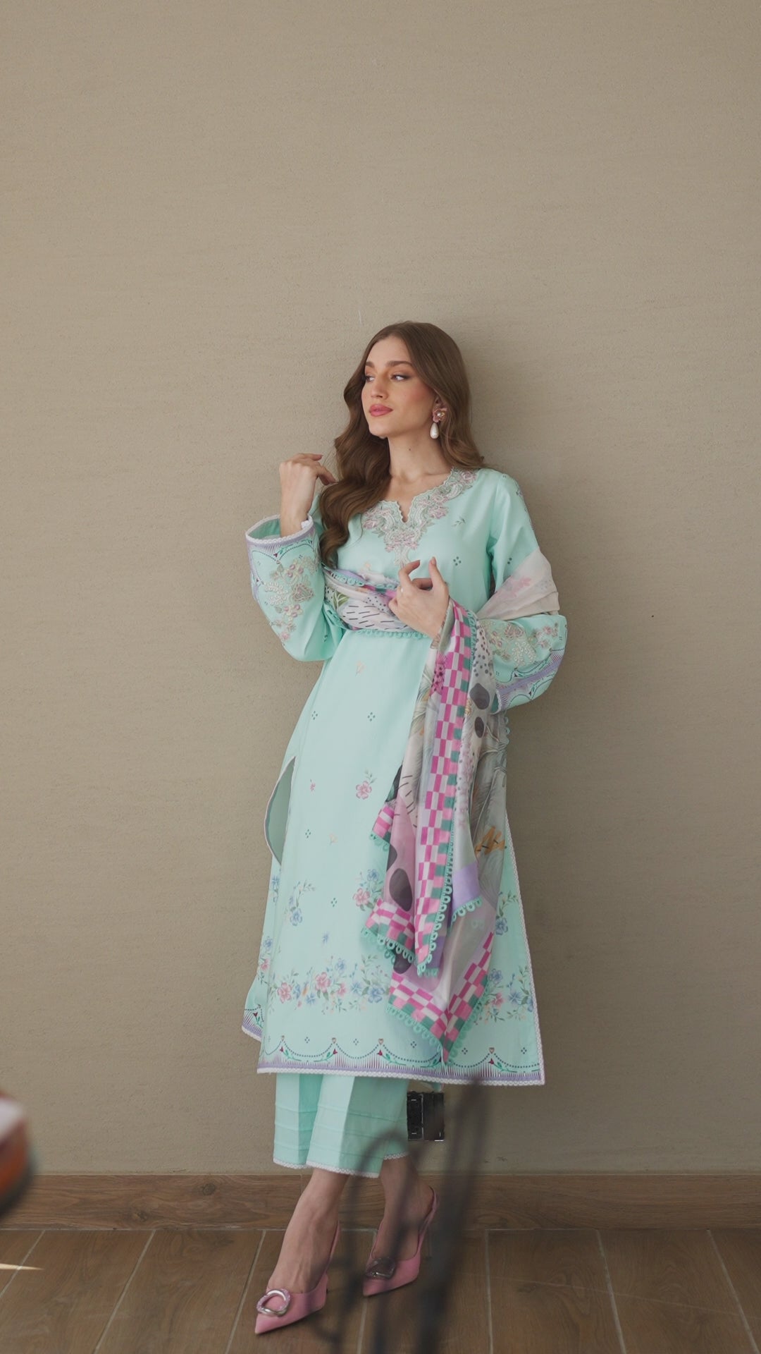Light, airy, and quietly graceful, Elaya is a 3PC unstitched design, created for sunlit days that call for ease and freshness. The minty seafoam lawn shirt features a scalloped neckline, beautifully embroidered in soft pastel tones , forming a delicate floral composition. The embroidery is placed in a scalloped layout, giving a refined, lace-like appearance. The front is adorned with tiny scattered printed motifs, adding softness and subtle charm while keeping the look light and breathable. The hem is finished with a printed border, neatly completed with fine lace detailing for a polished finish. The sleeves carry coordinated floral prints with embroidered detailing, also finished with lace, while the back of the shirt remains plain, maintaining an airy, effortless feel. Paired with a printed silk dupatta, showcasing a playful mix of florals and abstract elements, the design is elevated by a distinctive pink check border finished with lace, adding contrast. The look is completed with cotton trousers, kept minimal and comfortable to balance the detailed shirt and dupatta. Elaya is designed for easy summer dressing—fresh, feminine, and thoughtfully detailed without ever feeling heavy.