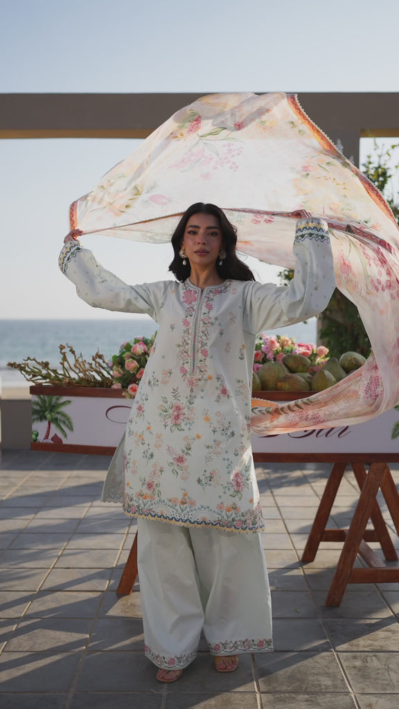 neckline, adding a gentle focal point without overwhelming the look. The sleeves are finished with printed borders in soothing teal and blue tones, bringing subtle contrast and charm. The back is kept plain, allowing the fabric and colour palette to feel clean, breathable, and effortless. Paired with a printed chiffon dupatta, the outfit comes alive with graceful botanical motifs and a soft peach-coral border, adding movement and a light summer feel. The look is completed with a cotton boxy shalwar, finished with subtle embroidery along the edges, offering comfort while maintaining a neat, polished finish. Thoughtfully designed and easy to style, Ira is an unstitched summer essential—perfect for everyday wear, relaxed gatherings, and moments that call for simple, natural elegance.