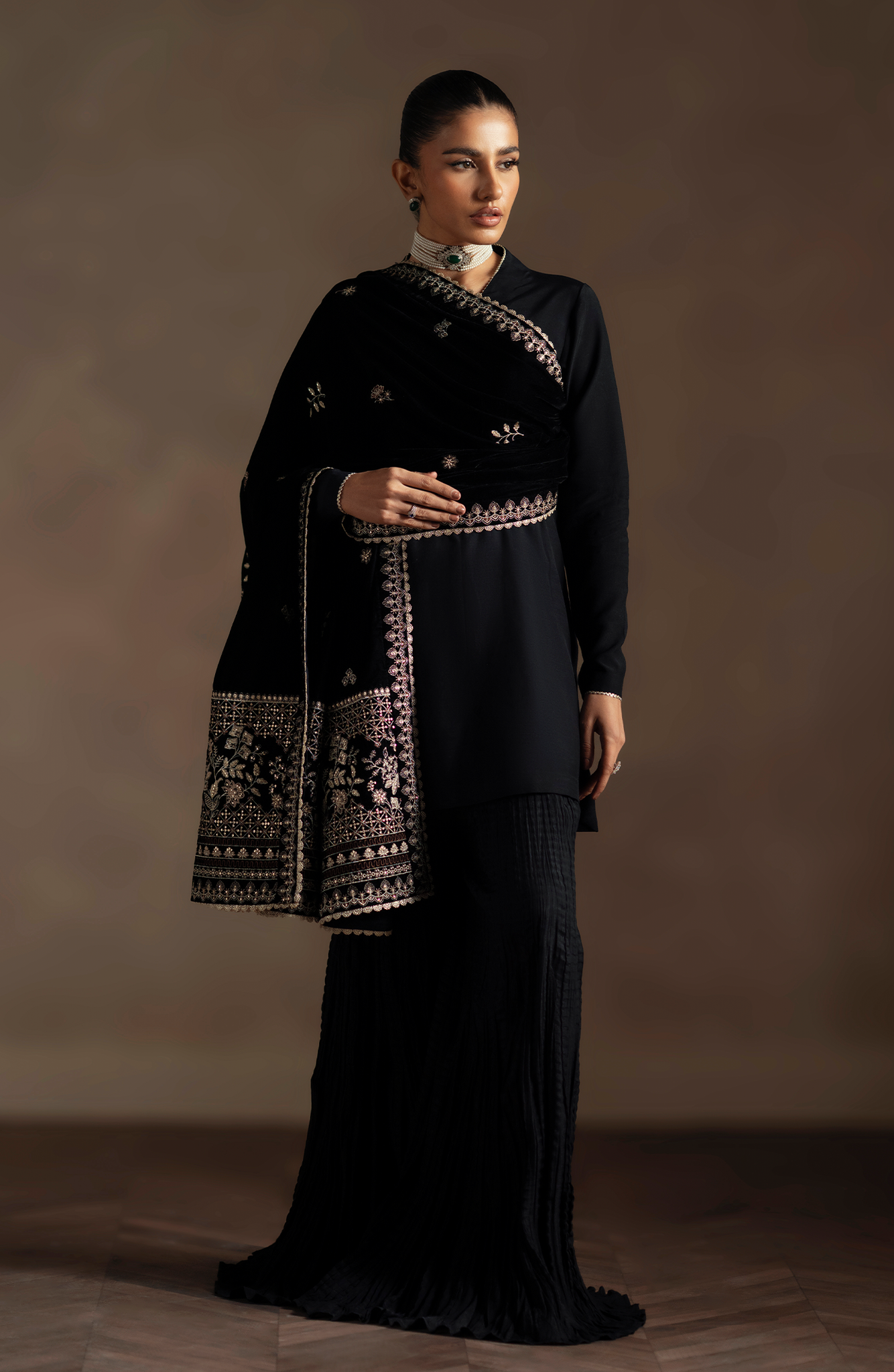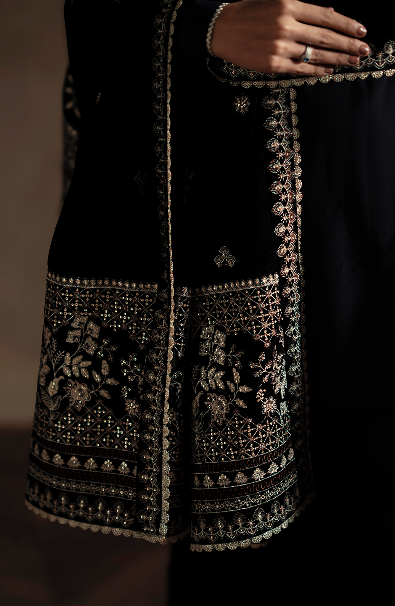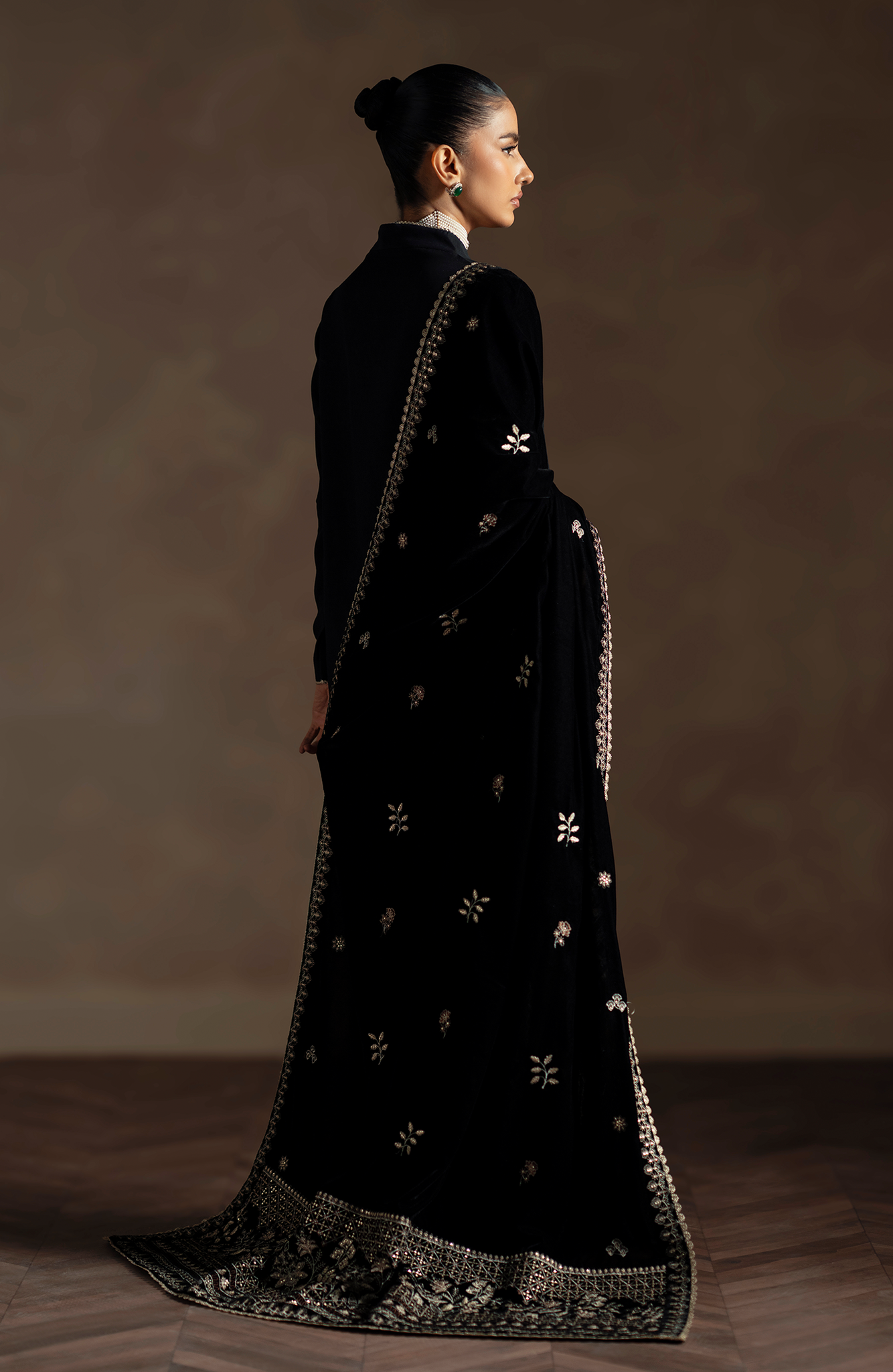 Crafted on a velvet base, Noirelle features a deep jet-black hue highlighted with intricate antique gold and silver embroidery. Delicate scattered motifs add subtle texture, while the richly detailed border showcases refined geometric and floral patterns. The contrast between the velvet and metallic threadwork creates a striking yet elegant statement, making Noirelle an ideal choice for the festive season and formal celebrations.