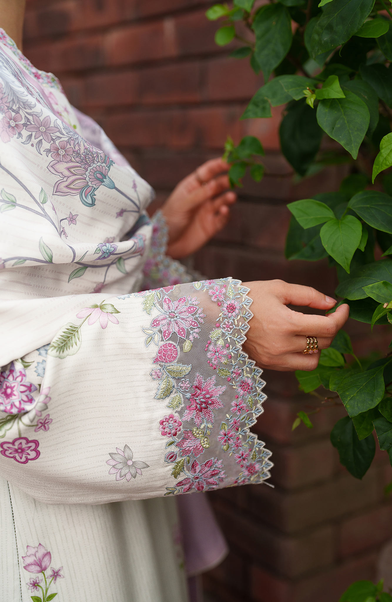 Serelle captures the essence of delicate femininity in soft ivory cottel. The shirt is adorned with fine thread embroidery along the neckline and sleeves, blooming with pastel floral motifs in pink and lilac for a whisper of romantic charm. Paired with a plain trouser and a printed blended shawl enriched with botanical artistry, it reflects refined grace and timeless allure — a perfect ode to understated elegance.