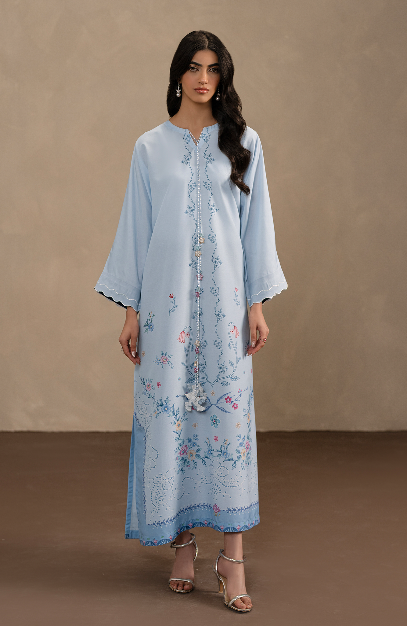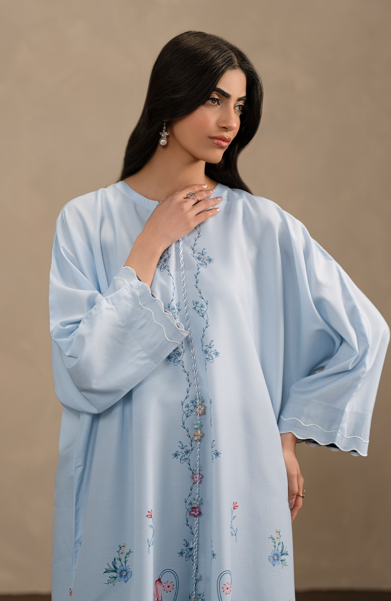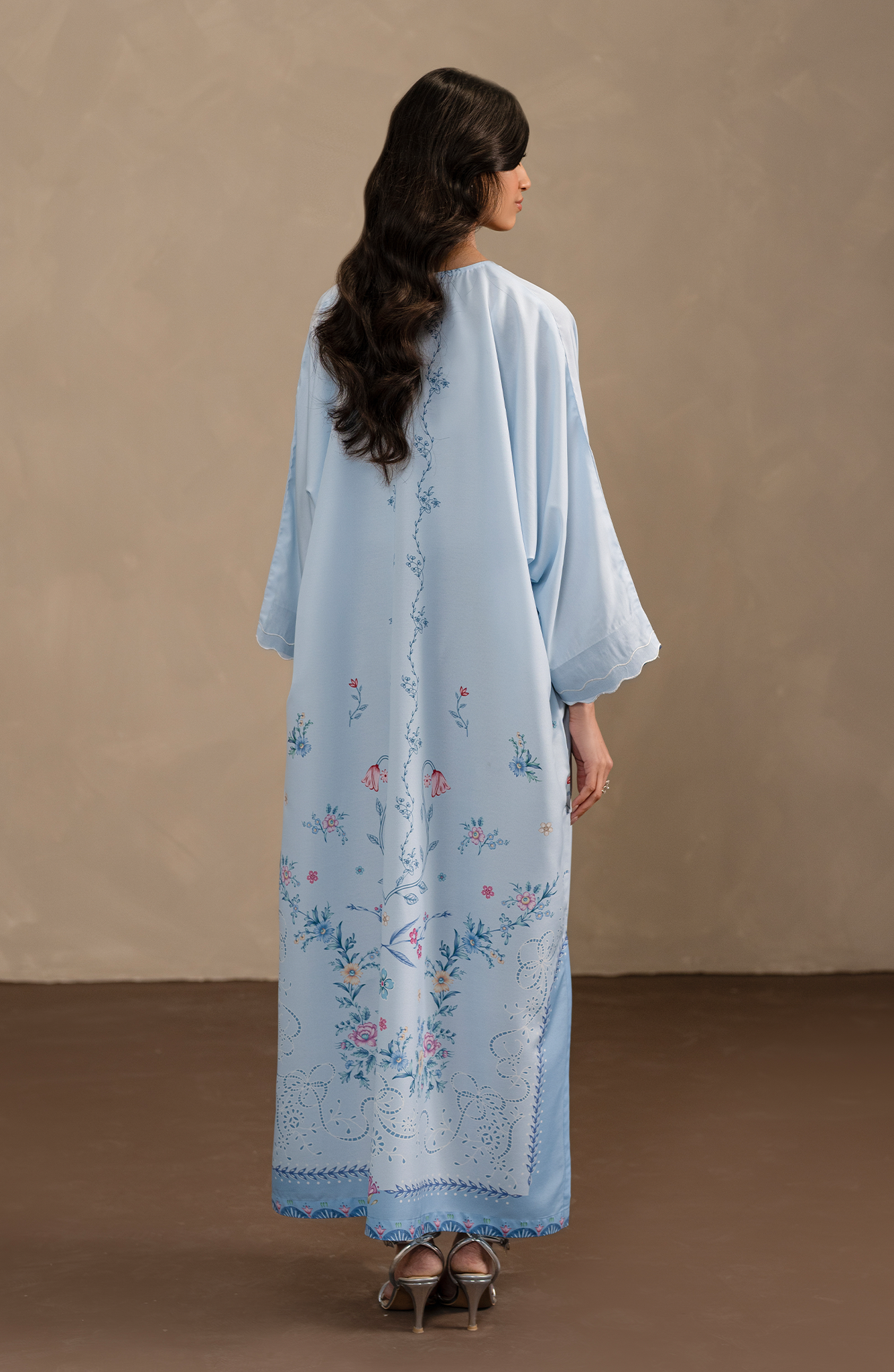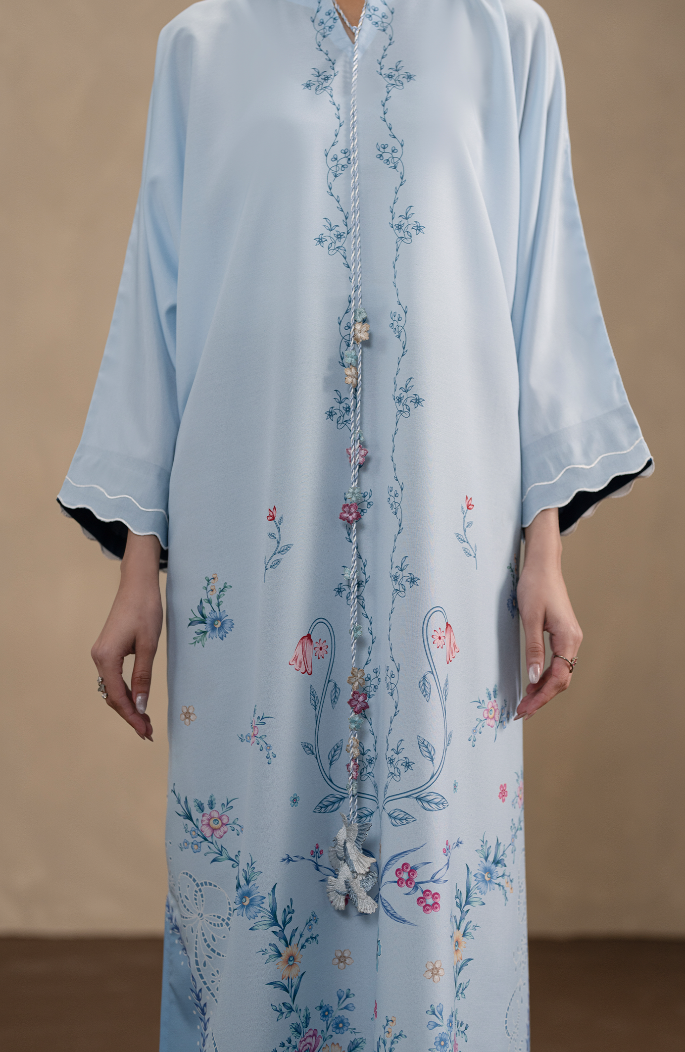 Serena is a fluid kaftan crafted from soft poly cambric, presented in a calming powder blue tone. The kaftan features an all-over delicate floral print in gentle shades of pastels, creating a serene, airy aesthetic. Fine botanical motifs and subtle borders lend it a graceful, garden-inspired charm. The neckline is finished with decorative tassel detailing, adding a soft handcrafted touch to the design. With its relaxed silhouette and soothing palette, Serena evokes effortless elegance and is perfect for everyday wear.