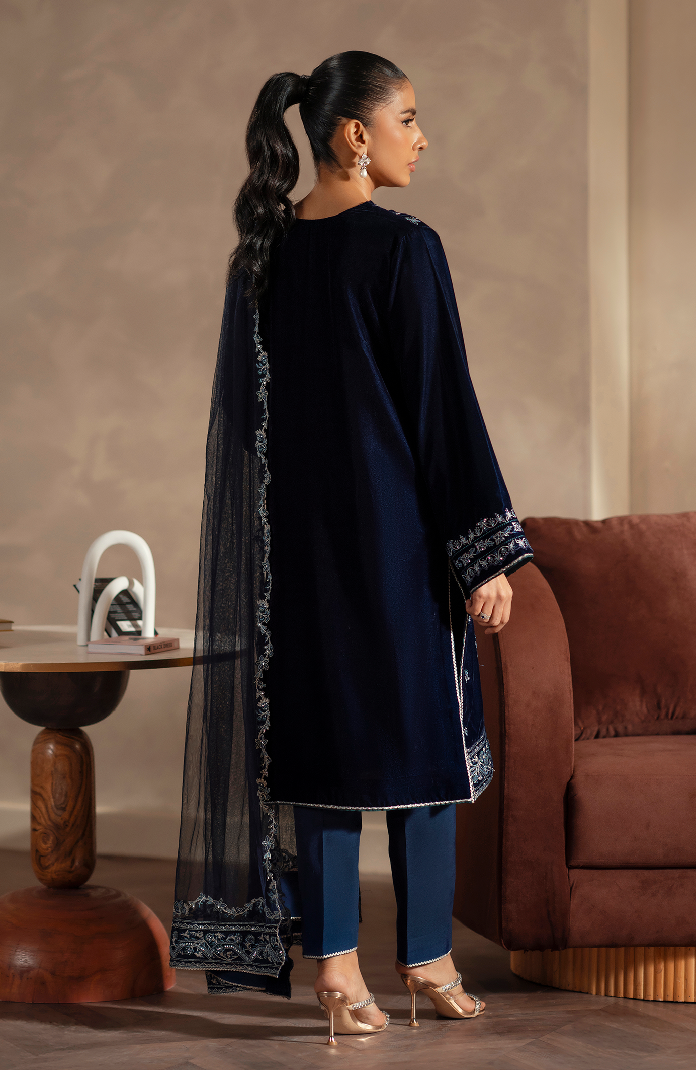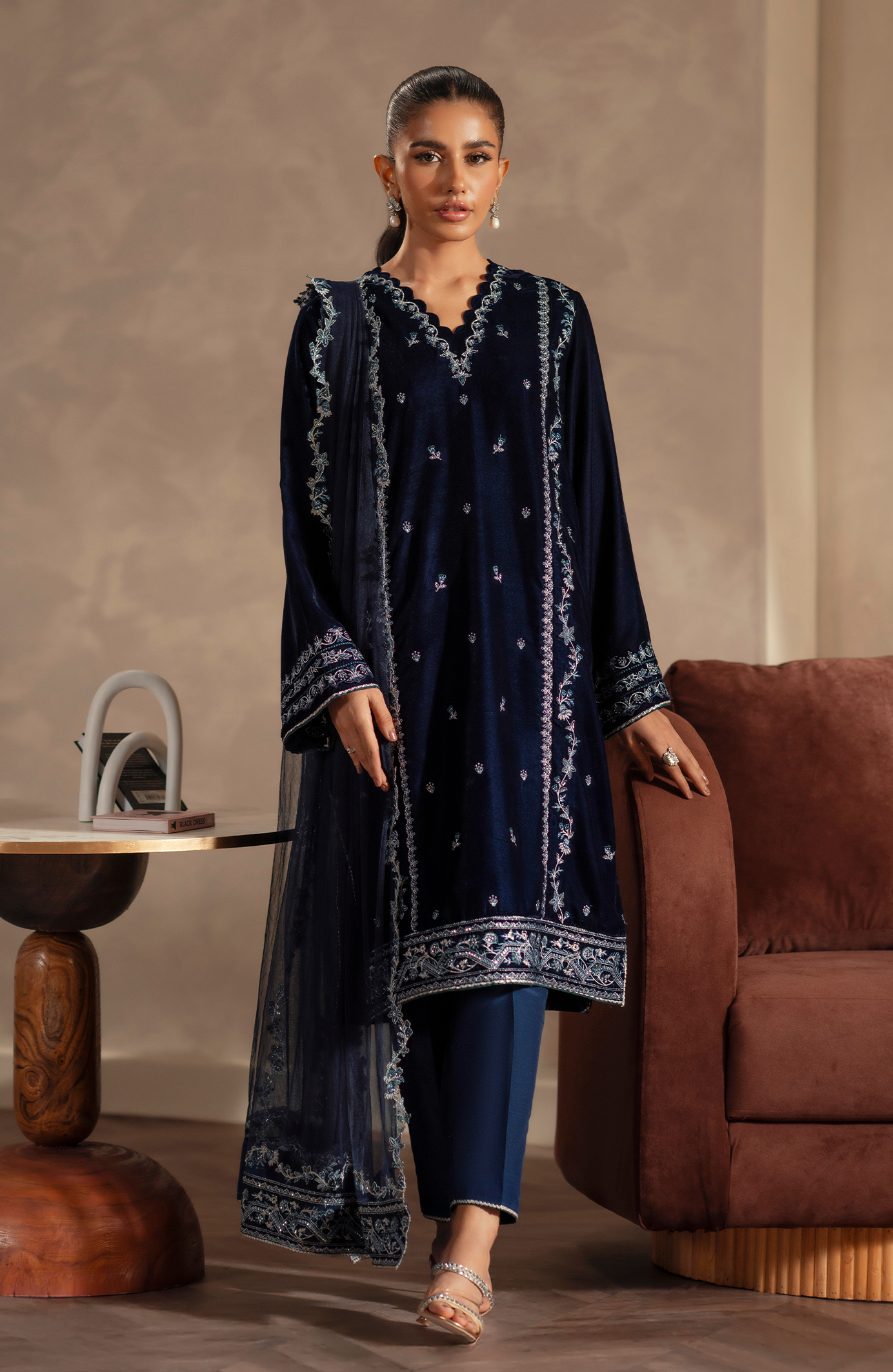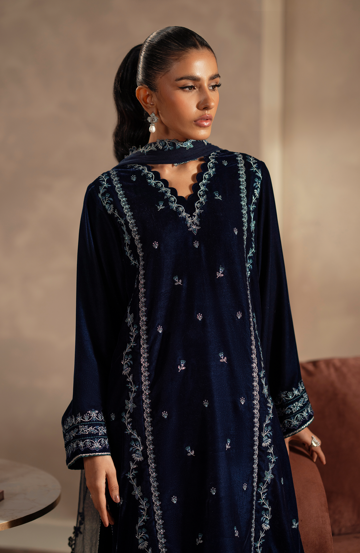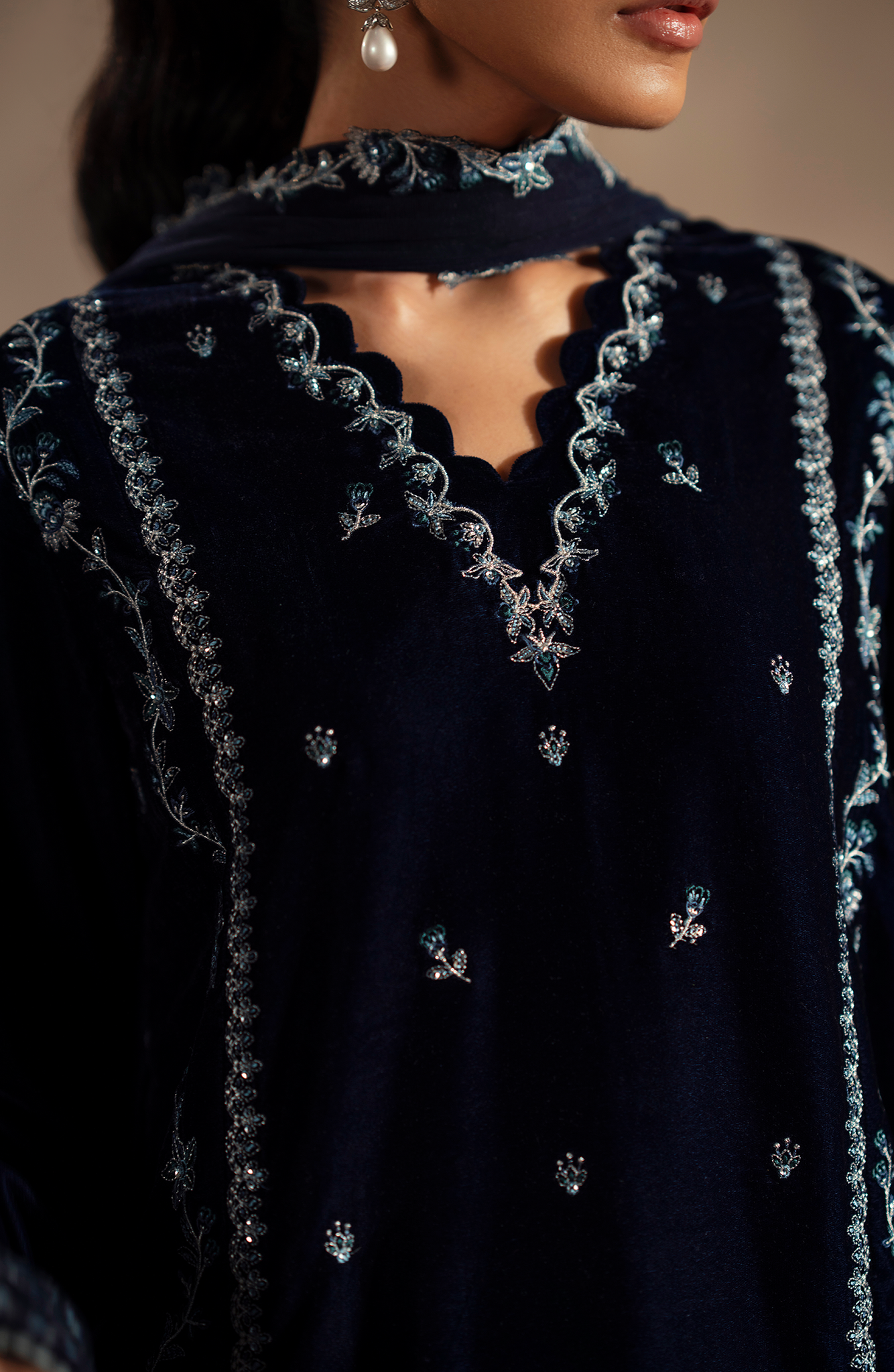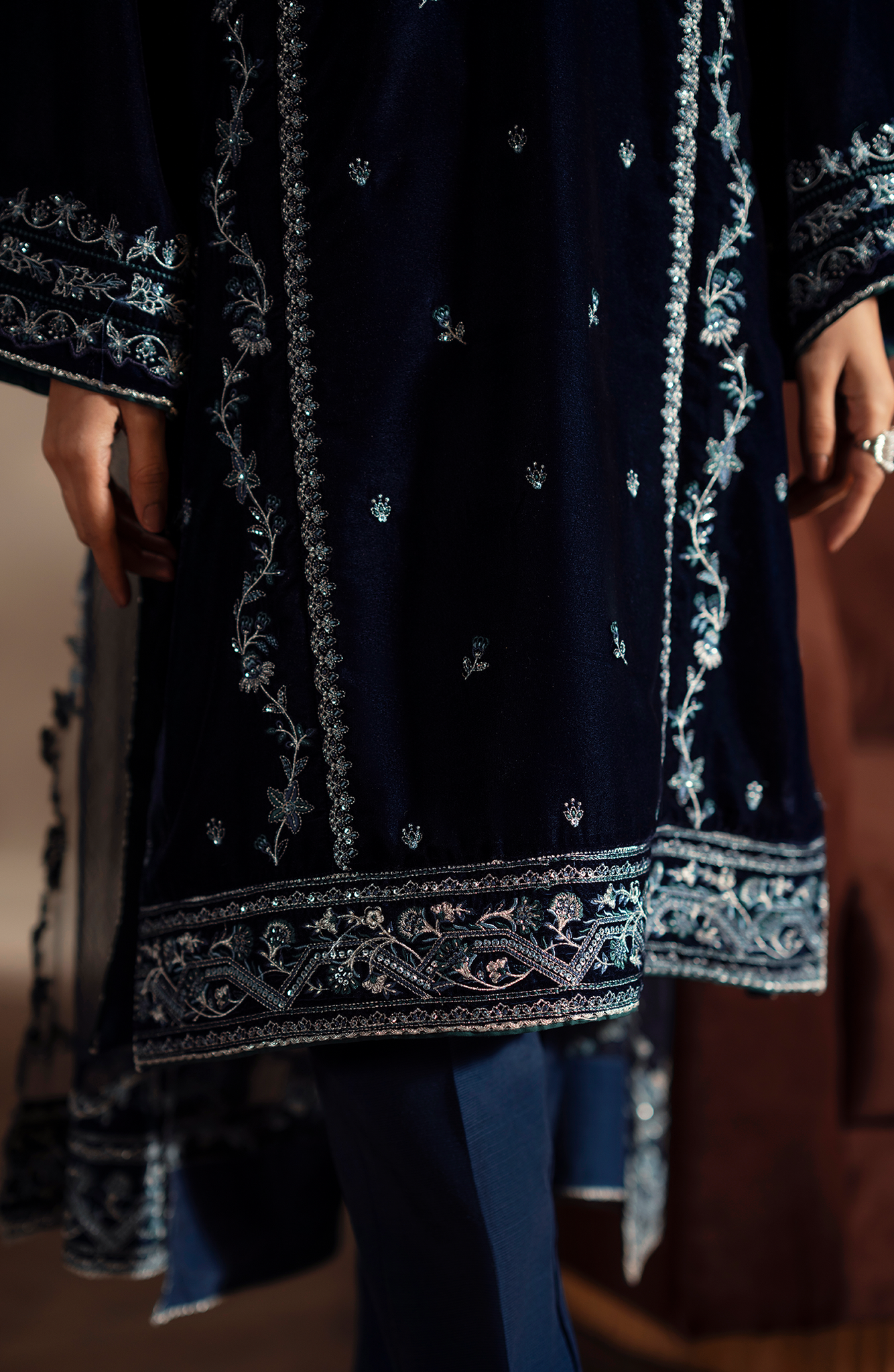 Seryn is a deep midnight-blue velvet ensemble, detailed with delicate all over embroidery in silver and icy blue tones. The shirt features refined floral vines, scalloped neckline embroidery, and embroidered borders along the sleeves and hem, creating a graceful, elongated silhouette. It is paired with a net dupatta, lightly embroidered with fine motifs and finished with a coordinated border for soft movement. The look is completed with plain raw silk trousers, keeping the focus on the richness of the velvet and embroidery. Designed for festive evenings, Seryn embodies quiet elegance and modern sophistication.