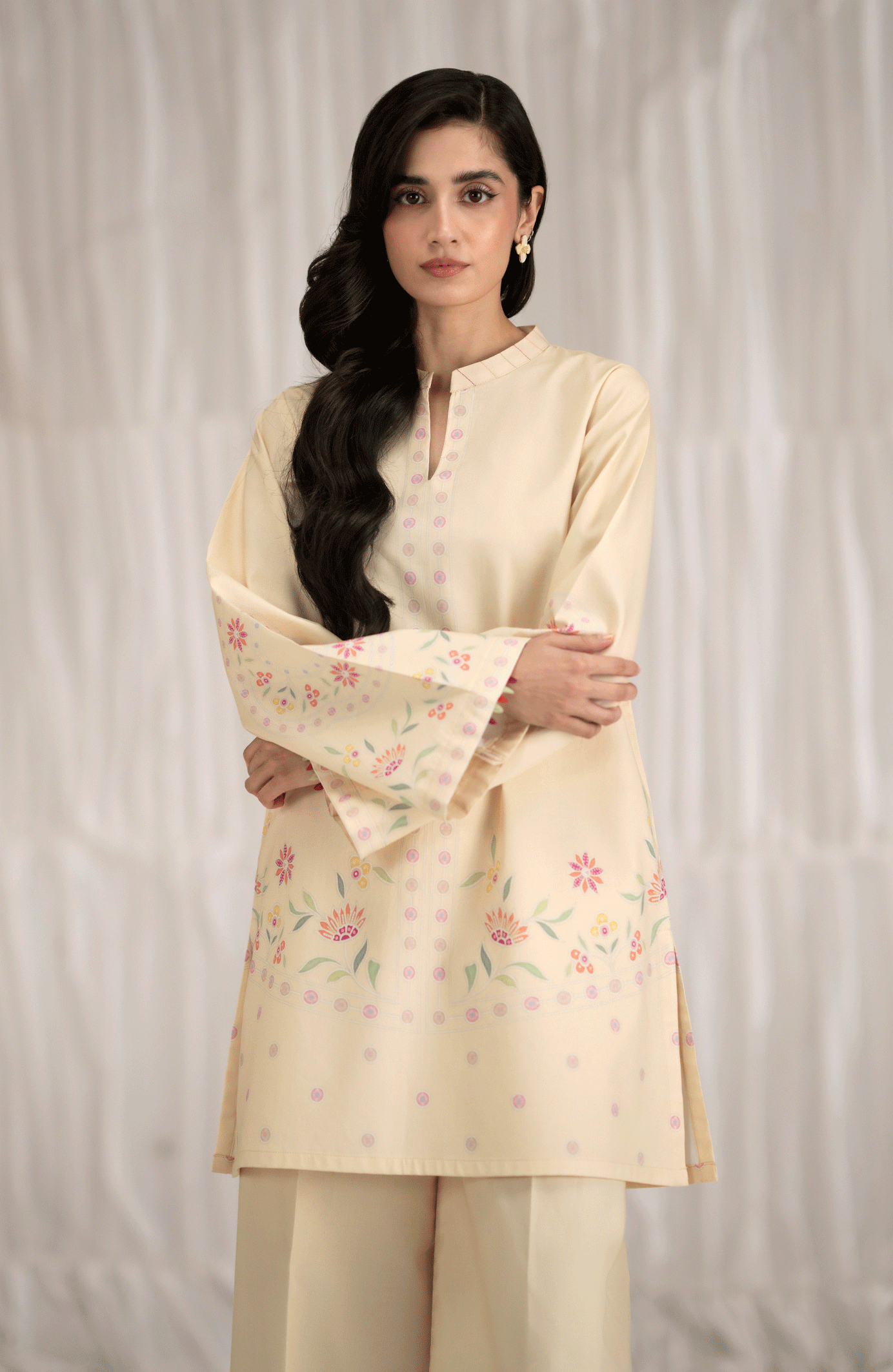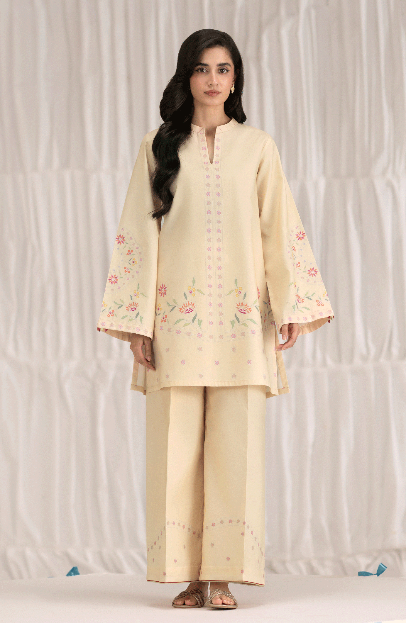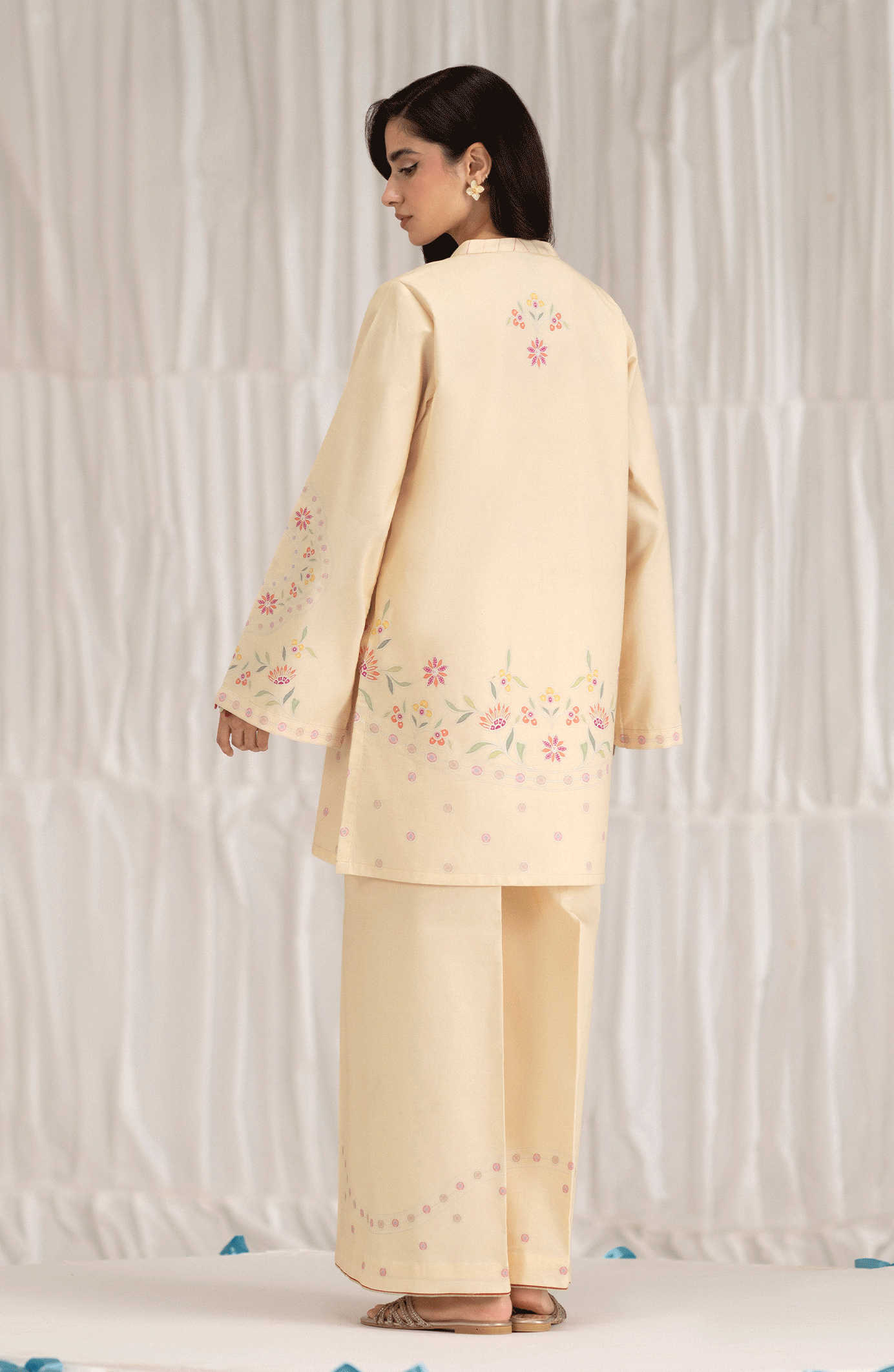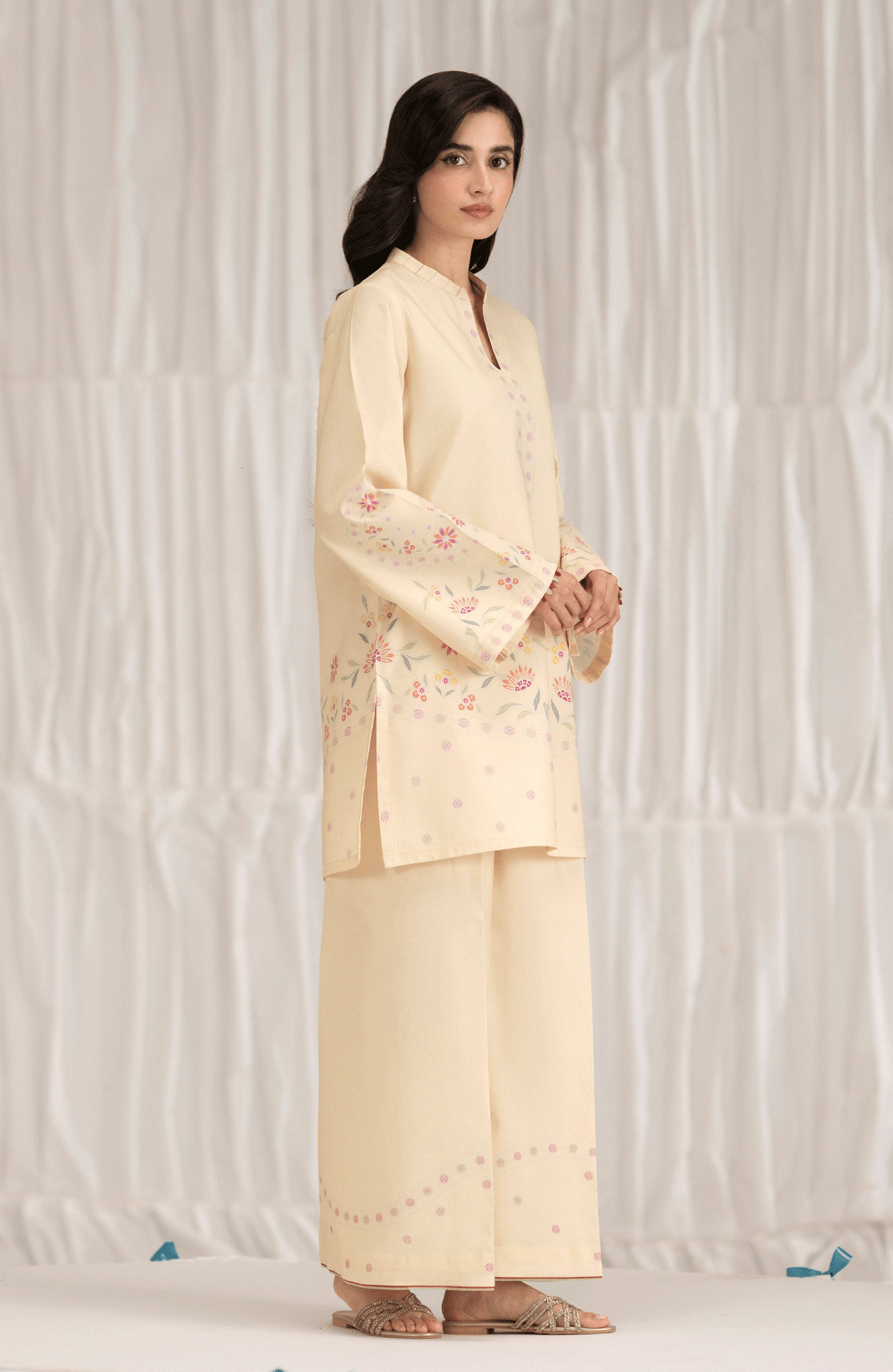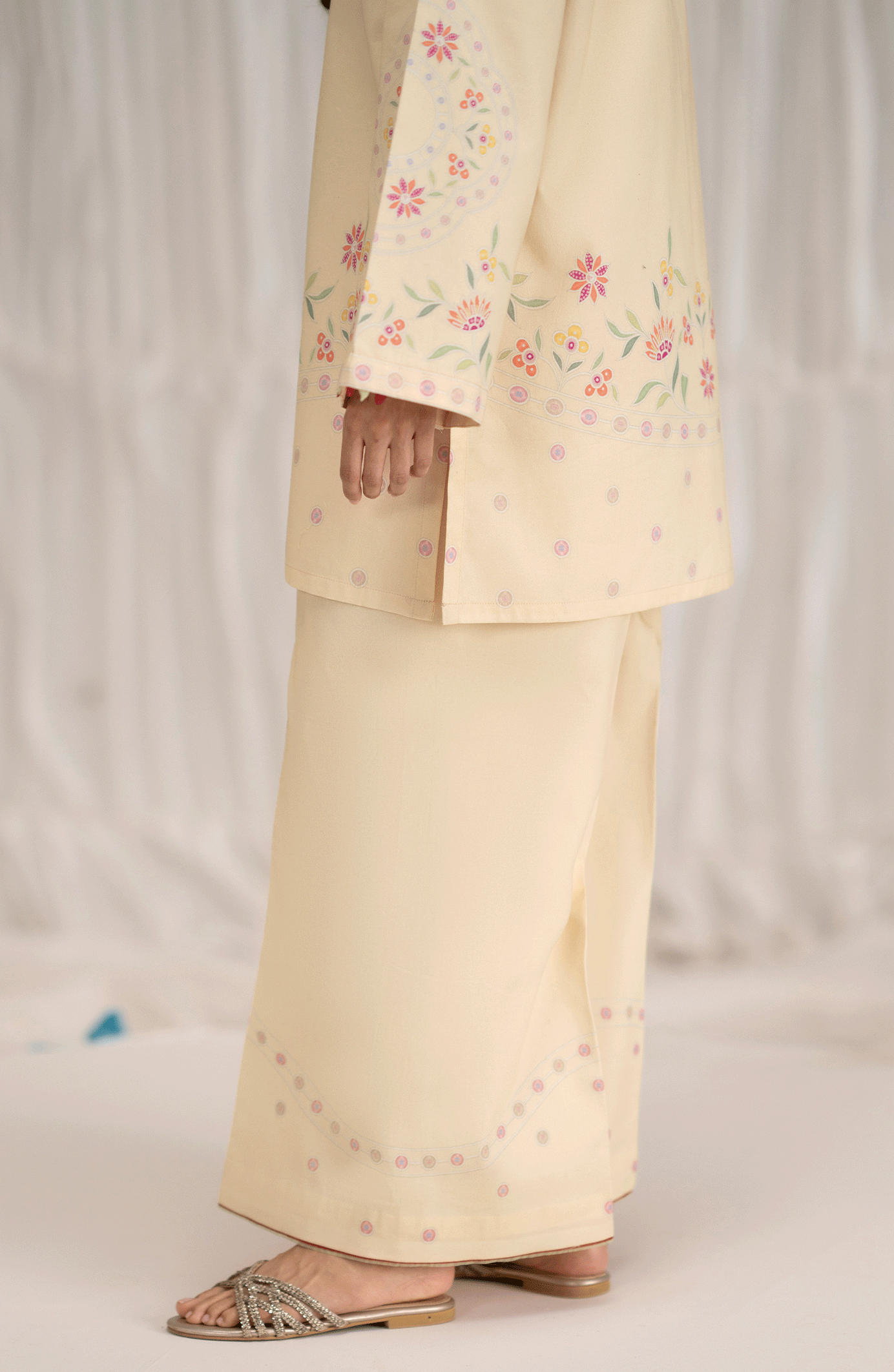 Delicately subtle, Saffira is a buttery yellow cambric ensemble that brings charm to minimal styling. The shirt features delicate floral print in pinks and greens along the sleeves and hem, paired with matching wide-leg trousers adorned with dotted detailing. A breezy, graceful choice for warm, easy-going days.