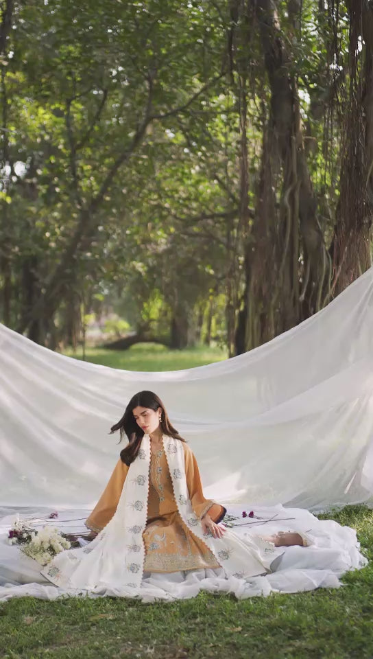 Bathed in burnished amber, Solayne exudes refined opulence with an intricately embroidered front adorned in ivory and soft blue threadwork that cascades gracefully across the shirt and sleeves. The shirt and trouser are crafted from karandi, offering warmth and structure, while the viscose blended embroidered shawl, finished with elegant border detailing, completes the look with radiant charm and winter grace.