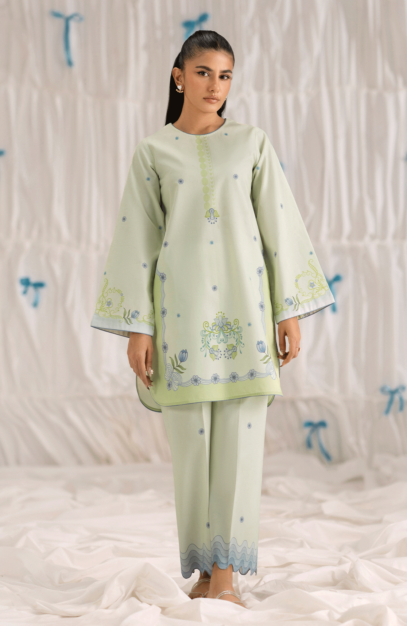 A refreshing take on everyday elegance, Sylphin is a pastel green cambric set detailed with delicate blue and lime-toned embroidery. The shirt features soft floral accents and a clean silhouette, while the trousers stand out with scalloped edges and embroidered borders. A perfect pick for a graceful, understated look.
