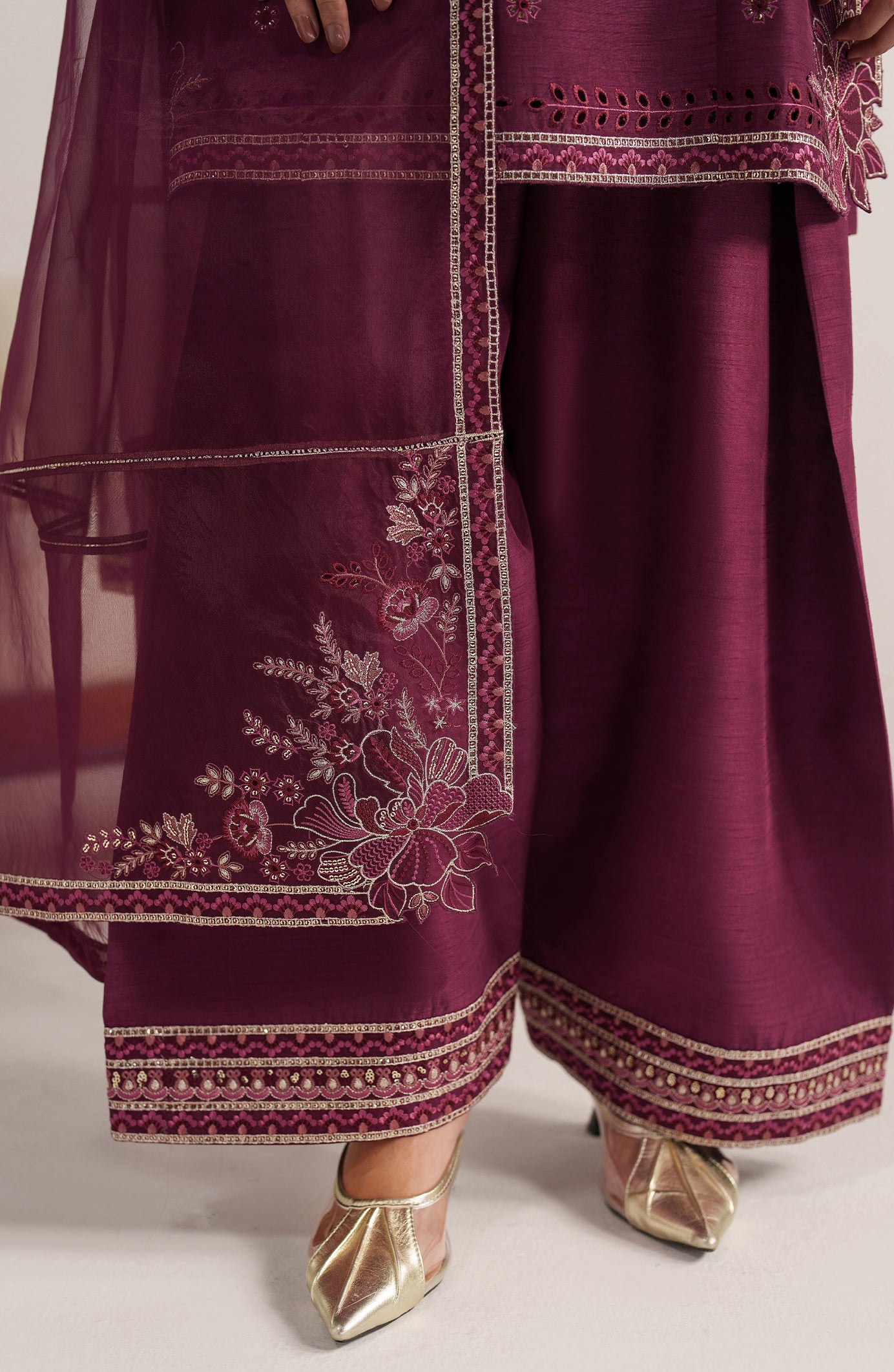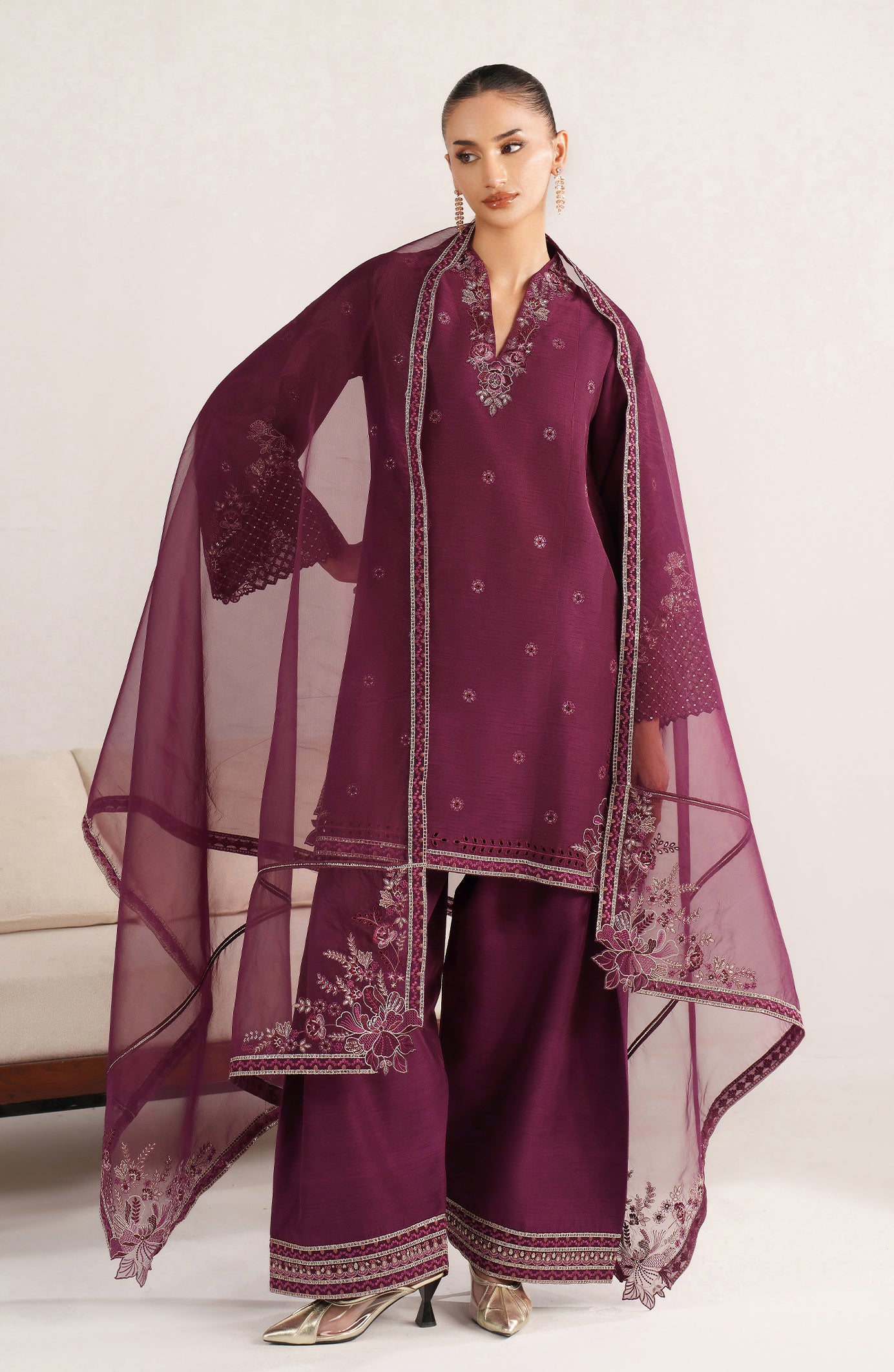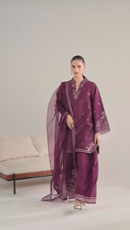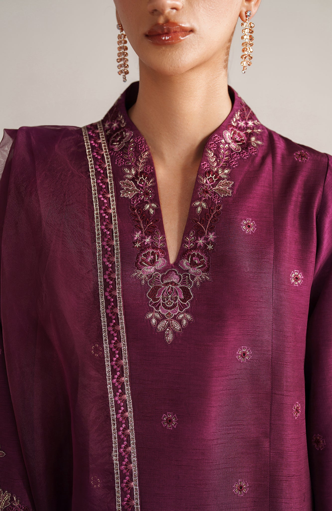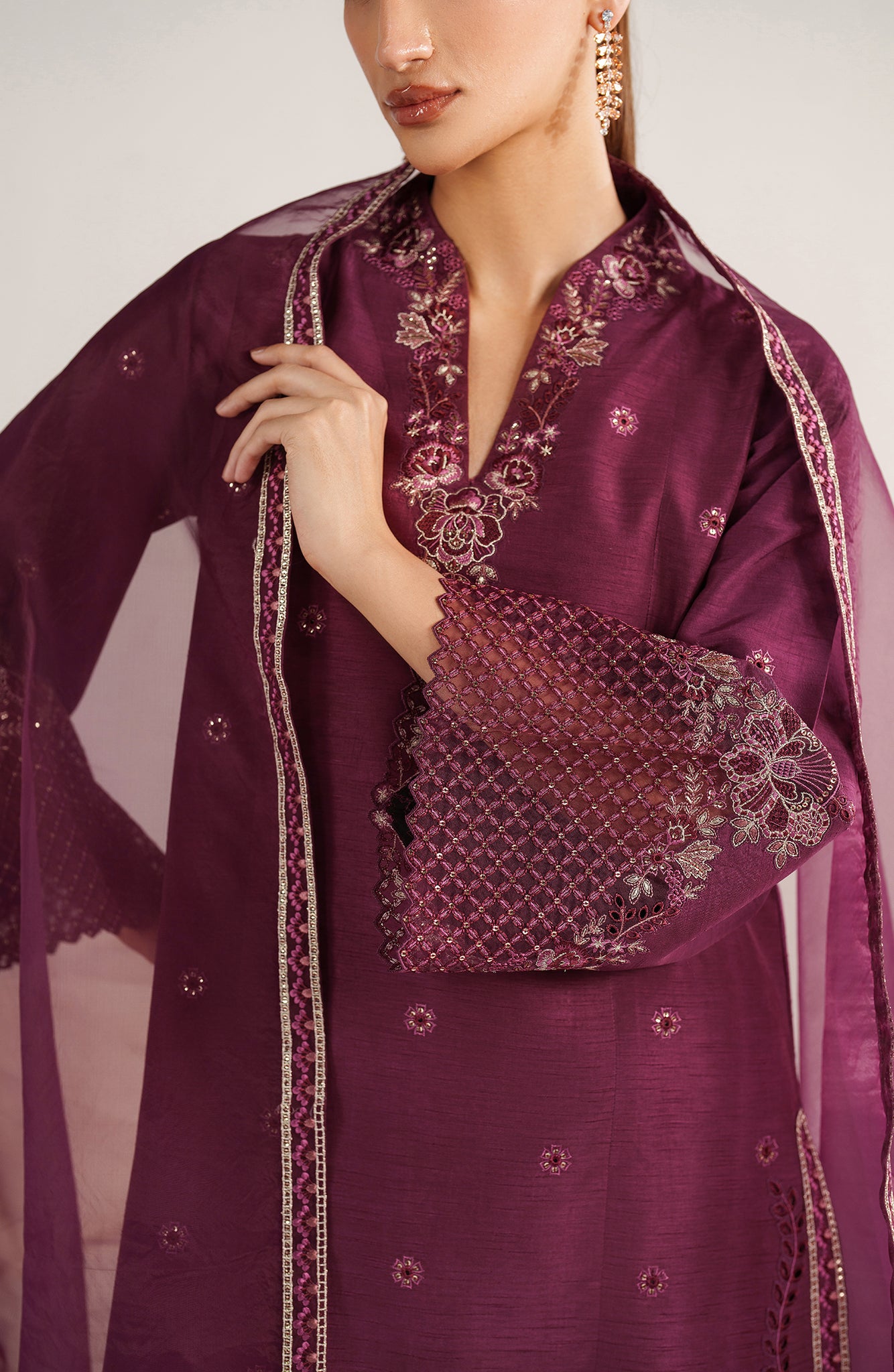 Wrapped in a deep plum hue, Velissea captures timeless luxury through its meticulous craftsmanship. The raw silk shirt and trouser exude rich texture and elegance, adorned with intricate tonal embroidery in hints of mauve and silver that glimmer softly under light. The organza dupatta, delicately embroidered along its borders and sprinkled with refined motifs, adds a layer of sheer grace. Each detail from the scalloped sleeve edges to the embroidered trouser hem reflects quiet sophistication and regal winter charm.