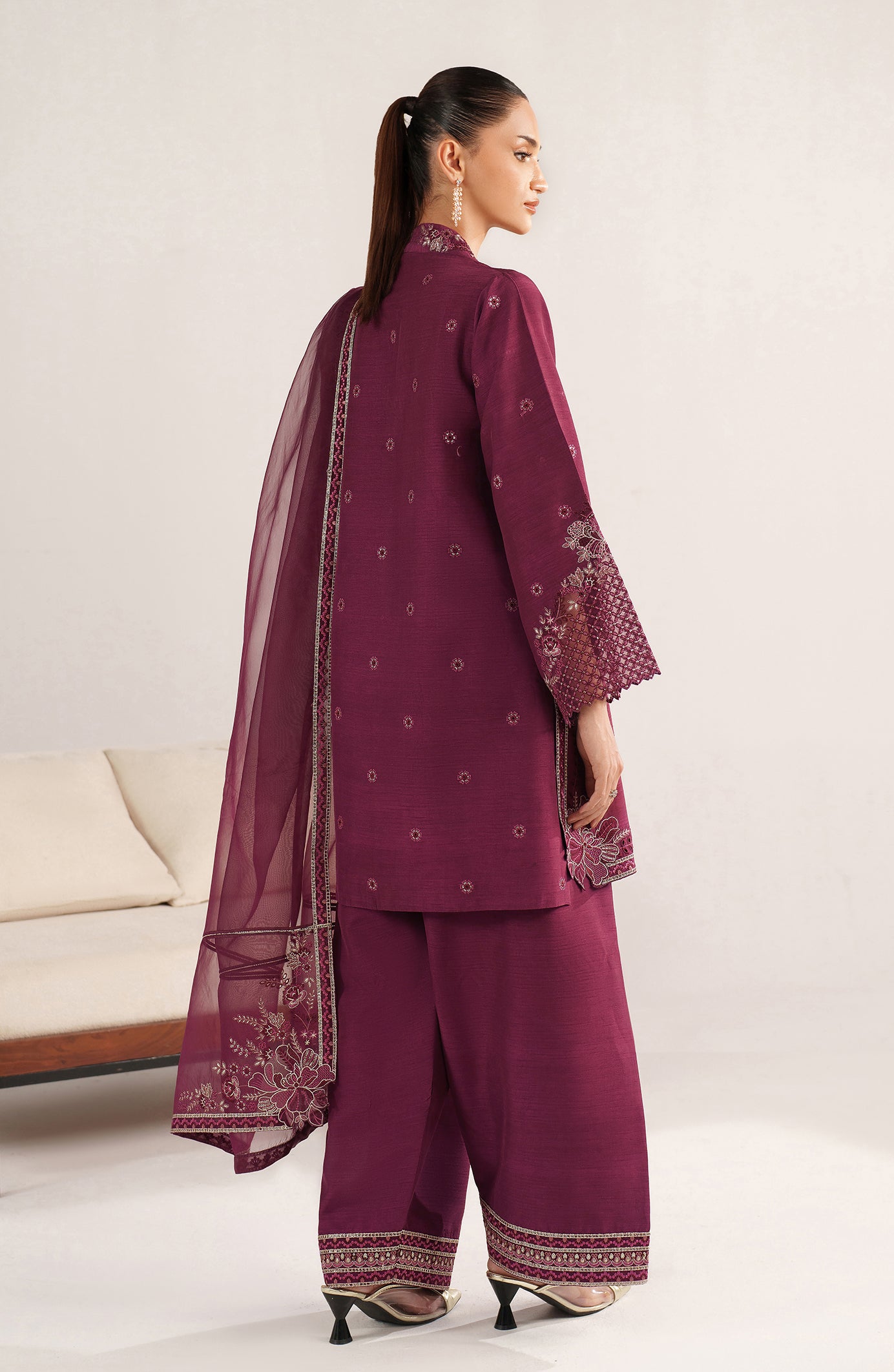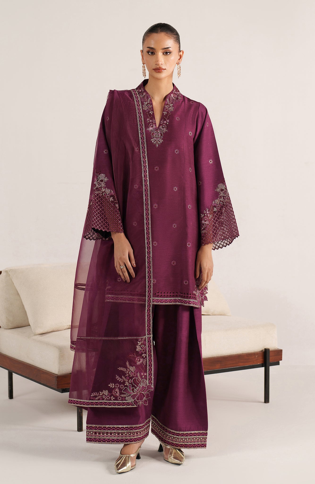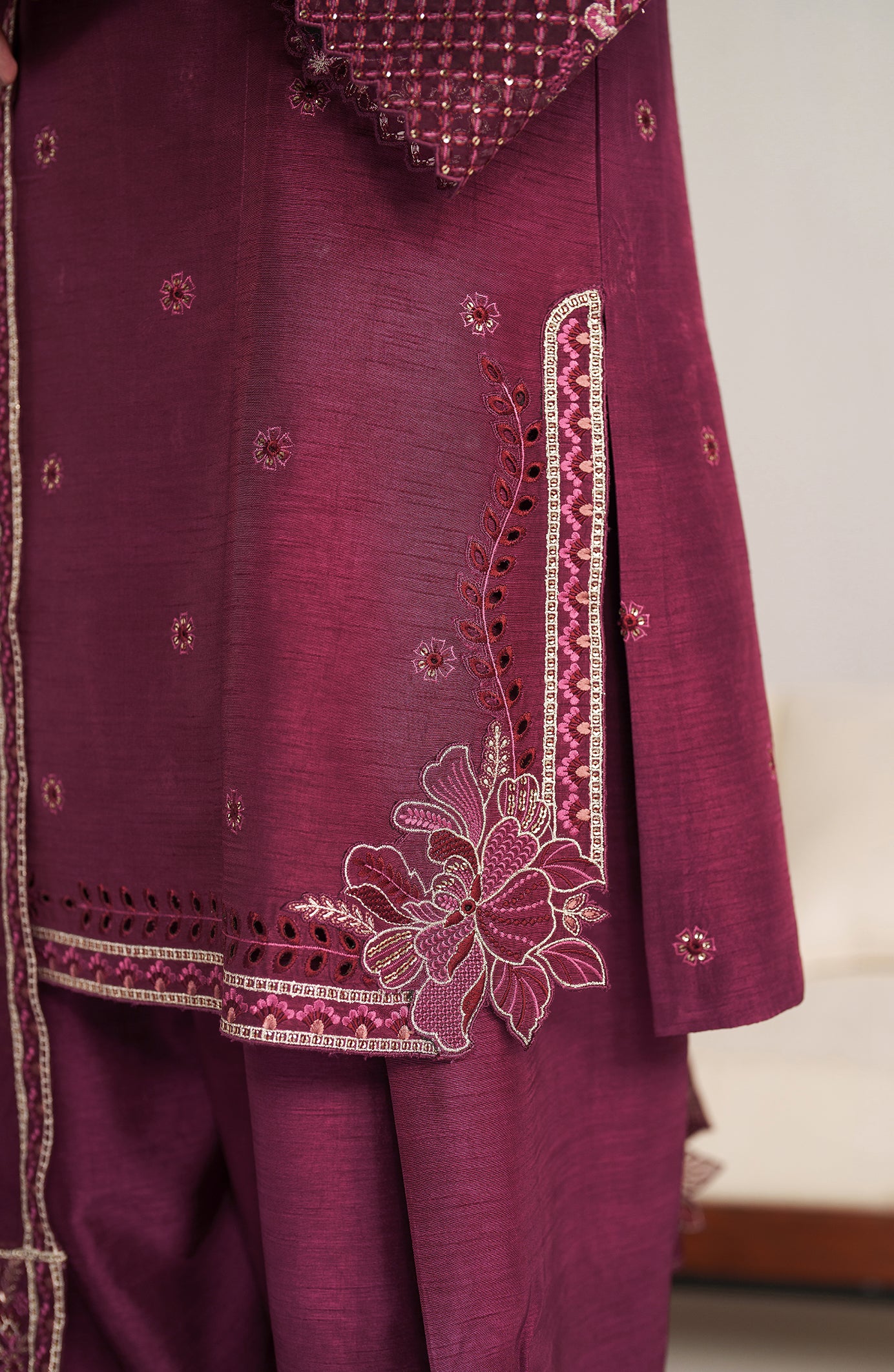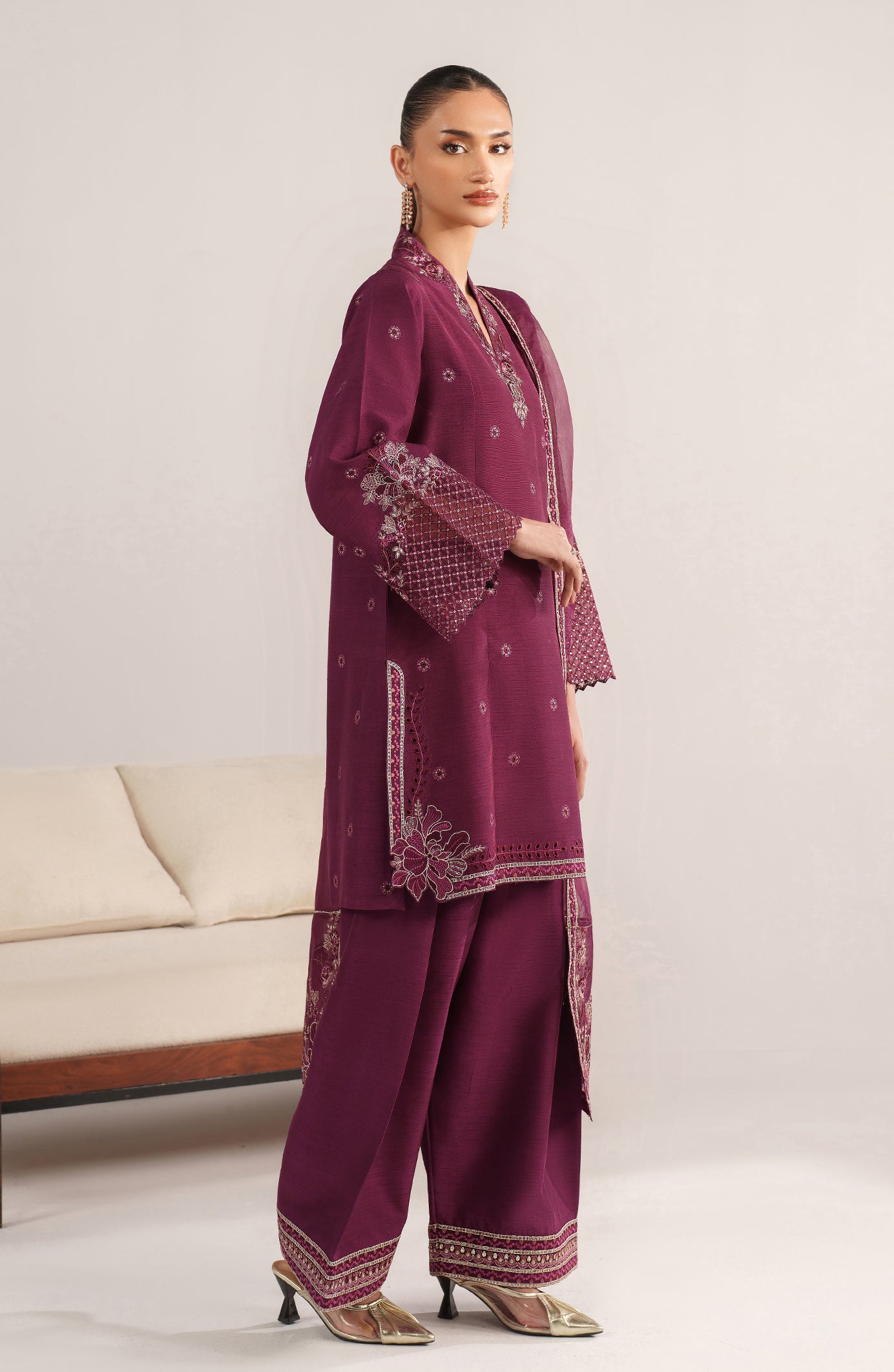 Wrapped in a deep plum hue, Velissea captures timeless luxury through its meticulous craftsmanship. The raw silk shirt and trouser exude rich texture and elegance, adorned with intricate tonal embroidery in hints of mauve and silver that glimmer softly under light. The organza dupatta, delicately embroidered along its borders and sprinkled with refined motifs, adds a layer of sheer grace. Each detail from the scalloped sleeve edges to the embroidered trouser hem reflects quiet sophistication and regal winter charm.