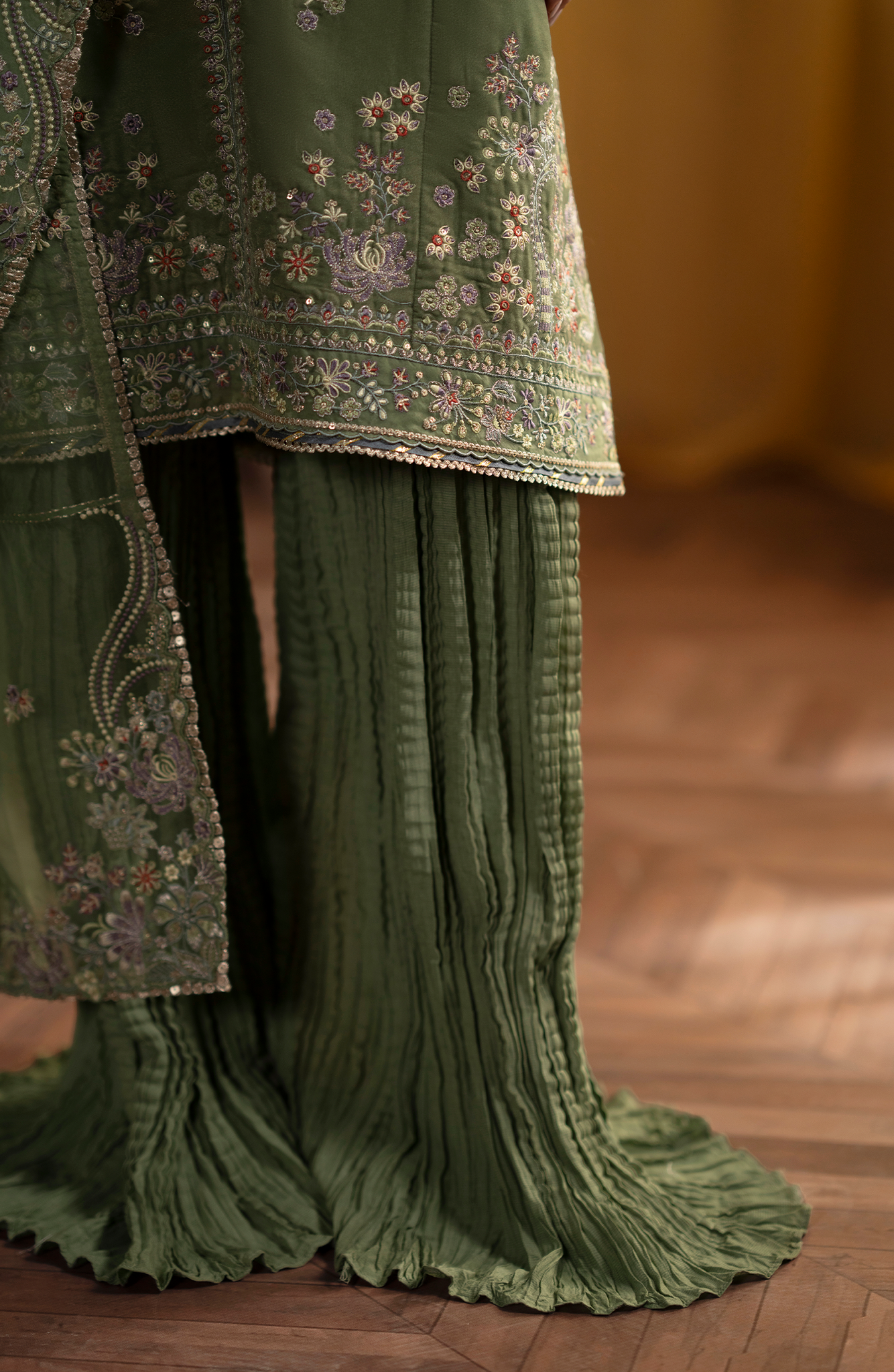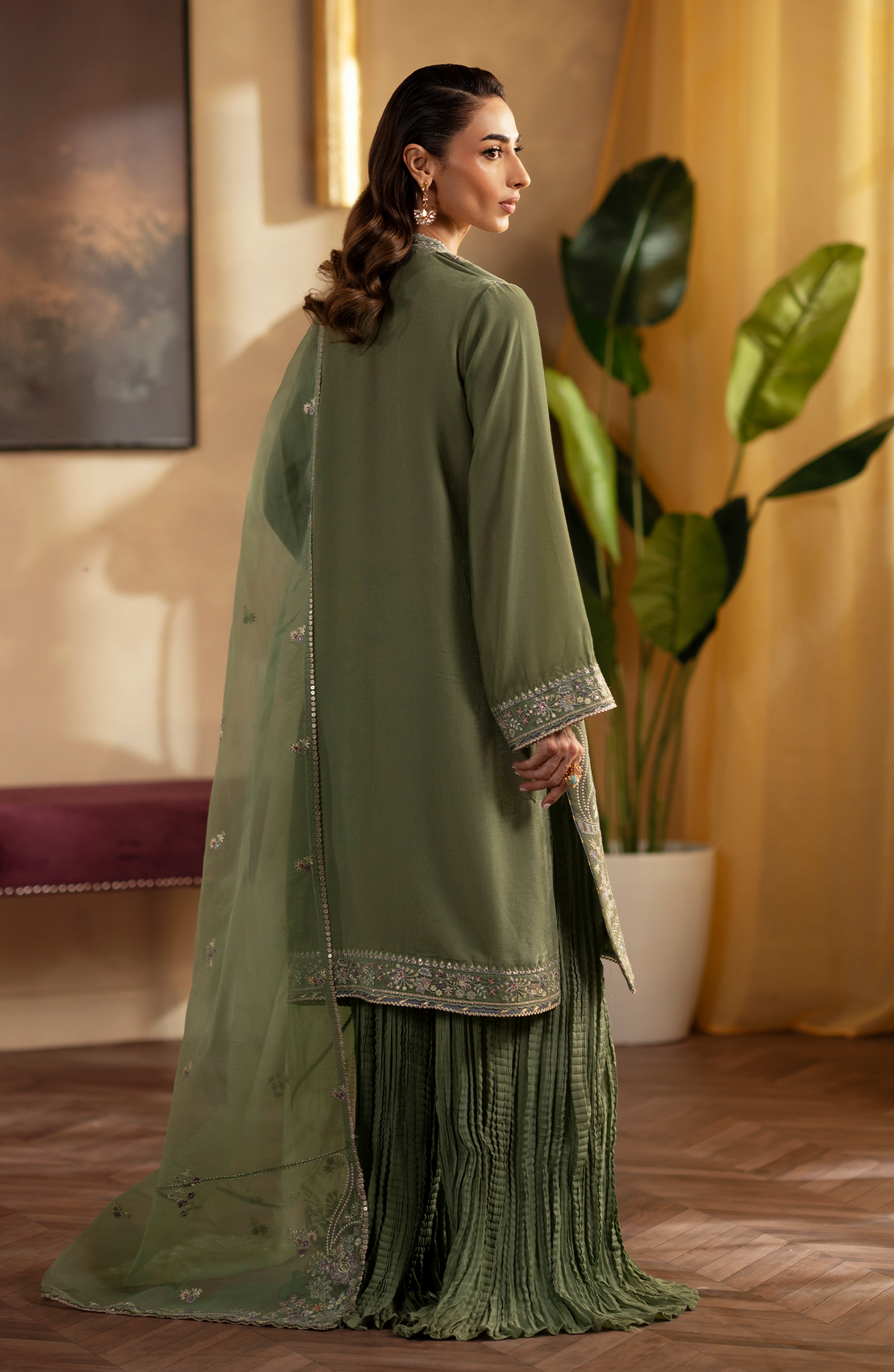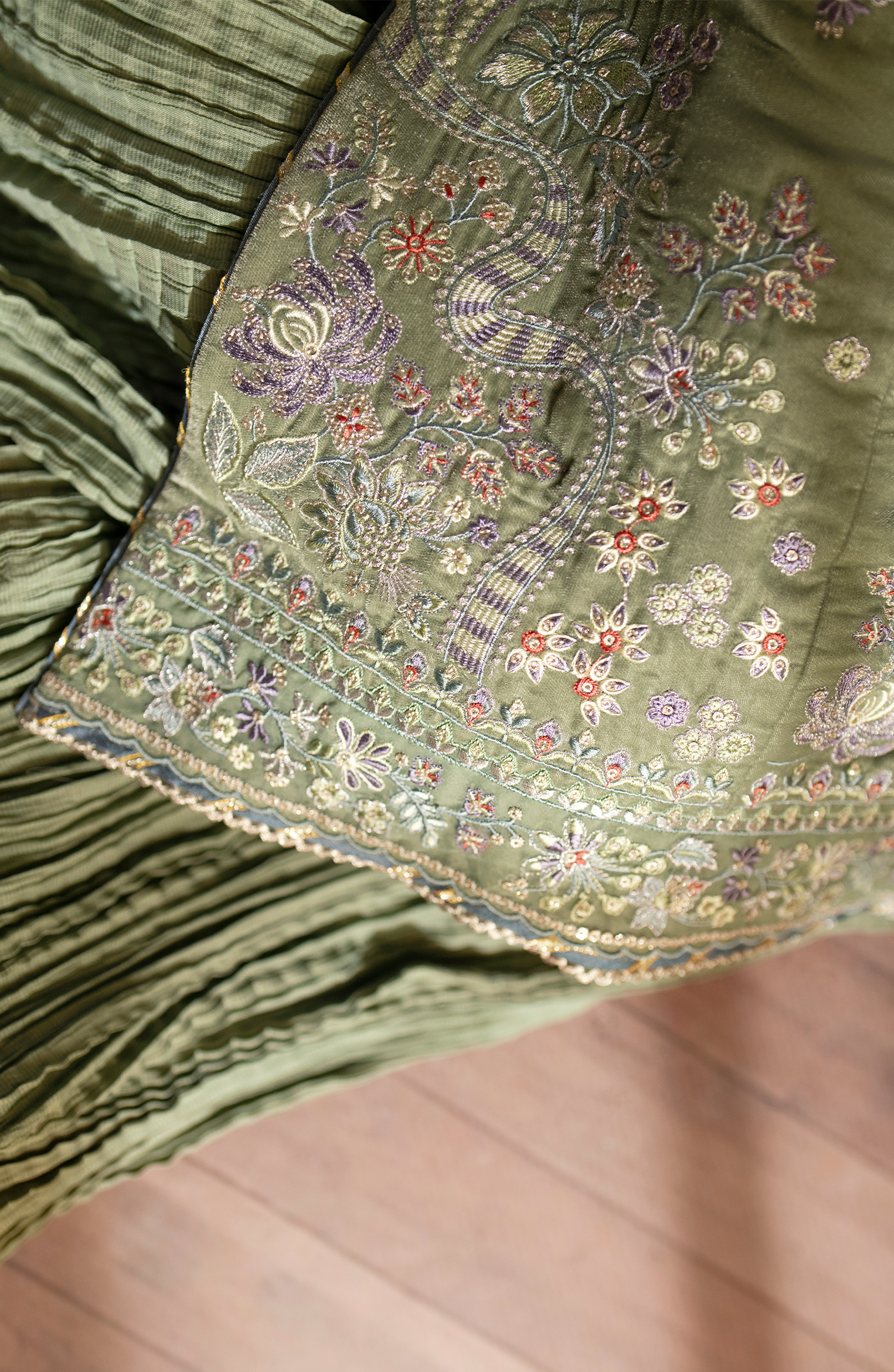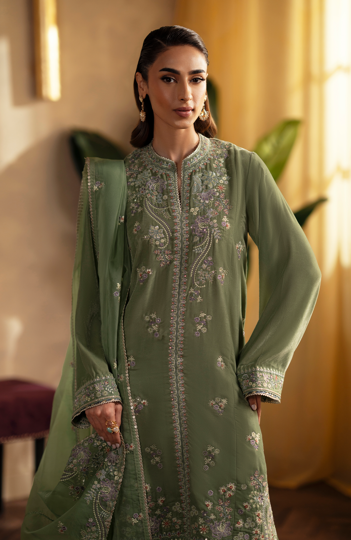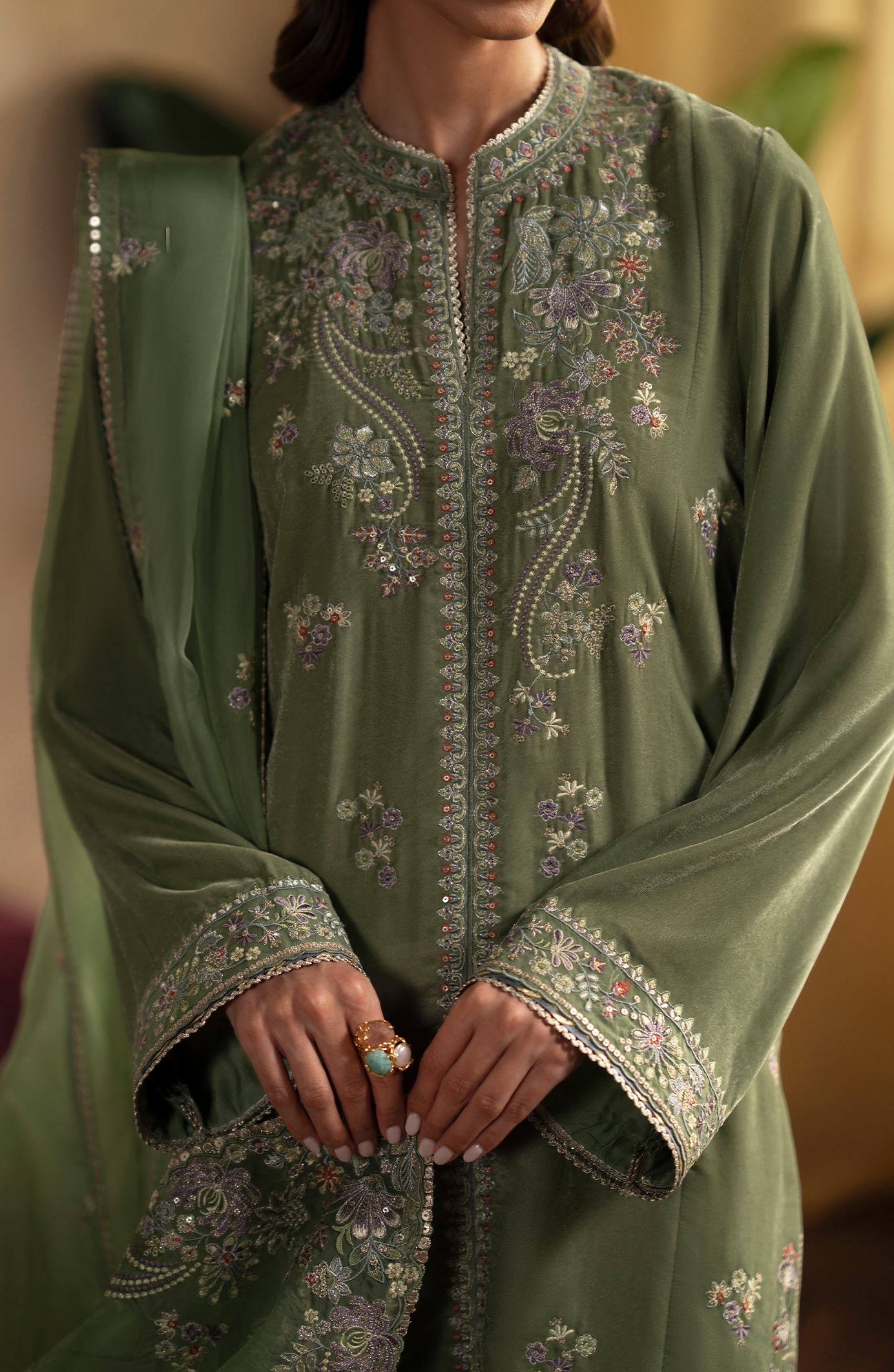 delicately embroidered hem for added refinement. A lightweight organza dupatta with subtle motifs and a finely detailed border softens the look, while raw silk trousers lend graceful movement. Velmyra embodies harmony, craftsmanship, and composed festive elegance.